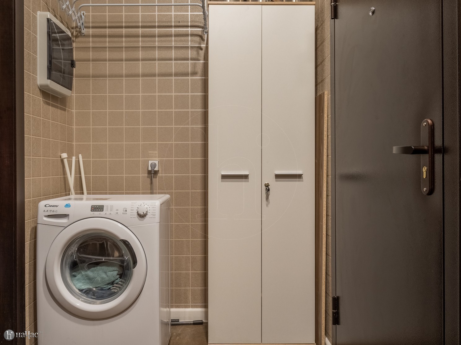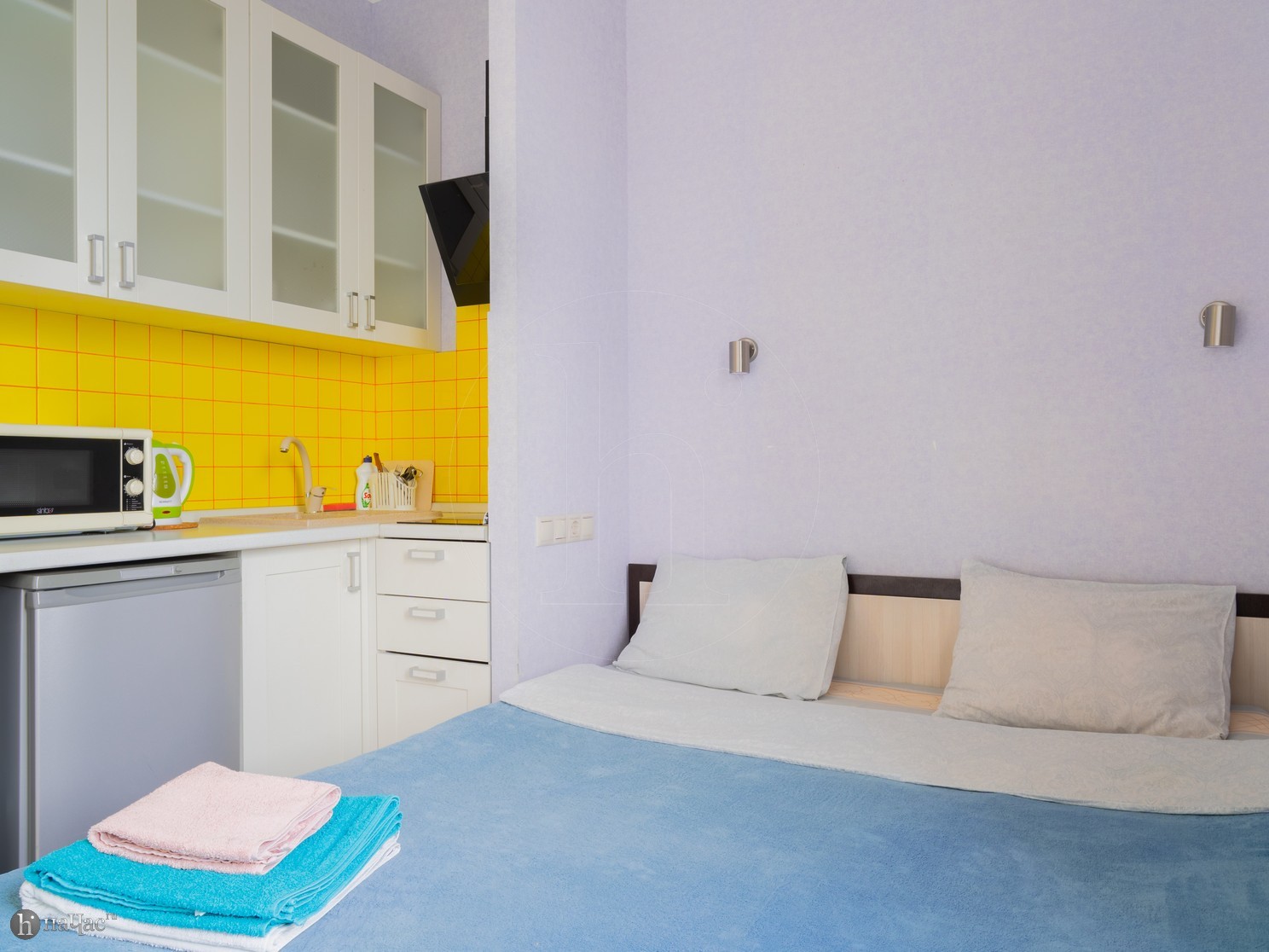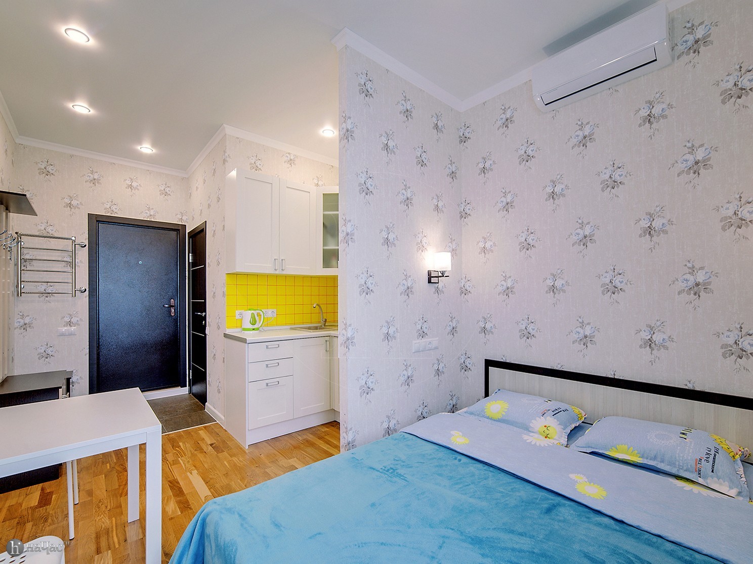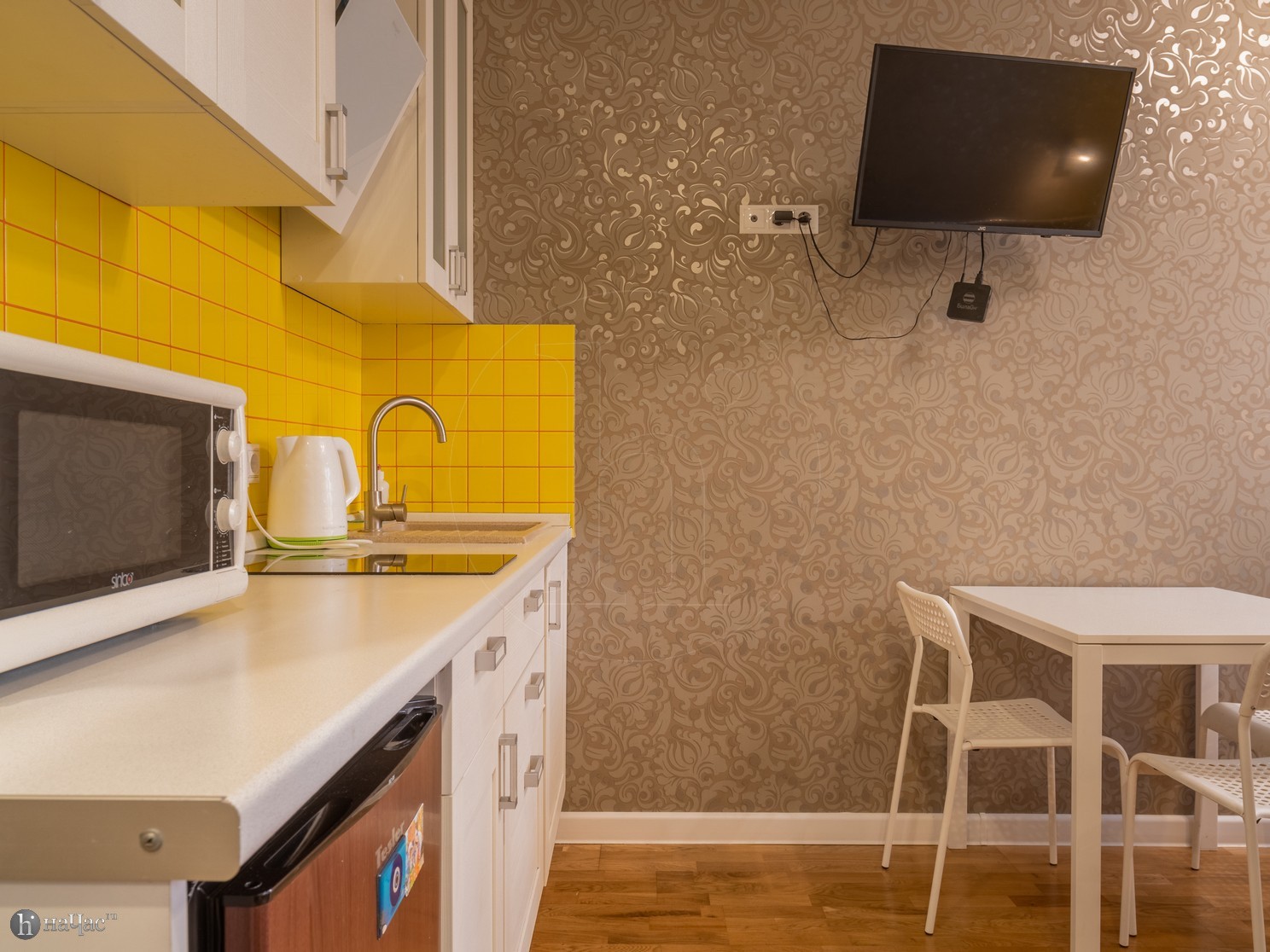 В самой квартире вас ждет уют и функциональность. Здесь есть удобная двуспальная кровать для вашего отдыха. Wi-Fi и телевизор обеспечат развлечение и связь. На кухне вы найдете все необходимое: чайник, холодильник, микроволновая печь. В апартаментах имеется стиральная машина, утюг, фен — все для вашего комфорта.
