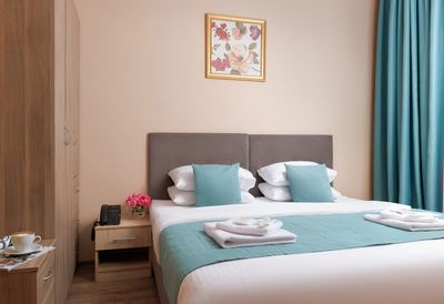 В двухместных номерах с разным цветовым и дизайнерским решением удастся отдохнуть тихо и умиротворенно. Все комнаты оборудованы двуспальными кроватями, вешалками для белья, кондиционерами, чтобы в любую погоду вам было комфортно. В некоторых из них есть дополнительная зона отдыха с диваном. В номерах есть Wi-Fi, цифровое телевидение и отдельный санузел с современной сантехникой и косметическими принадлежностями. Постельное белье всегда свежее, чистое и входит в стоимость проживания.