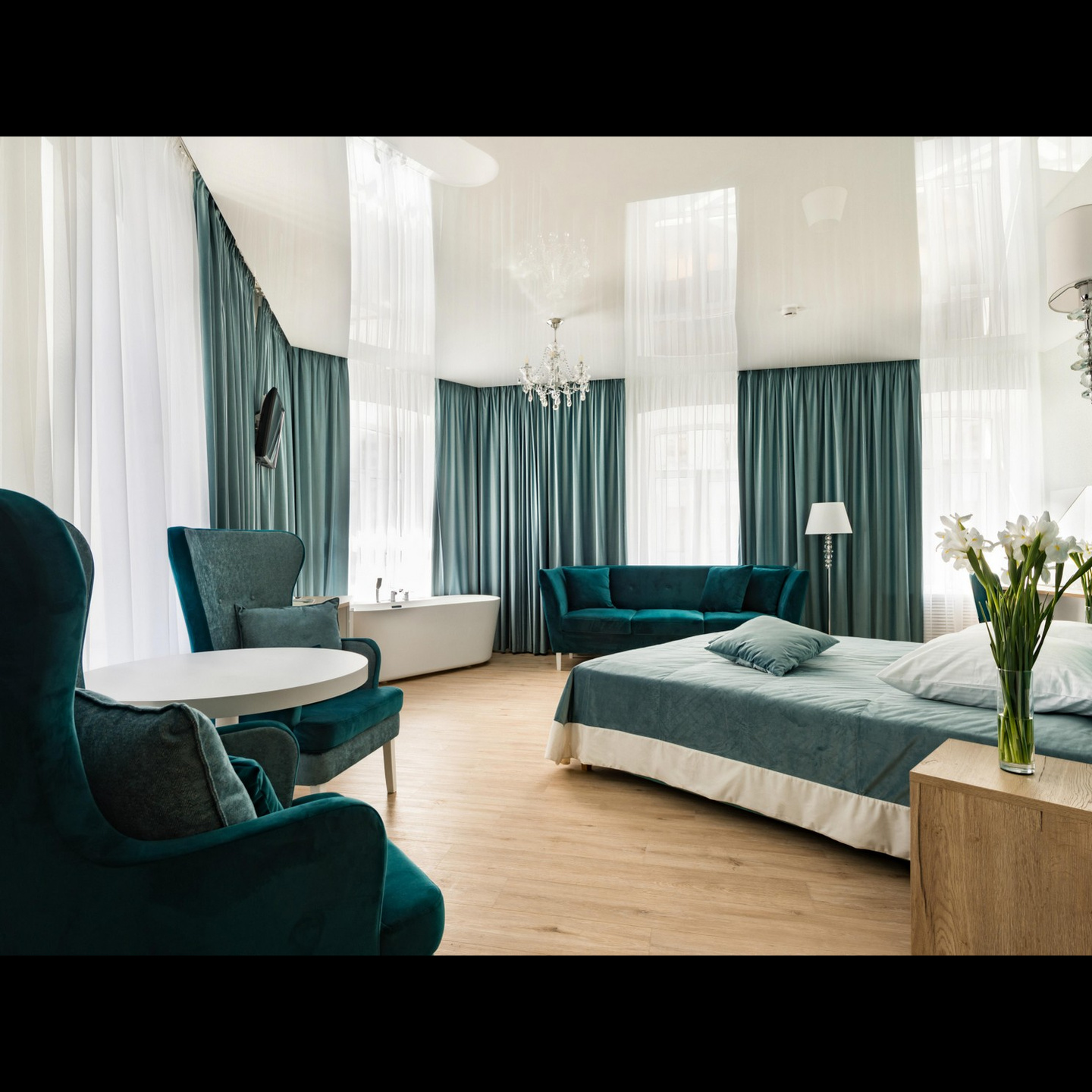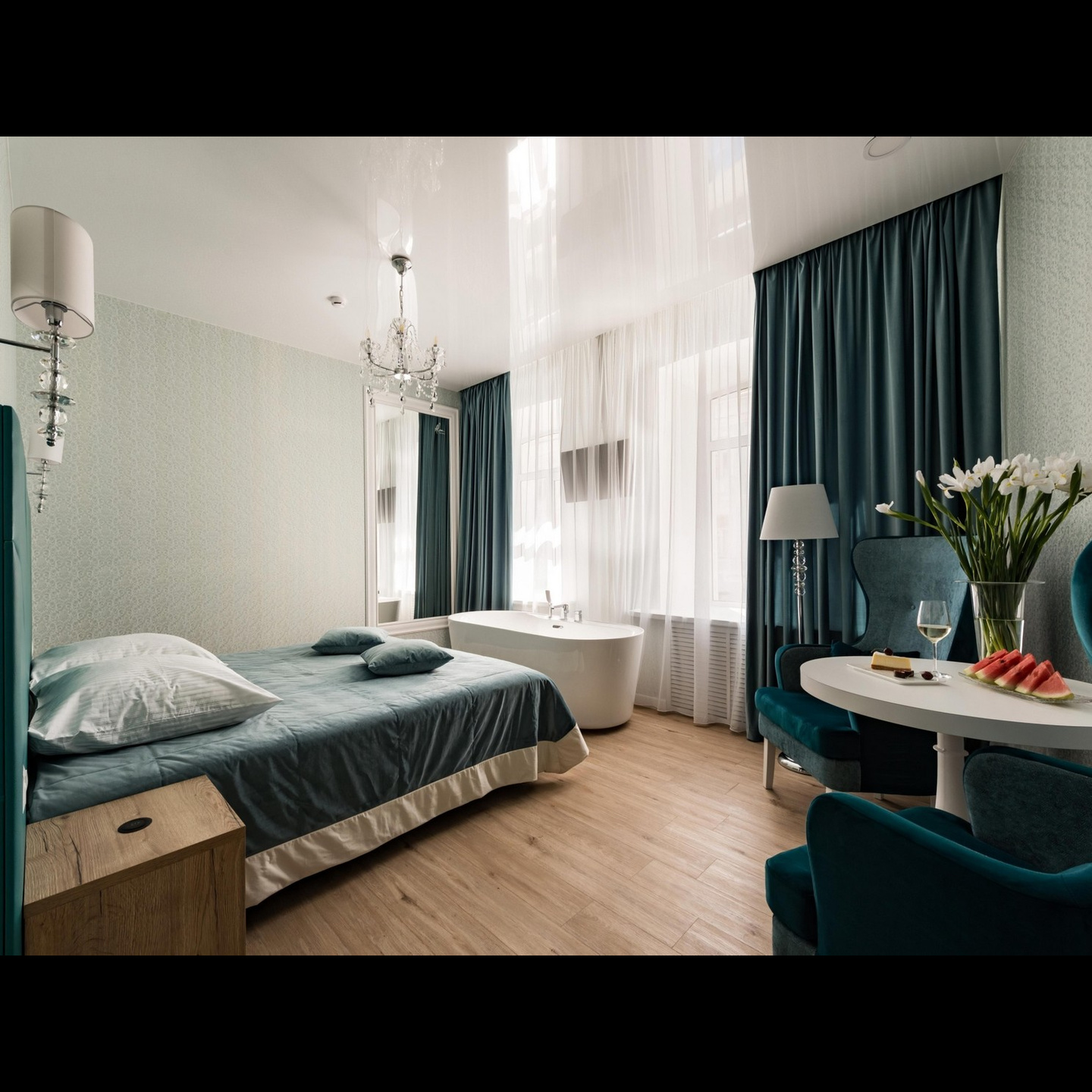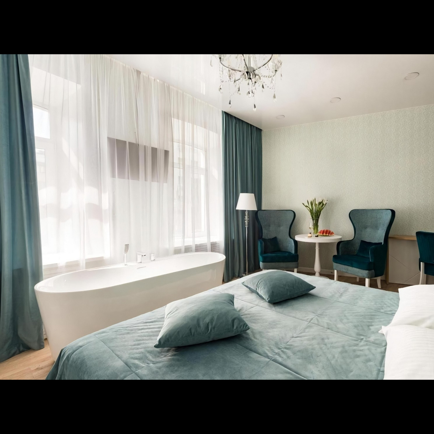 Отель предлагает разнообразные варианты размещения. Улучшенный двухместный номер площадью 20 м² и полулюкс площадью 26 м² идеальны для пар или деловых поездок. Люкс класса, также площадью 26 м², отличается особым комфортом — в этом номере гостей ждёт двуспальная кровать, два кресла и диван с мягкой обивкой, а роскошная ванна, расположенная у окна, создает атмосферу уюта и расслабления. Большое количество окон наполняет пространство естественным светом, подчеркивая атмосферу роскоши и простора.