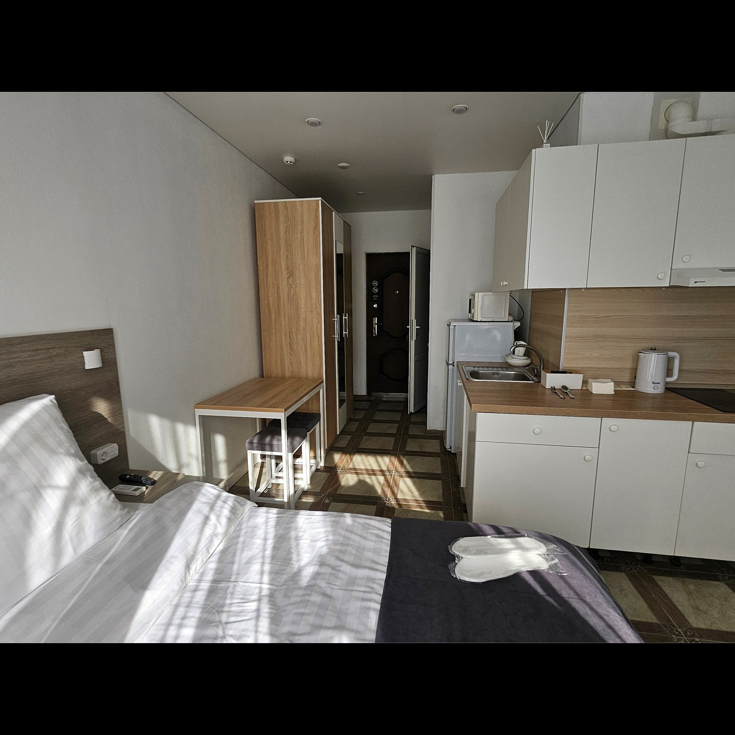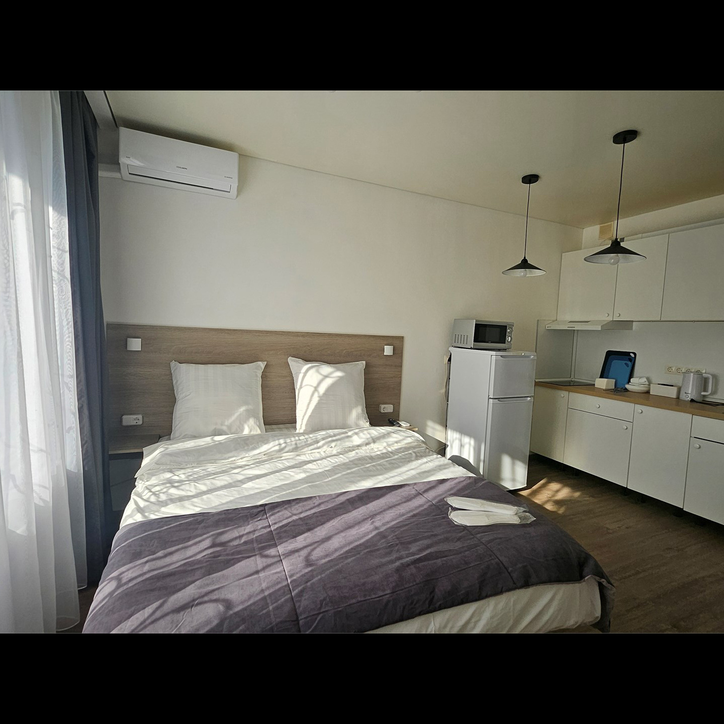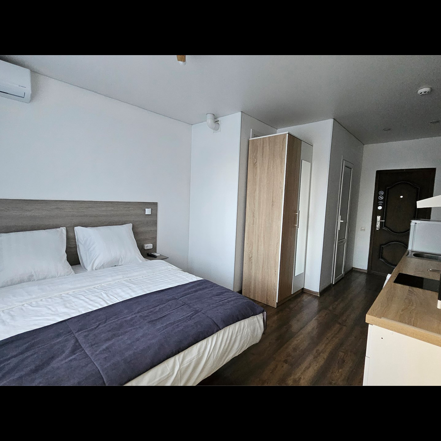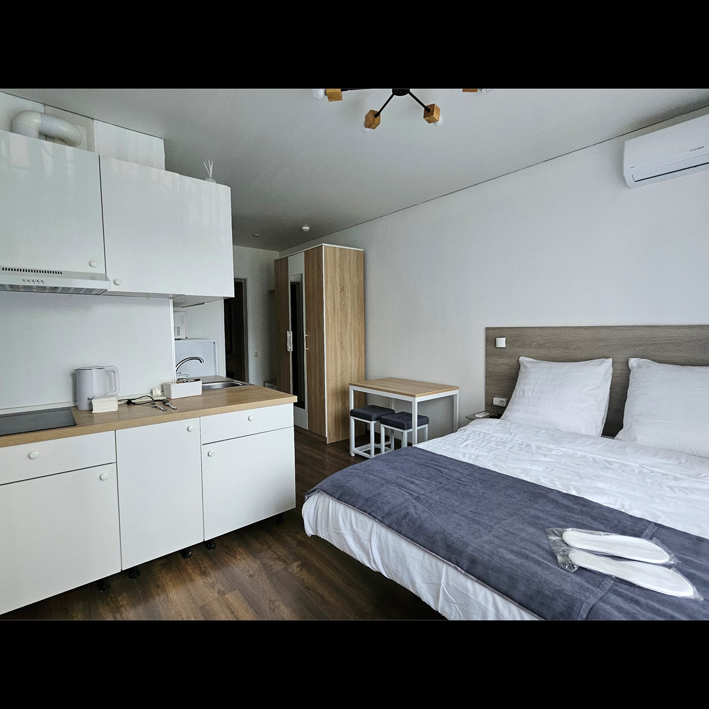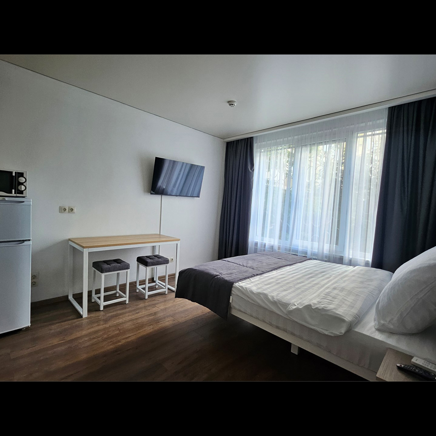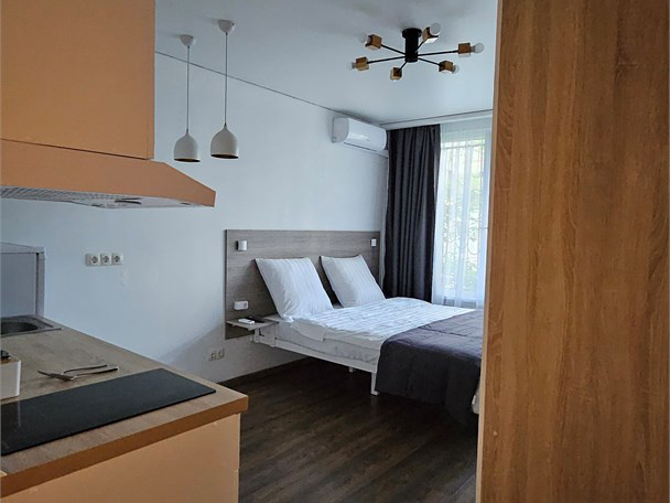 Номер класса комфорт, оснащен Душевой комнатой, туалетом. Кухонный гарнитур в который встроена индукционная плита, вытяжка, раковина. Из электроники: микроволновая печь, двухкамерный холодильник, чайник, смарт тв, фен, утюг, гладильная доска, высоко скоростной интернет . Парящая кровать с подсветкой и анатомическим матрасом, обеденный стол, шкаф, обувница.