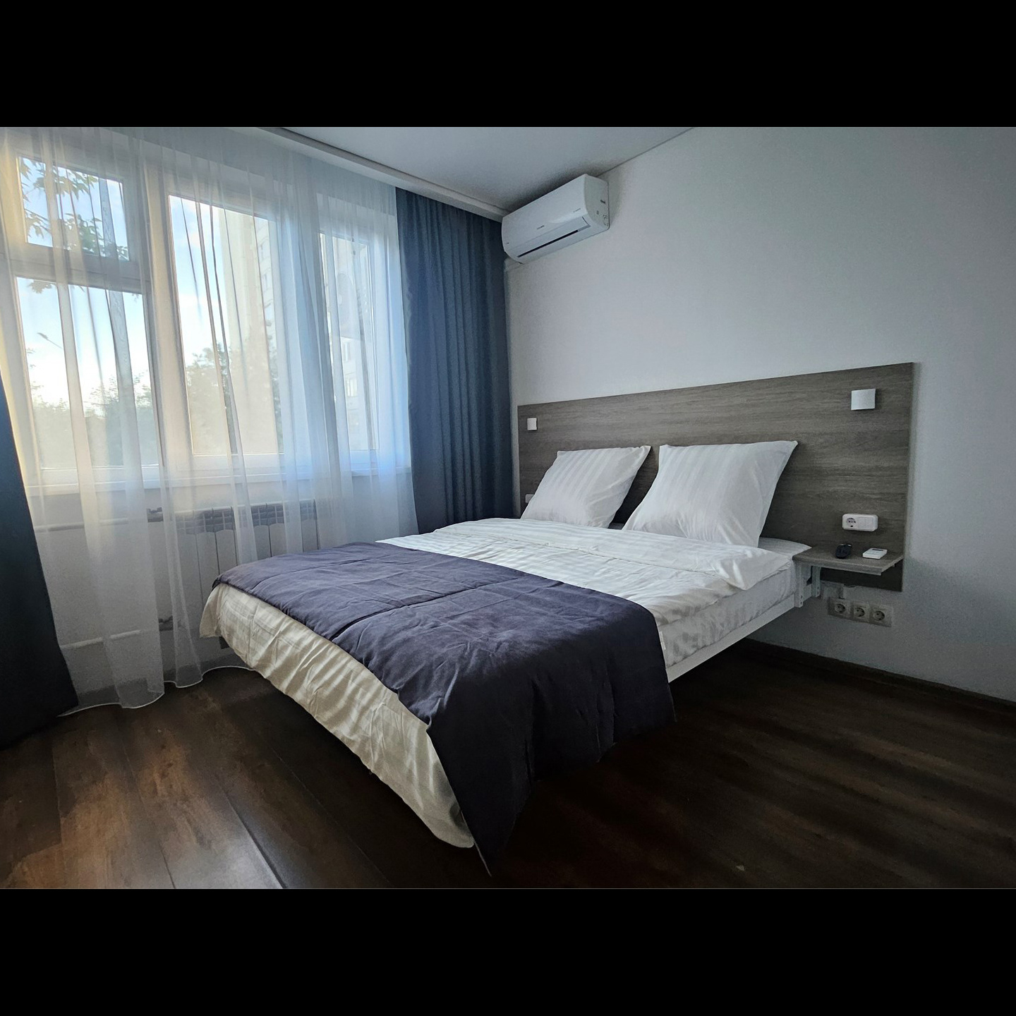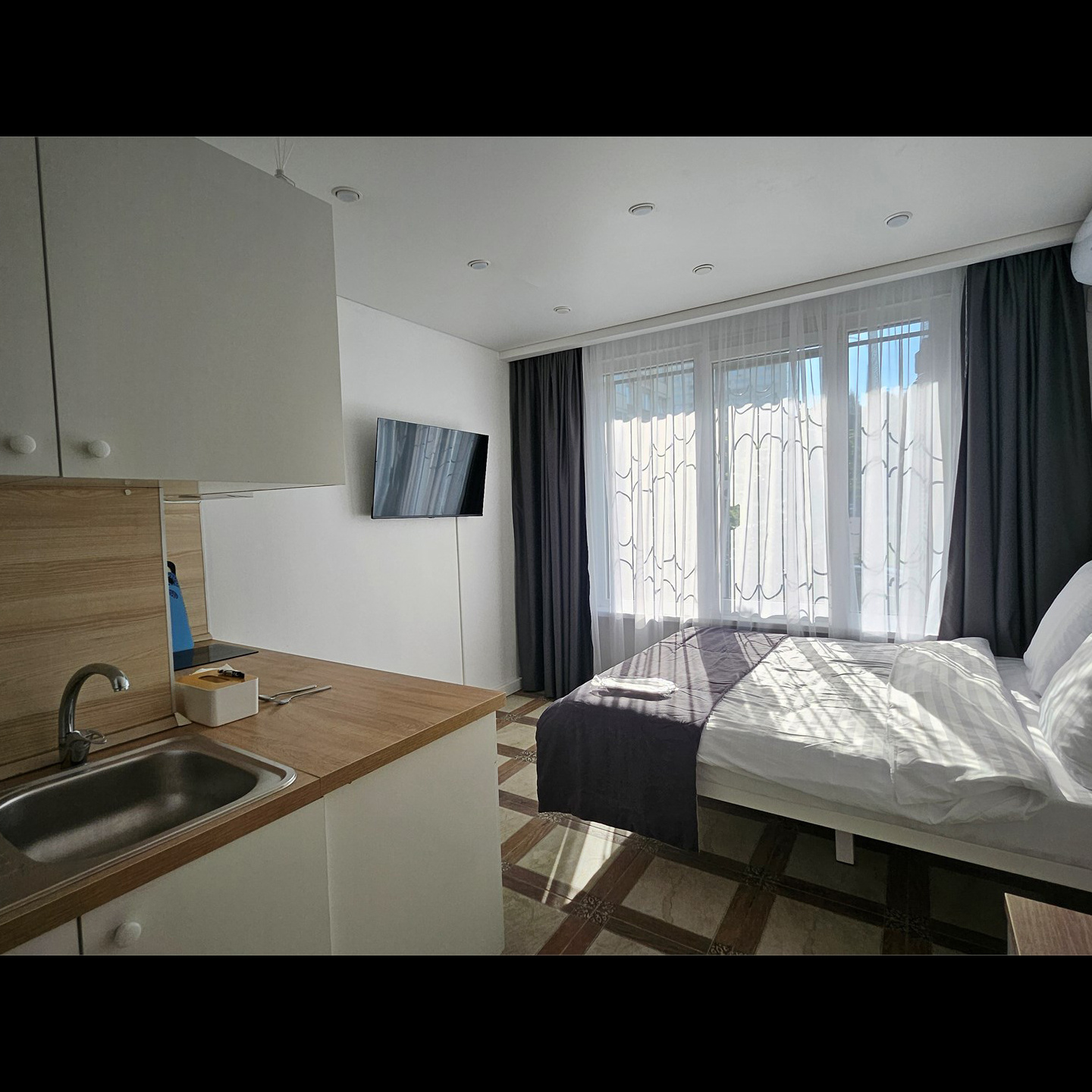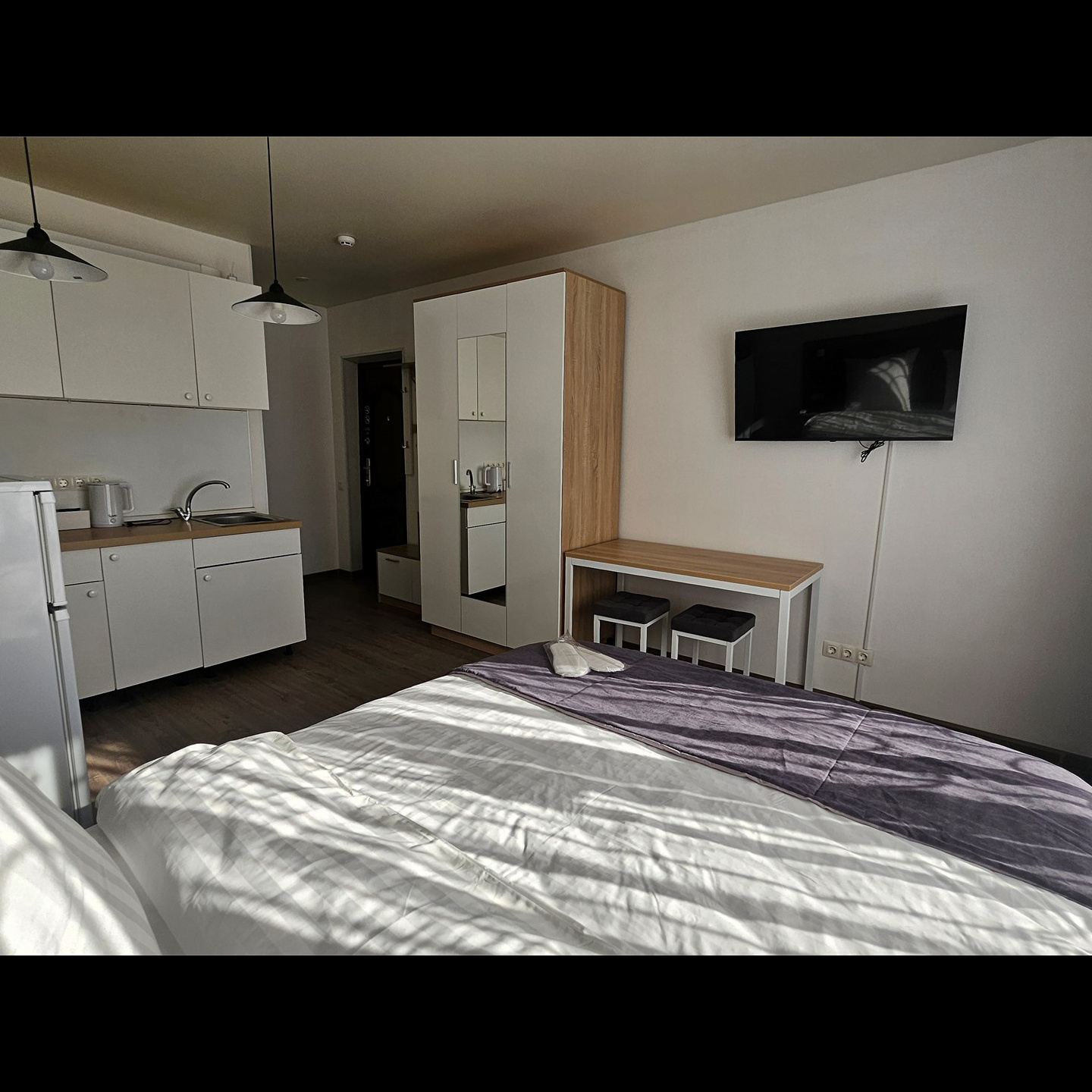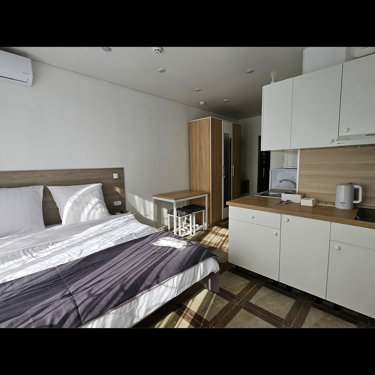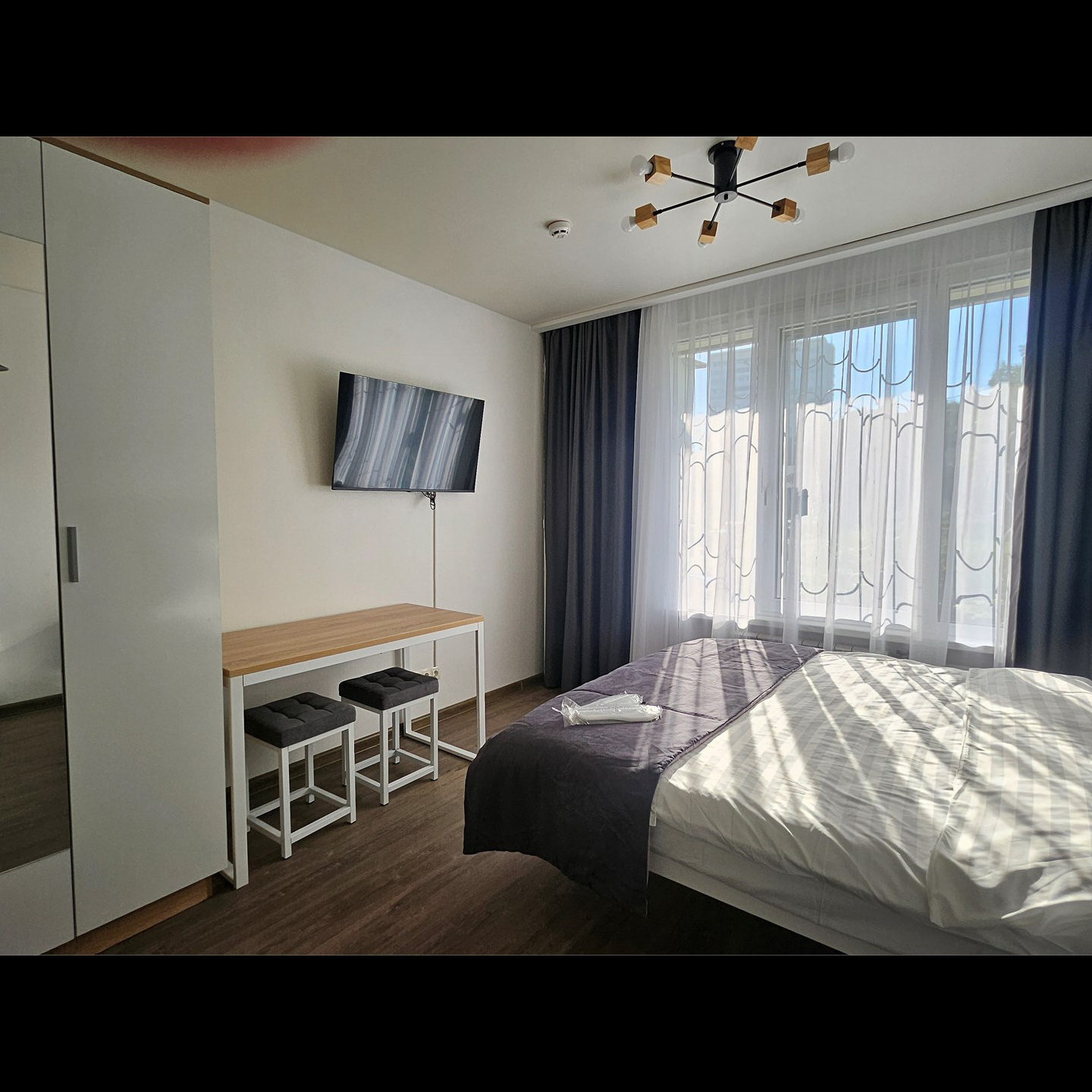 Номер класса комфорт, оснащен Душевой комнатой, туалетом. Кухонный гарнитур в который встроена индукционная плита, вытяжка, раковина. Из электроники: микроволновая печь, двухкамерный холодильник, чайник, смарт тв, фен, утюг, гладильная доска, высоко скоростной интернет . Парящая кровать с подсветкой и анатомическим матрасом, обеденный стол, шкаф, обувница.