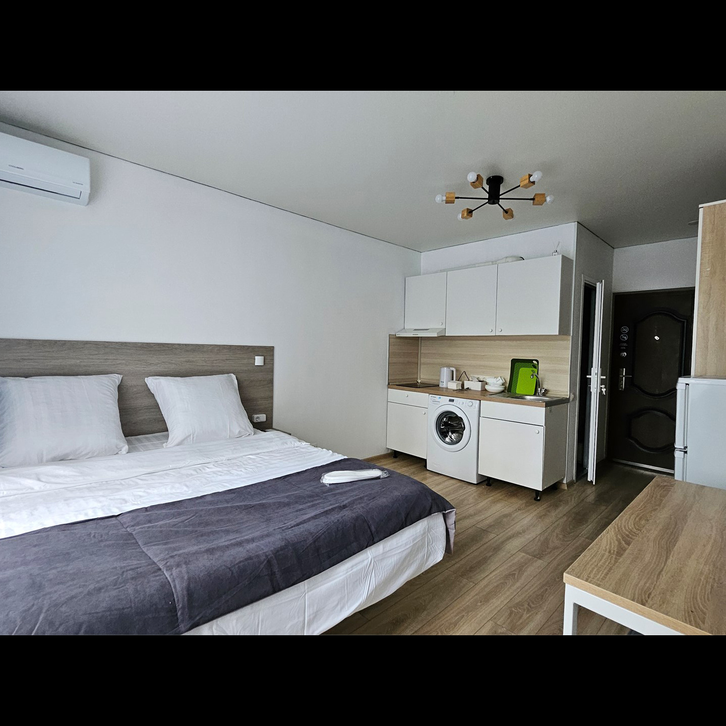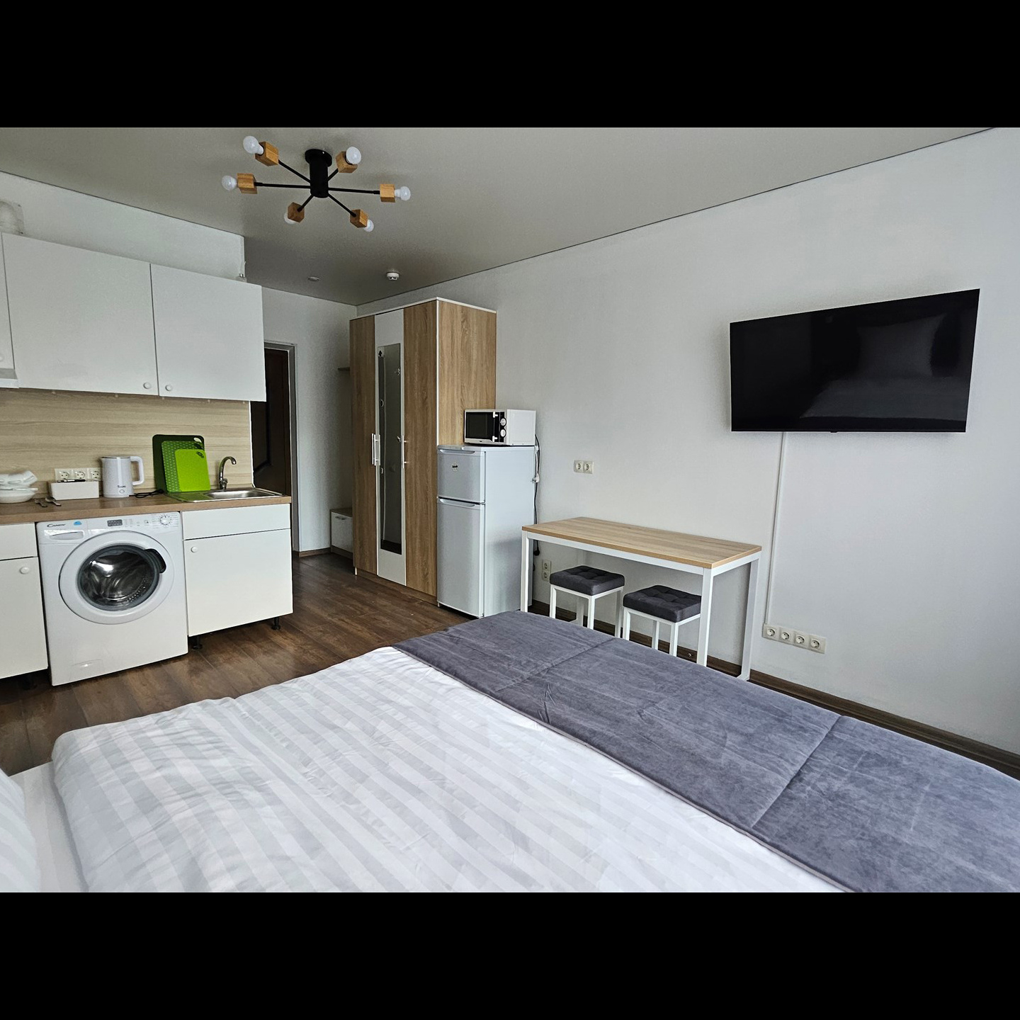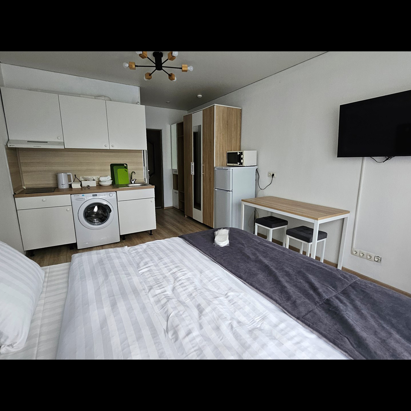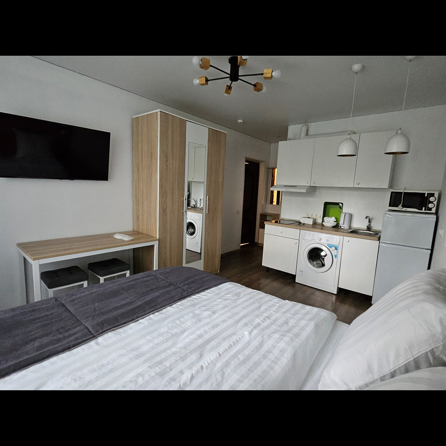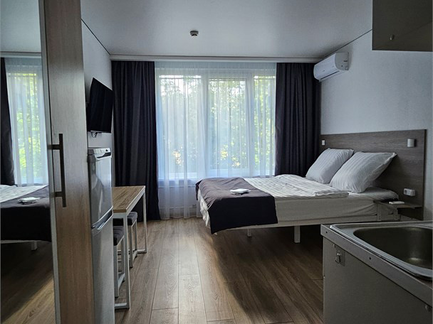 Номер класса стандарт, оснащен Душевой комнатой, туалетом в комнате под раковиной встроена стиральная машинка. Кухонный гарнитур в который встроена индукционная плита, вытяжка, раковина. Из электроники: микроволновая печь, двухкамерный холодильник, чайник, смарт тв, фен, утюг, гладильная доска высоко скоростной интернет . Парящая кровать с подсветкой и анатомическим матрасом, обеденный стол, шкаф, обувница.