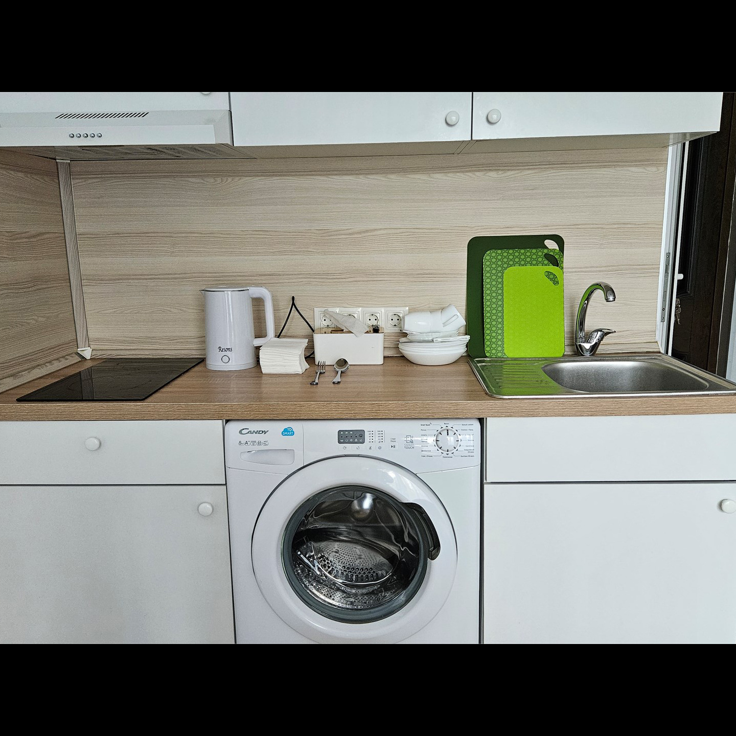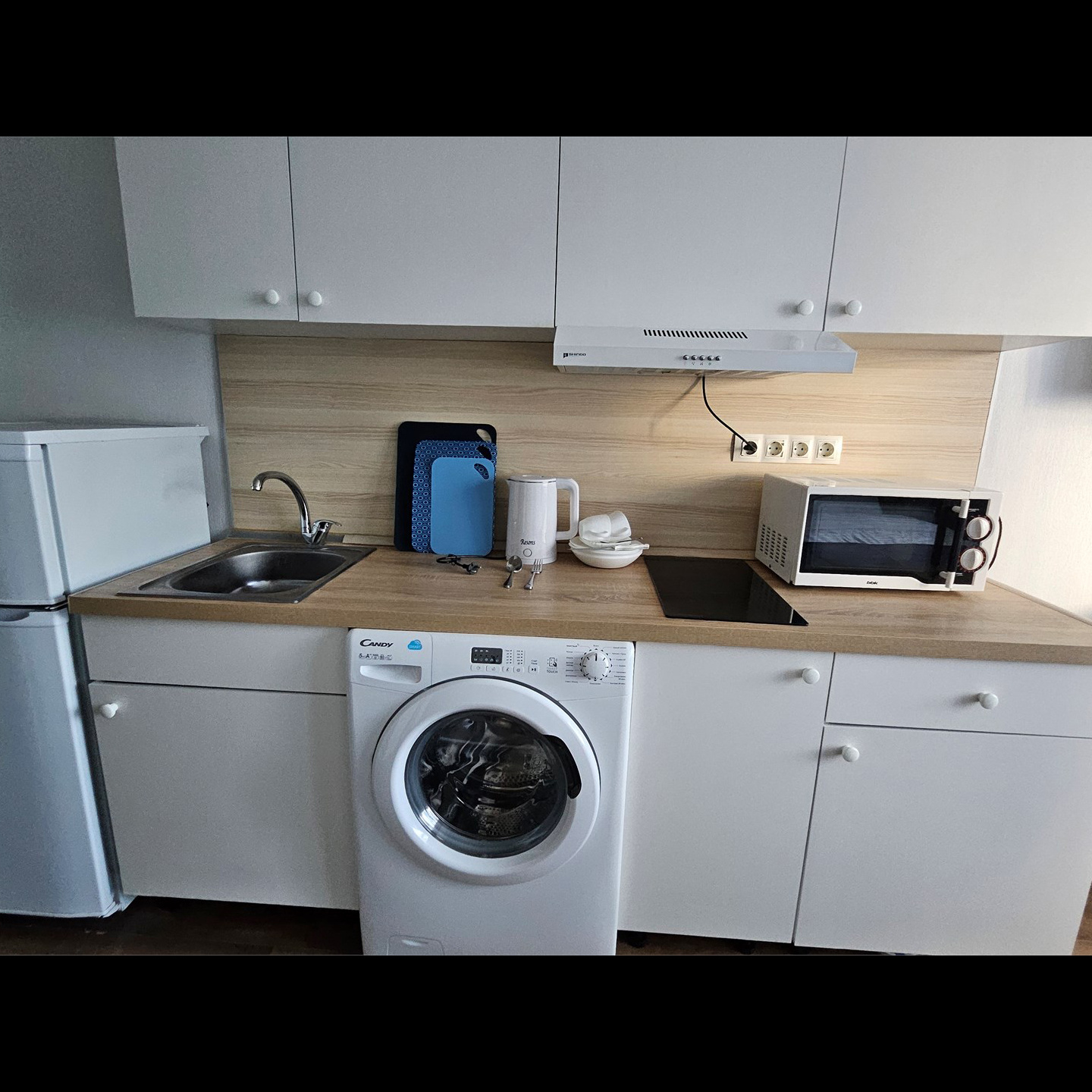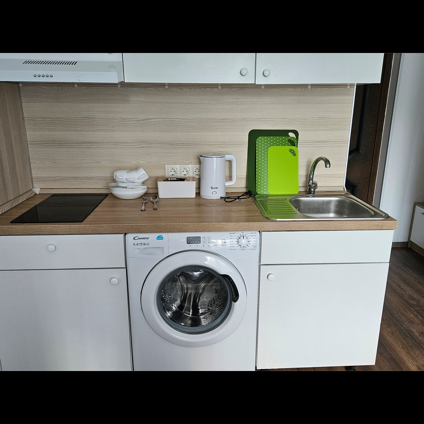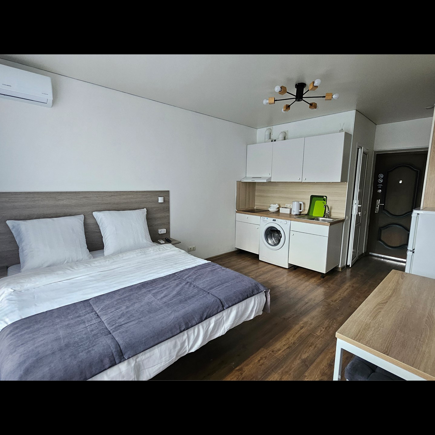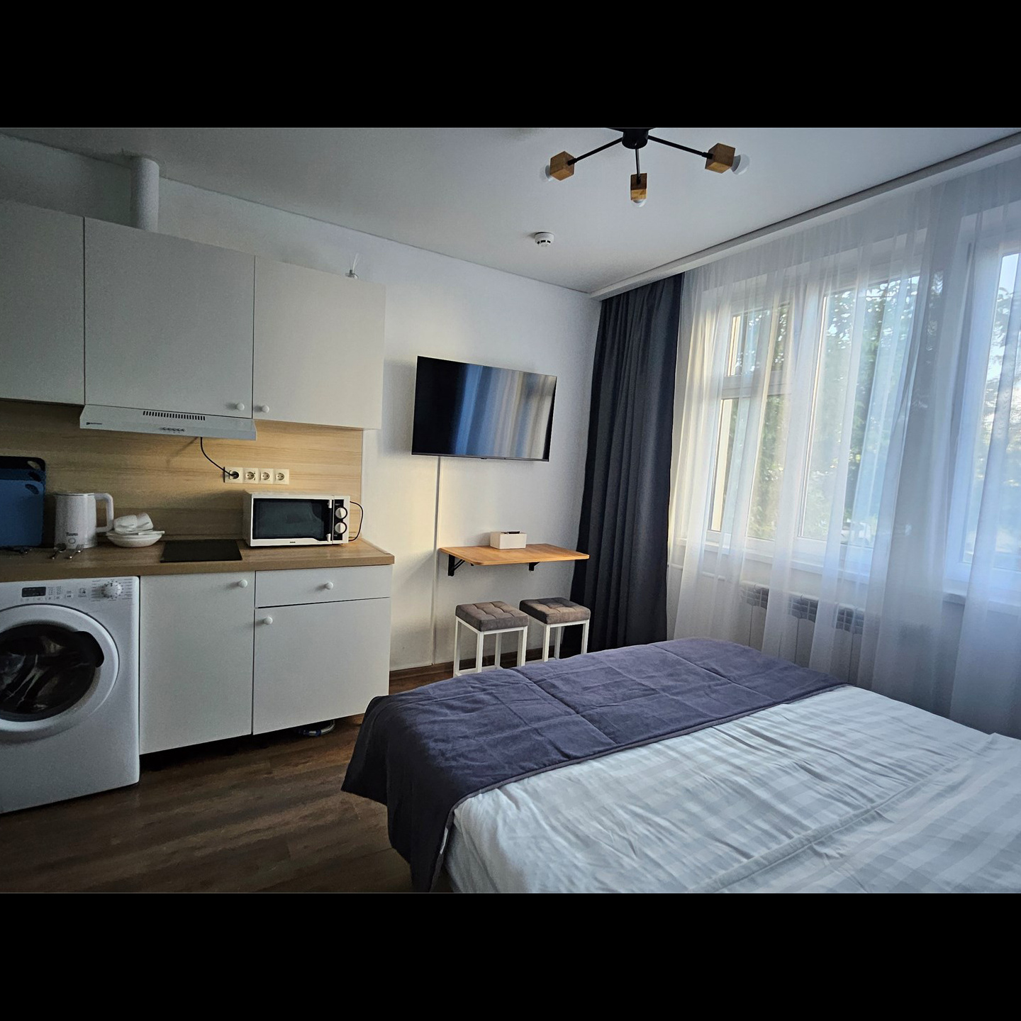 Номер класса стандарт, оснащен Душевой комнатой, туалетом в комнате под раковиной встроена стиральная машинка. Кухонный гарнитур в который встроена индукционная плита, вытяжка, раковина. Из электроники: микроволновая печь, двухкамерный холодильник, чайник, смарт тв, фен, утюг, гладильная доска высоко скоростной интернет . Парящая кровать с подсветкой и анатомическим матрасом, обеденный стол, шкаф, обувница.