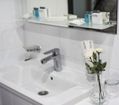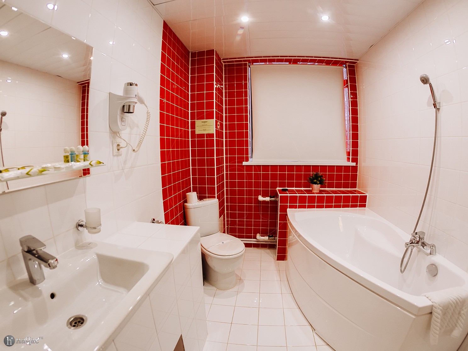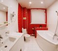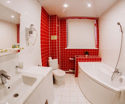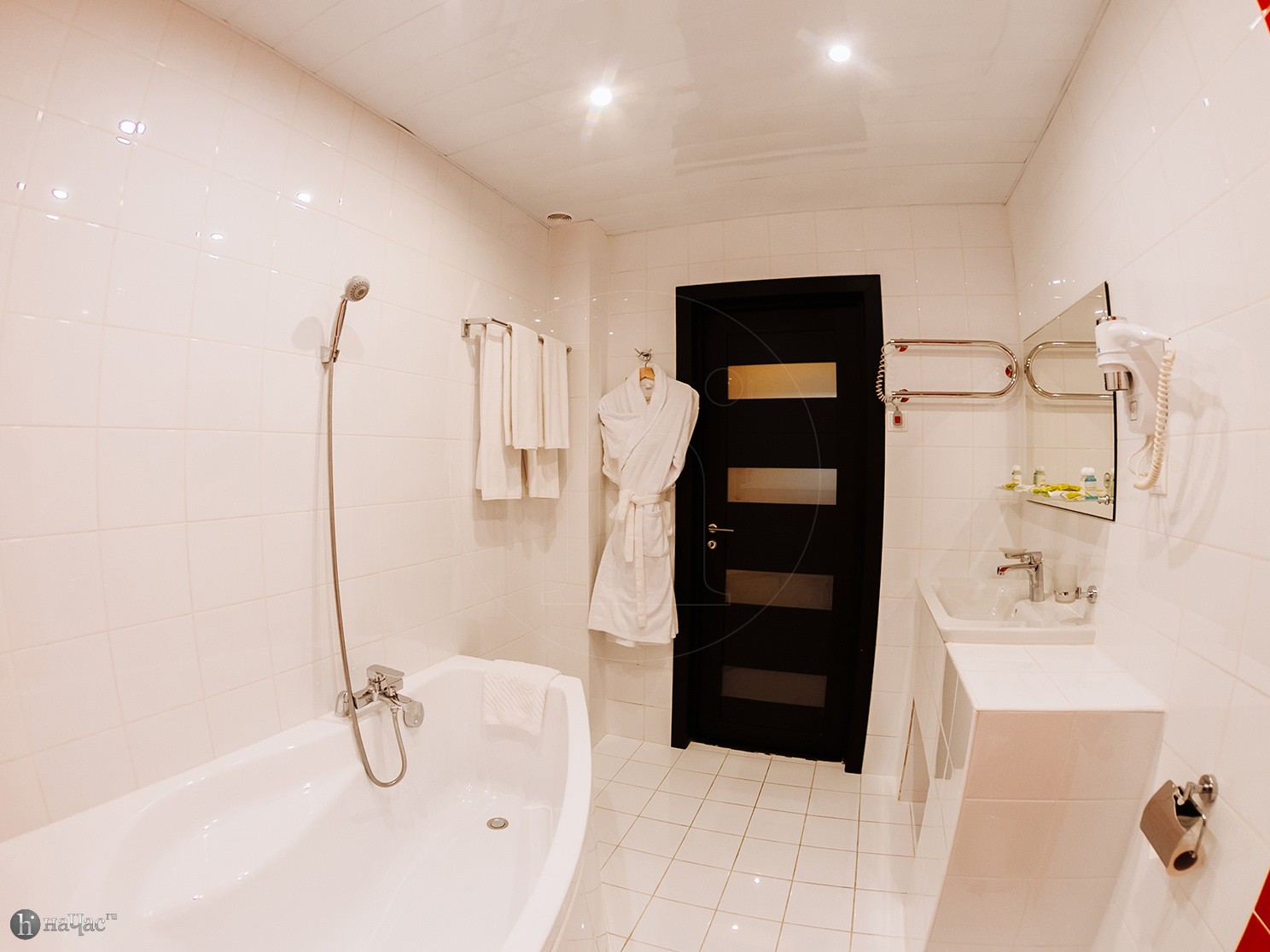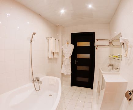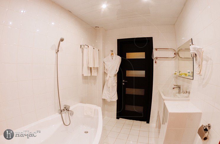 Ванная комната, TV, тапочки, гигиенические принадлежности, полотенца, кофе, чай, сахар, стаканы,чайная пара, фен, халаты.