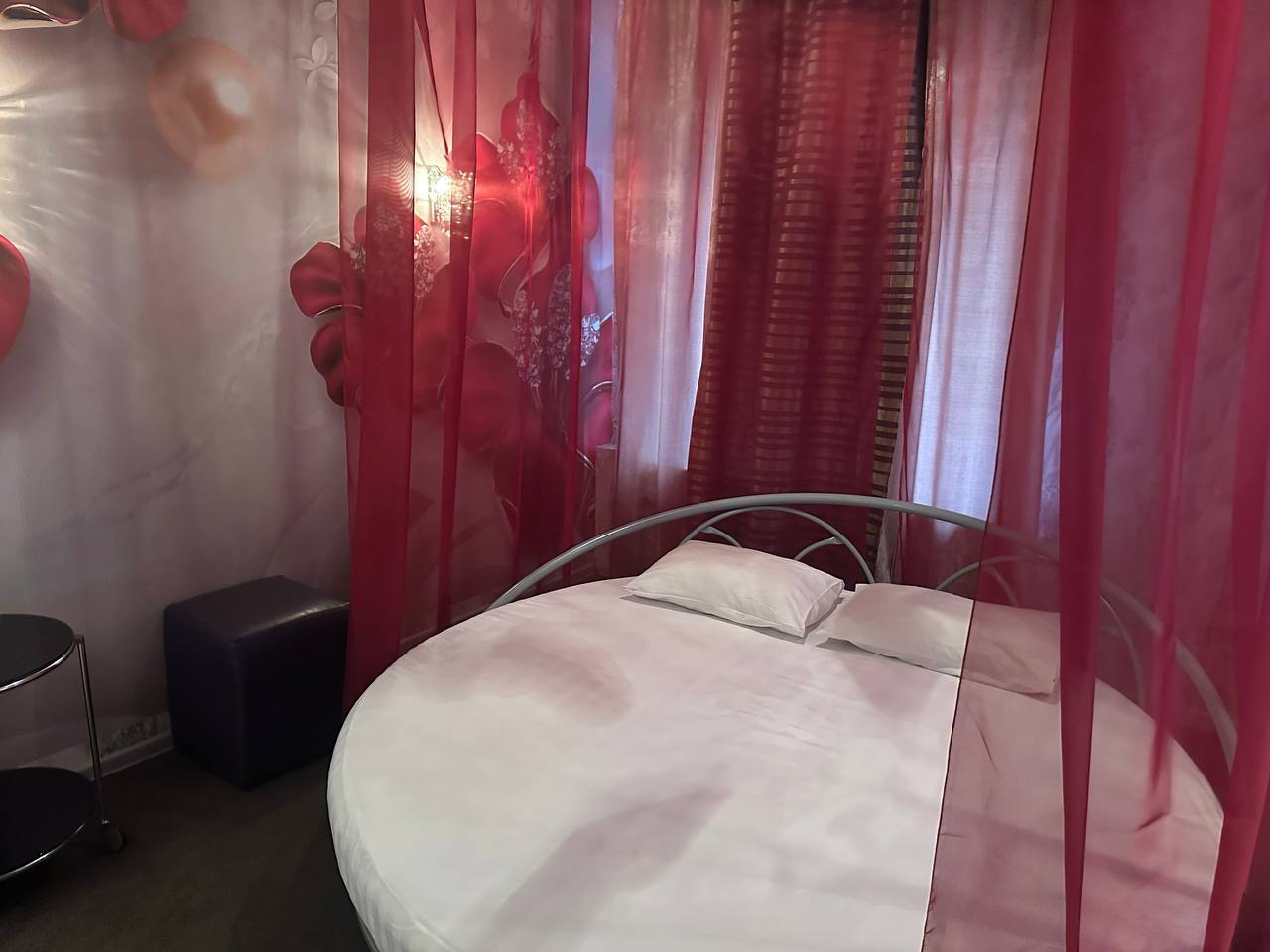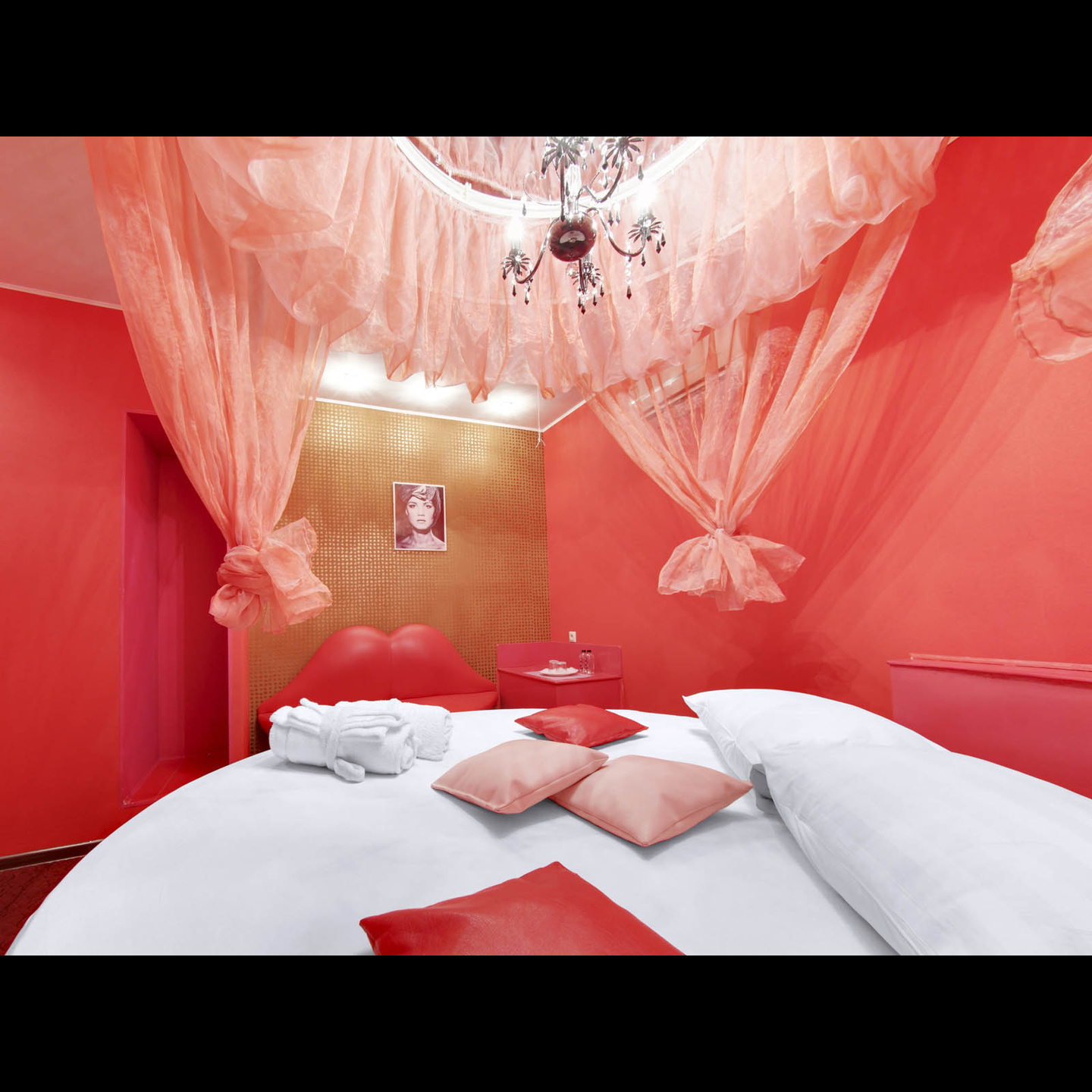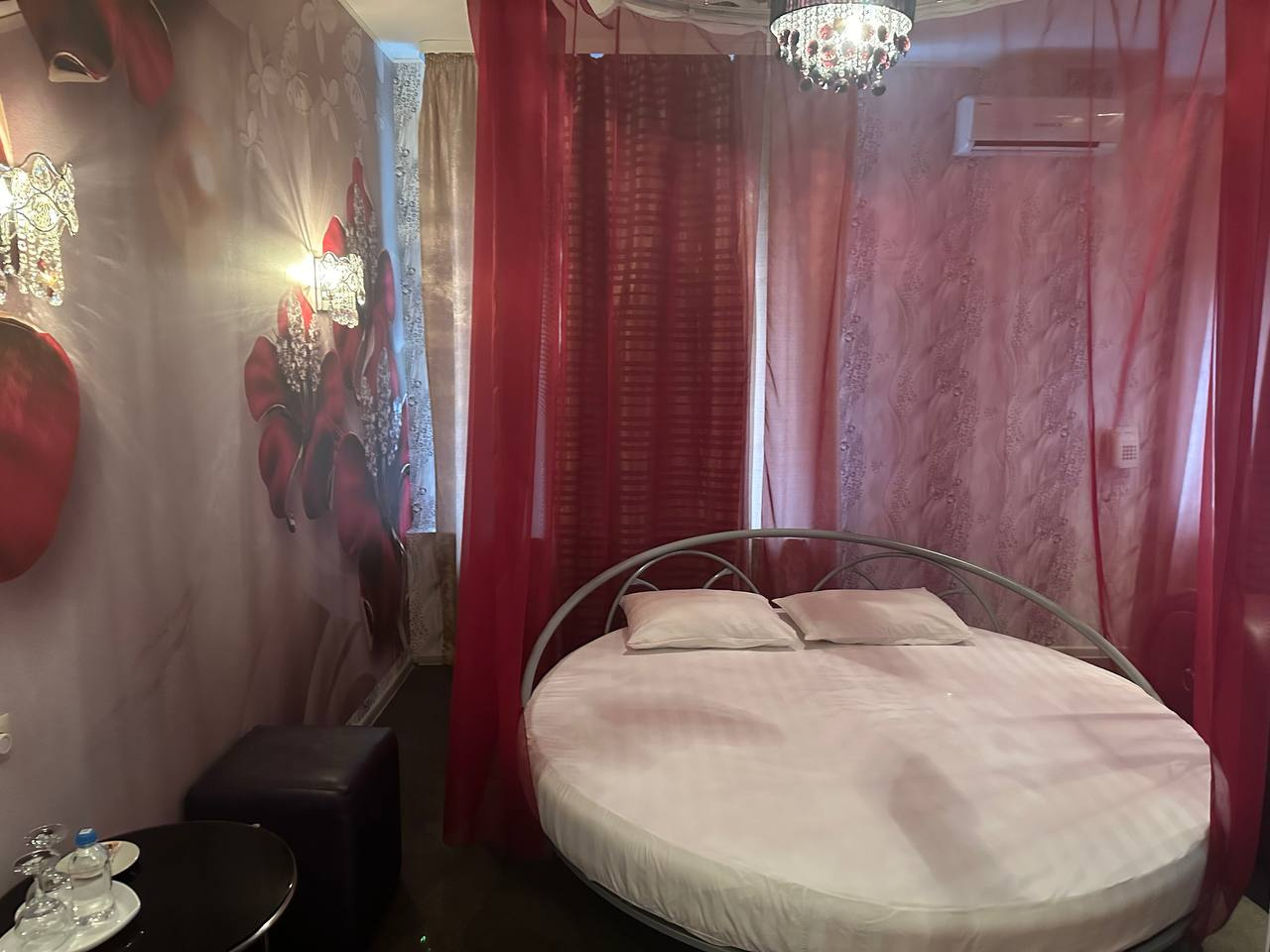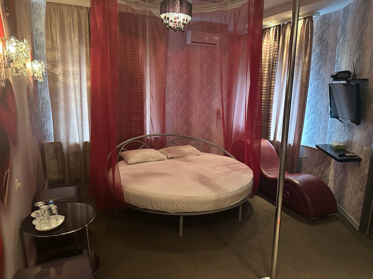 Номер выполнен в бордовых тонах с круглой кроватью под балдахином, зеркальным потолком. Есть пилон для танцев (некрутящийся), два огромных зеркала напротив *кресло волна.