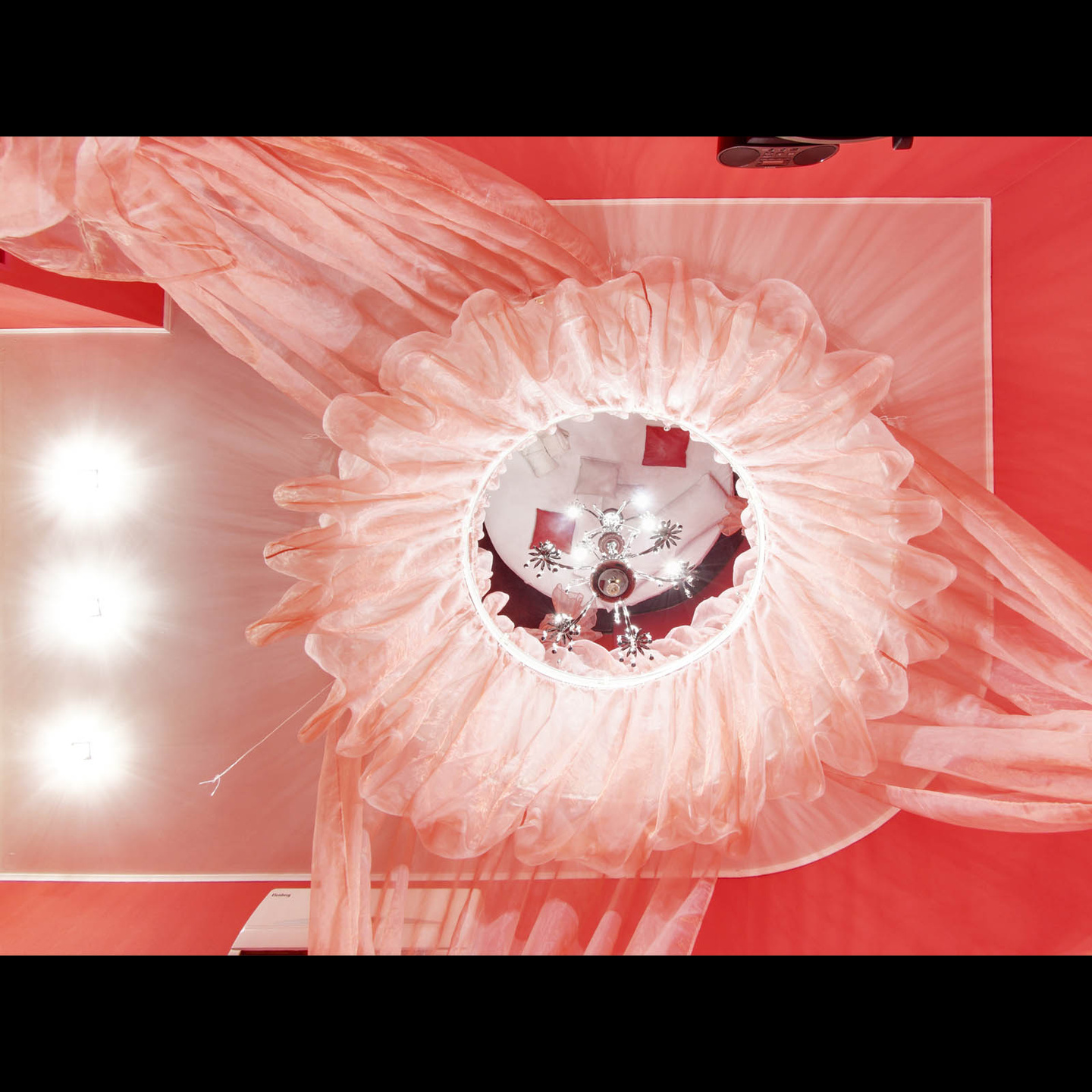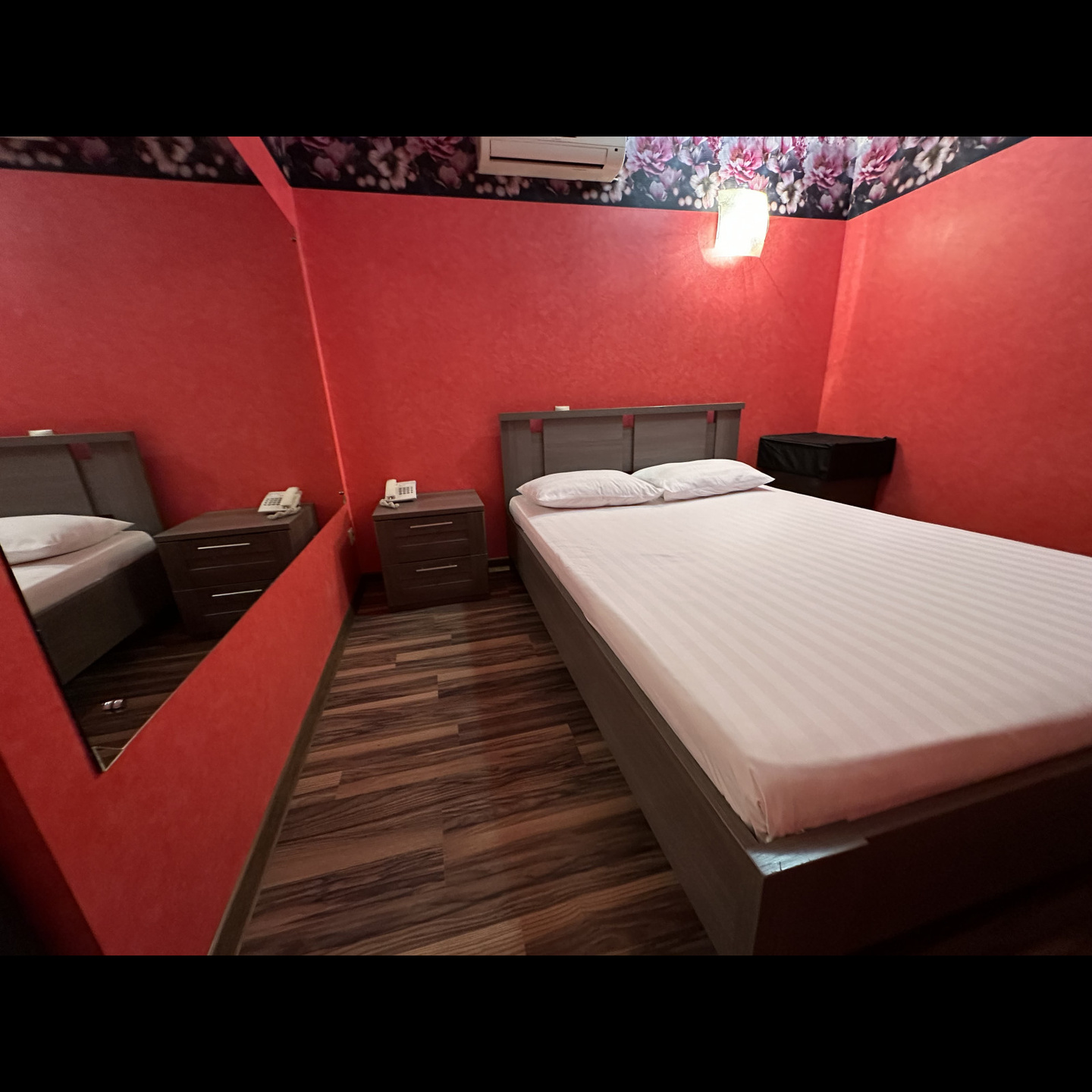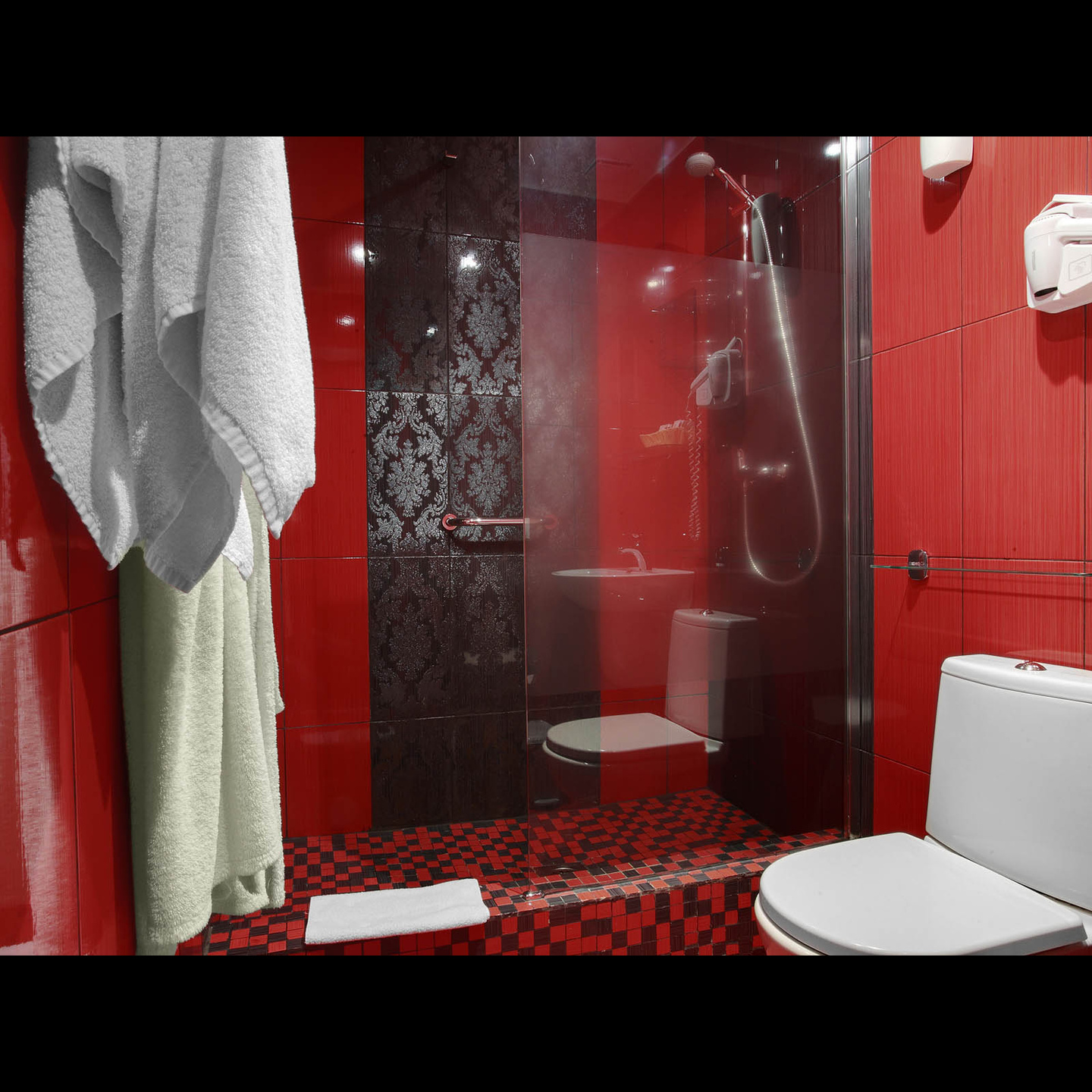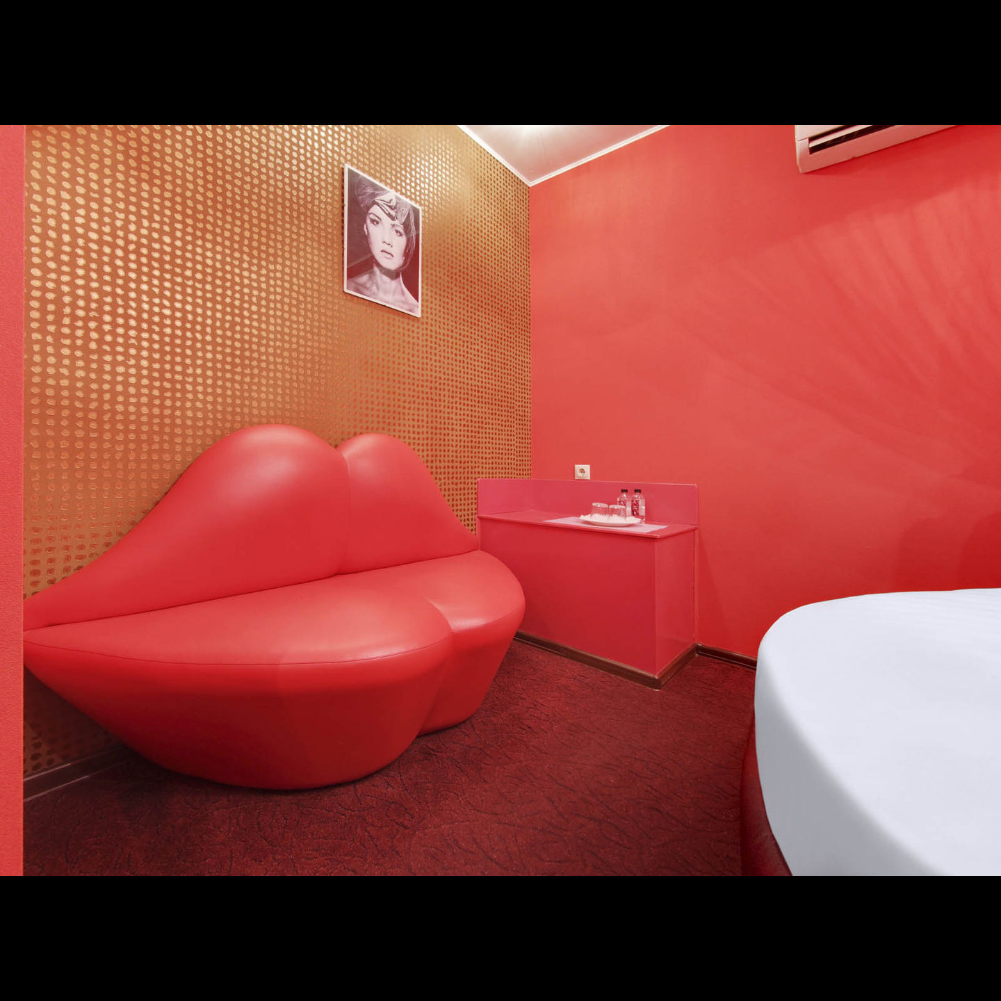 Номер выполнен в бордовых тонах с круглой кроватью под балдахином, зеркальным потолком. Есть пилон для танцев (некрутящийся), два огромных зеркала напротив *кресло волна.
