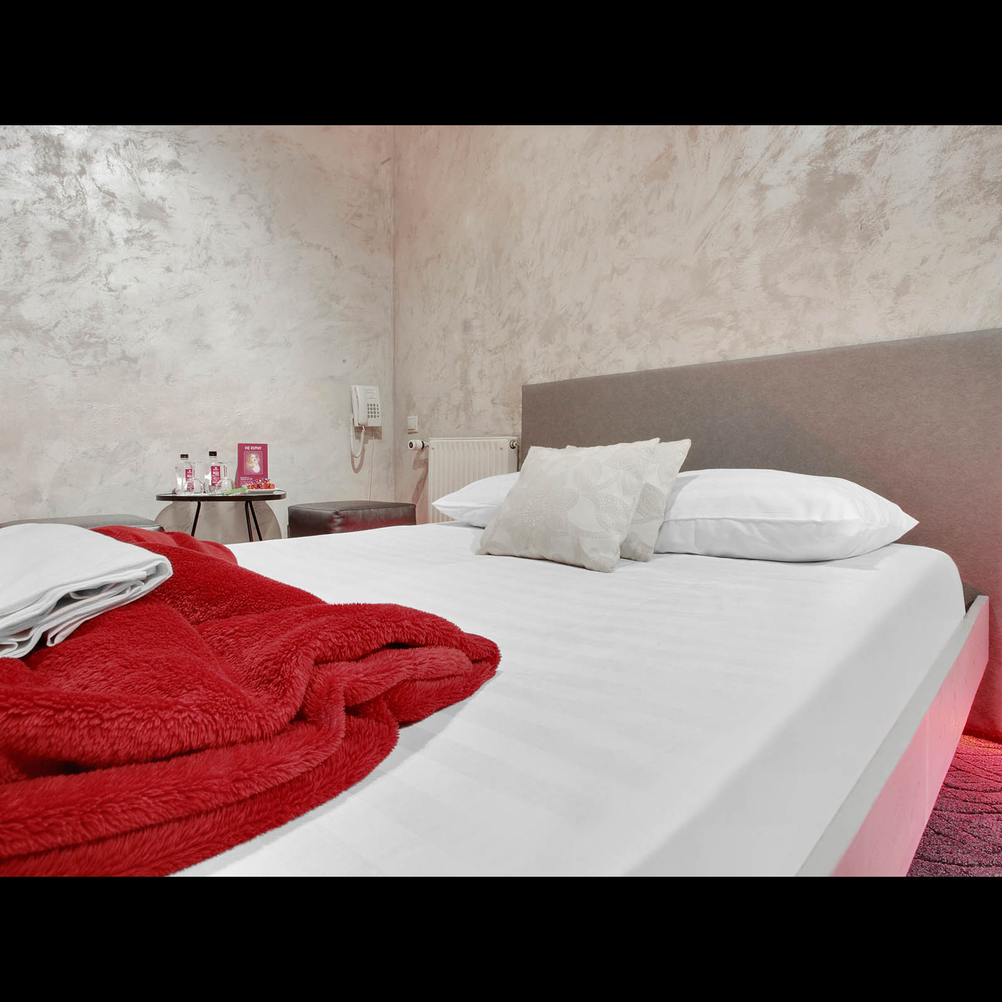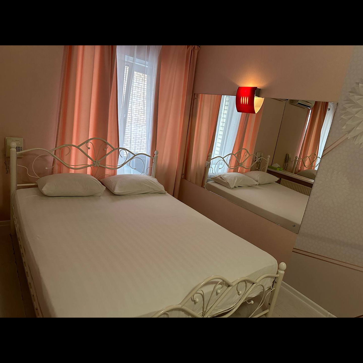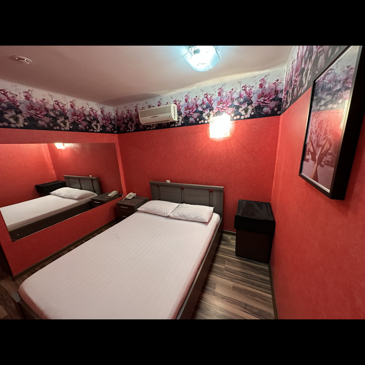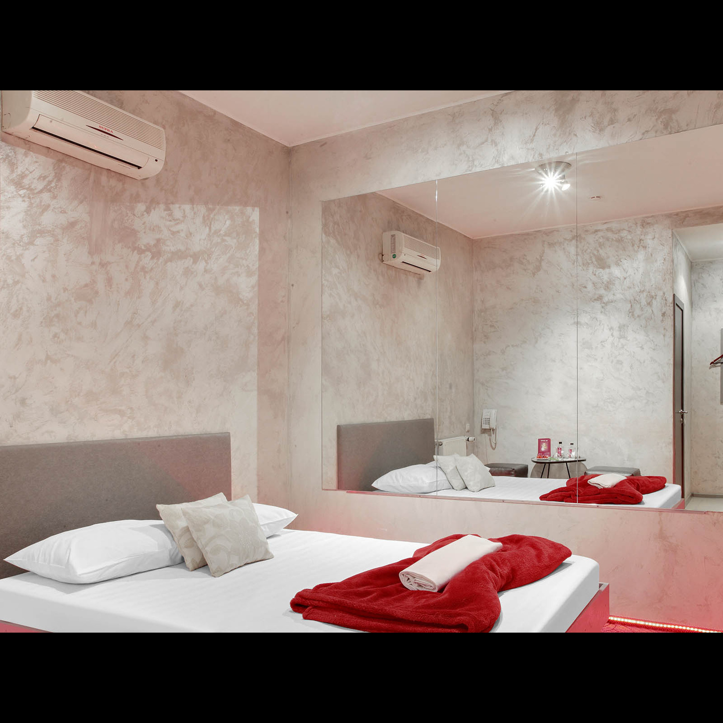 Очень нежная комната в бело- красных тонах с большой мягкой кроватью. Есть настенное зеркало - создает эффект зеркального коридора. Зона отдыха в виде двух кресел и журнального столика.
