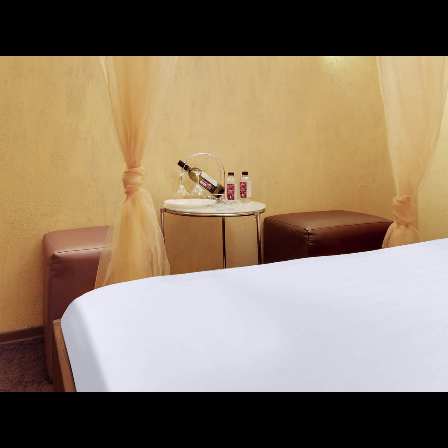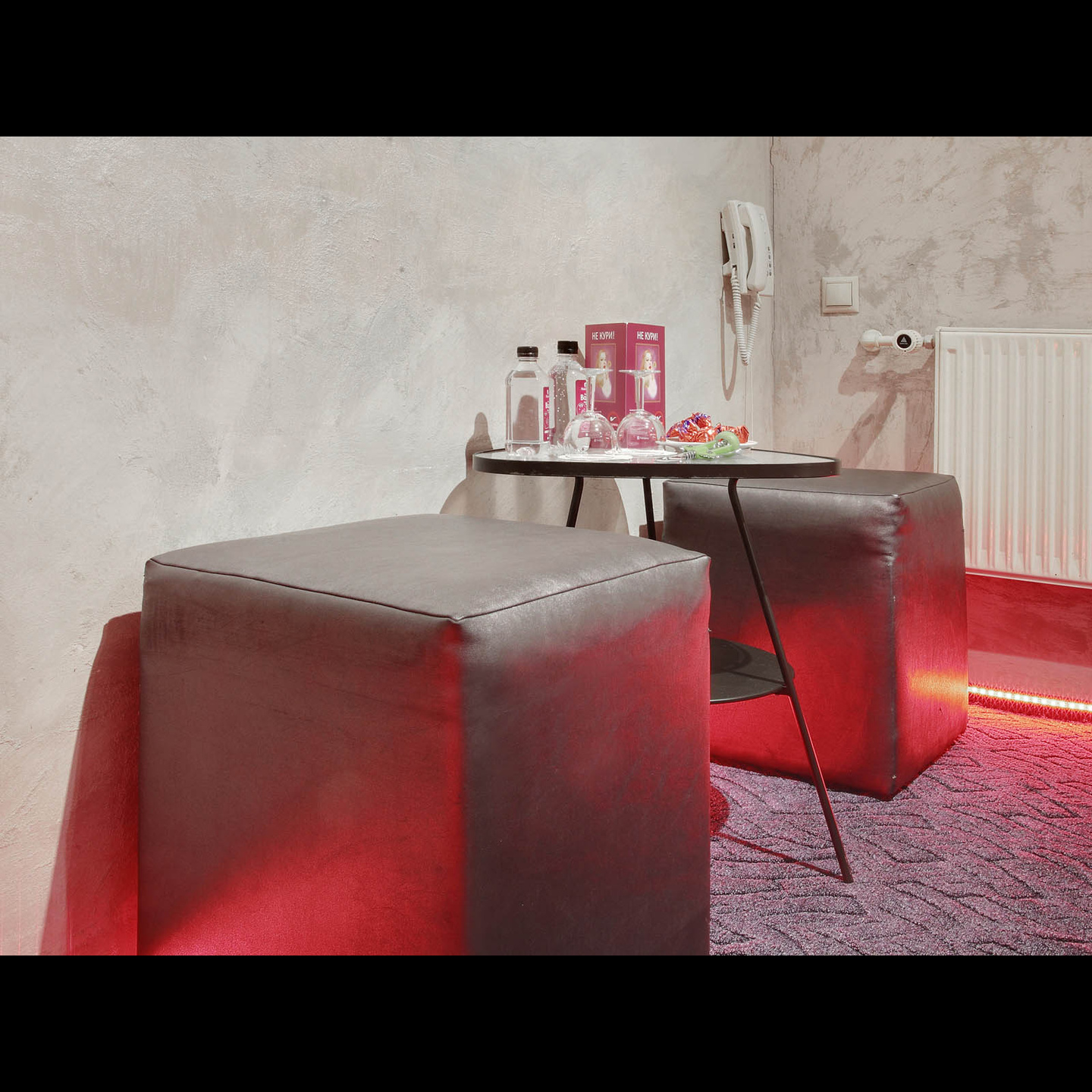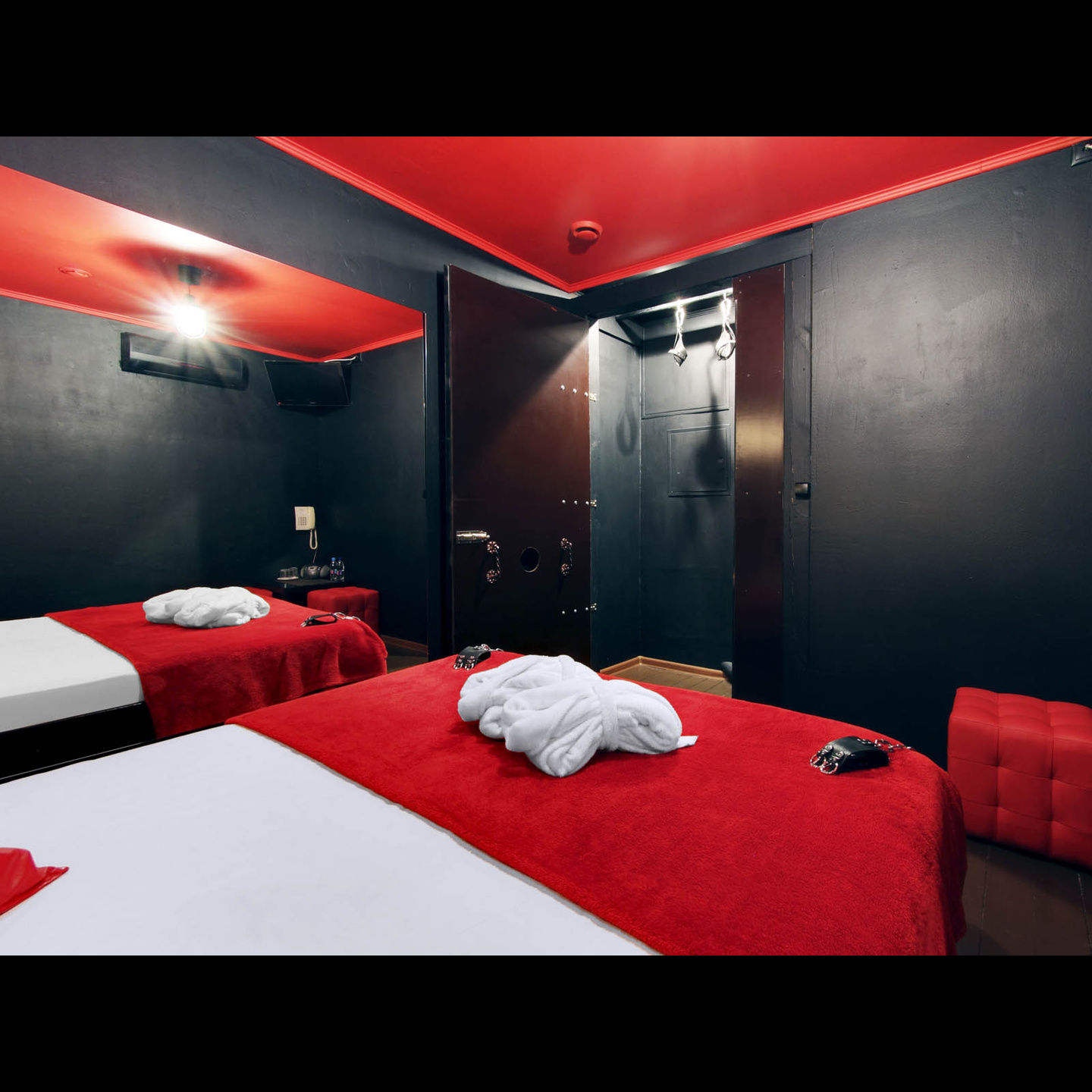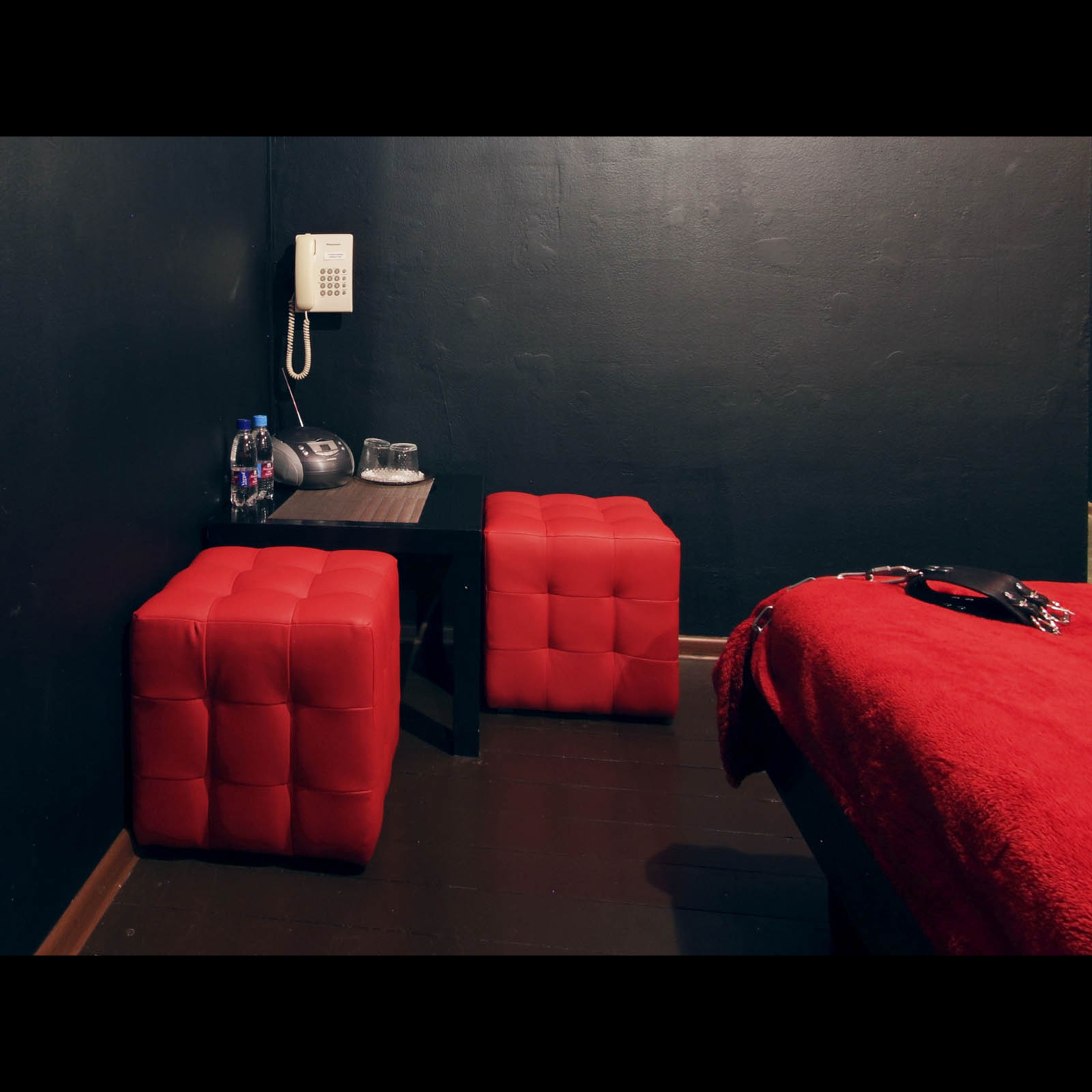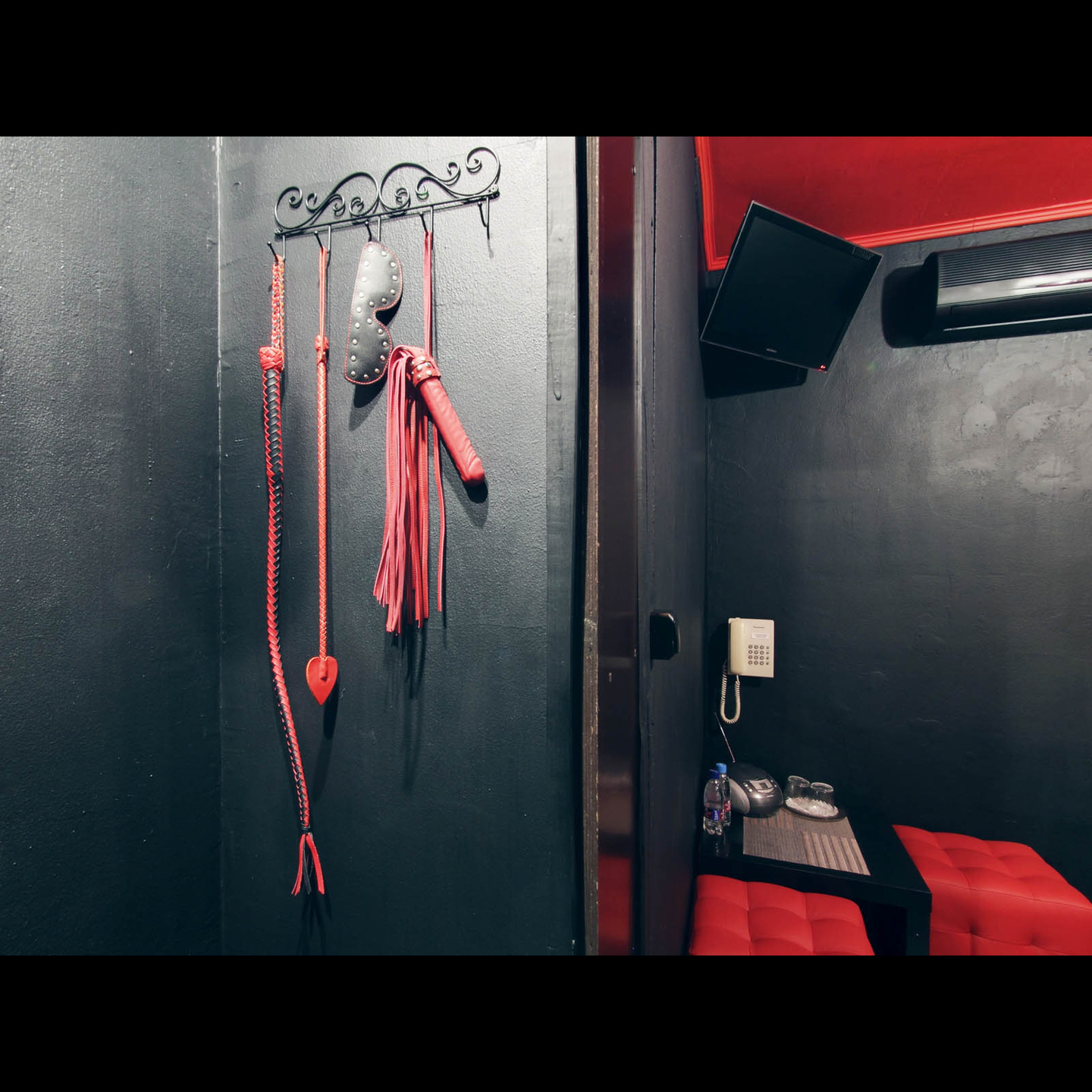В тёмных тонах, удобная кровать имеется приспособление для любовных игр в виде крепления для горизонт.фикс. Отверствие Glory-Hole в стене предназначено для возможности близости между партнерами без визуального и тактильного контакта. Одному из партнеров необходимо закрыть дверь на щекоду в нише, где имеется подсветка. + горизонт. Фиксация* ударные девайсы. В качестве угощения подаются конфеты.
