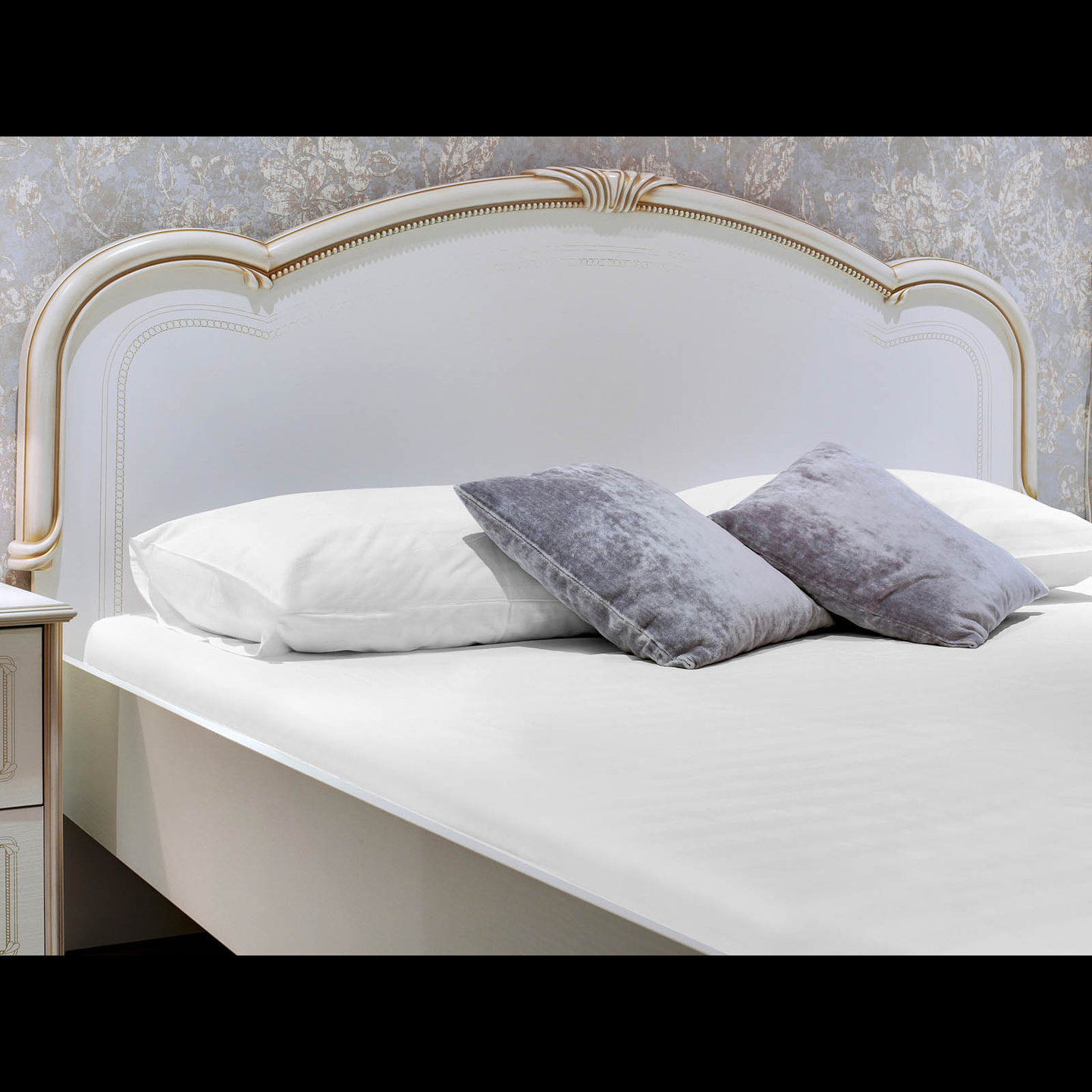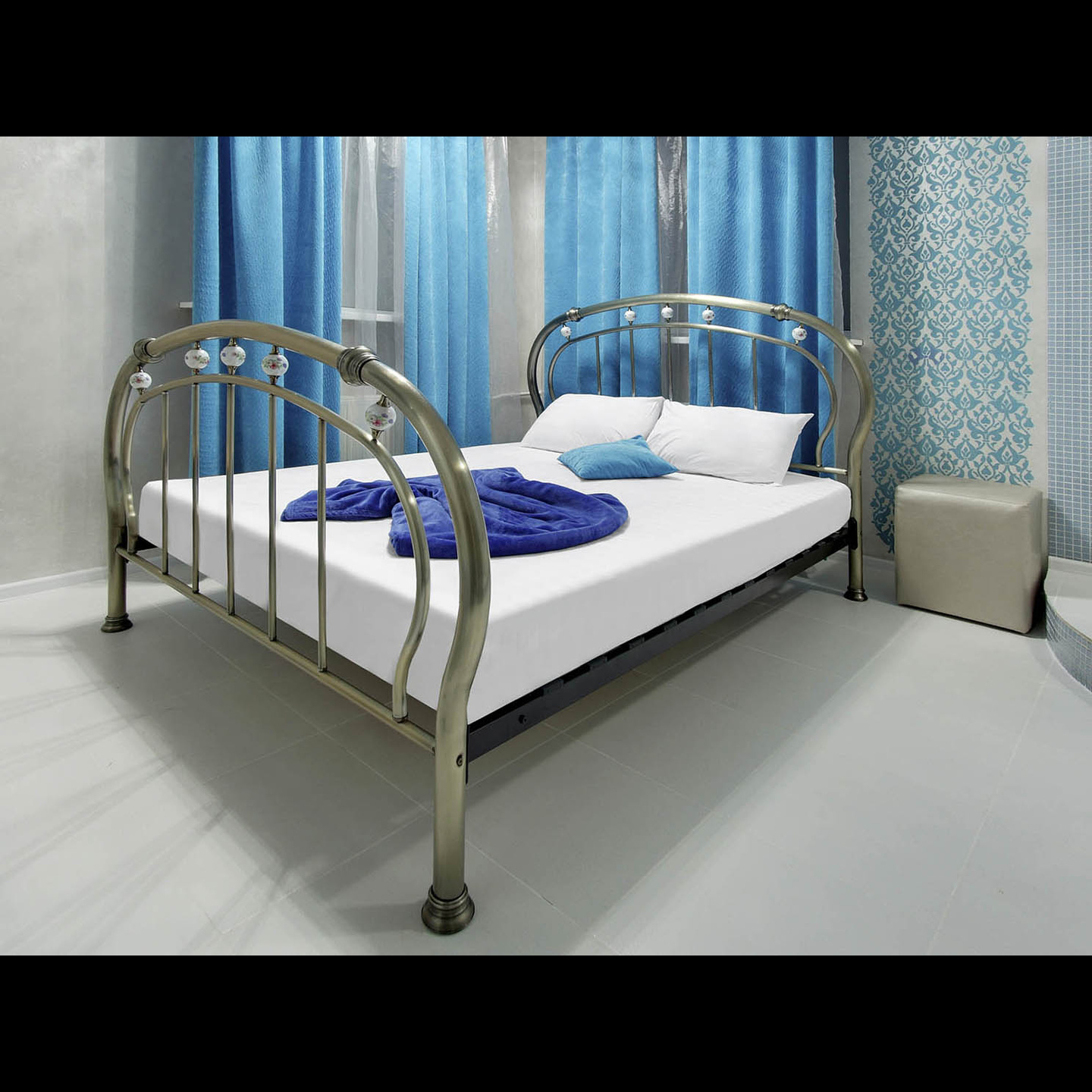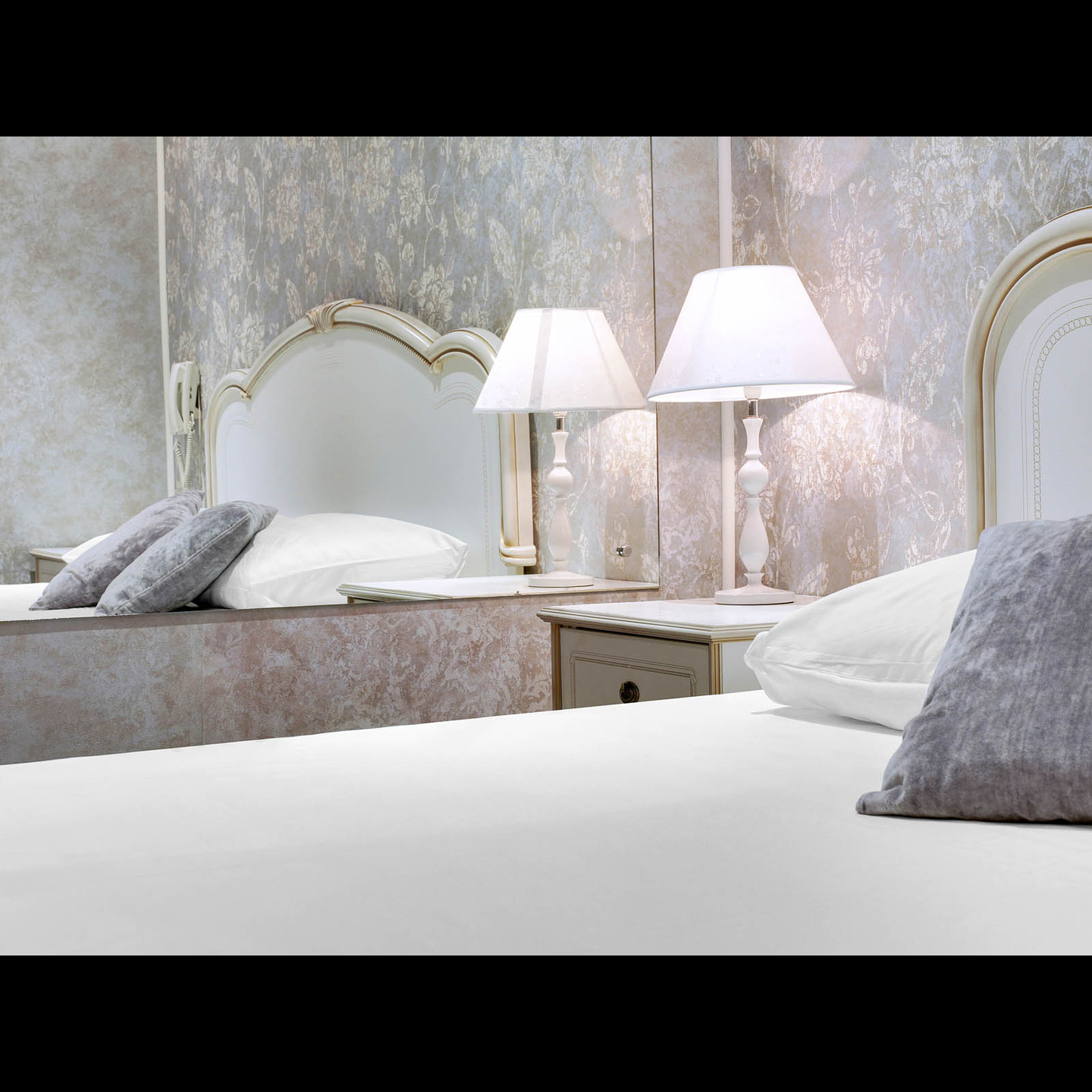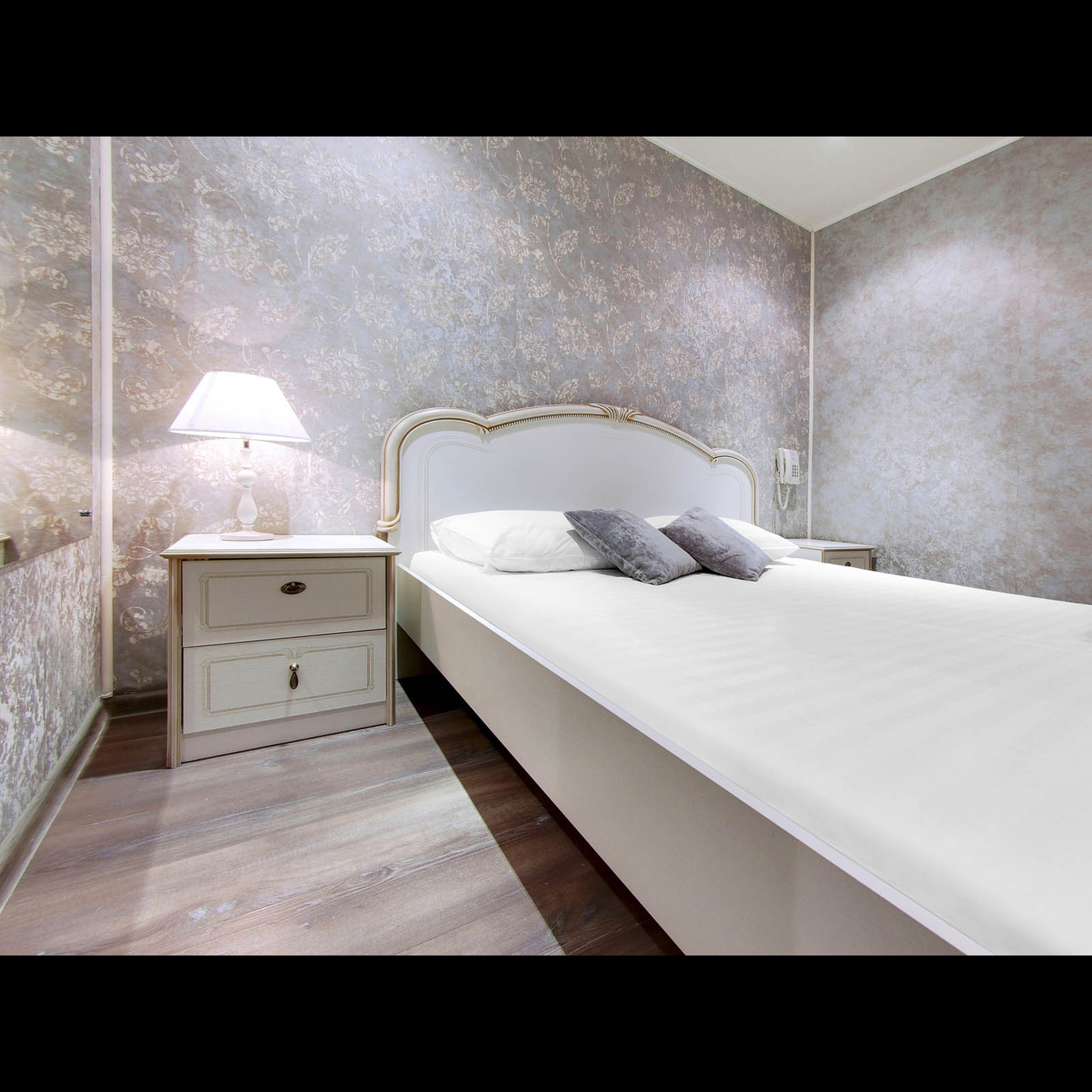 Классический номер в серо-серебристых тонах. Интересное размещение зеркала напротив кровати.