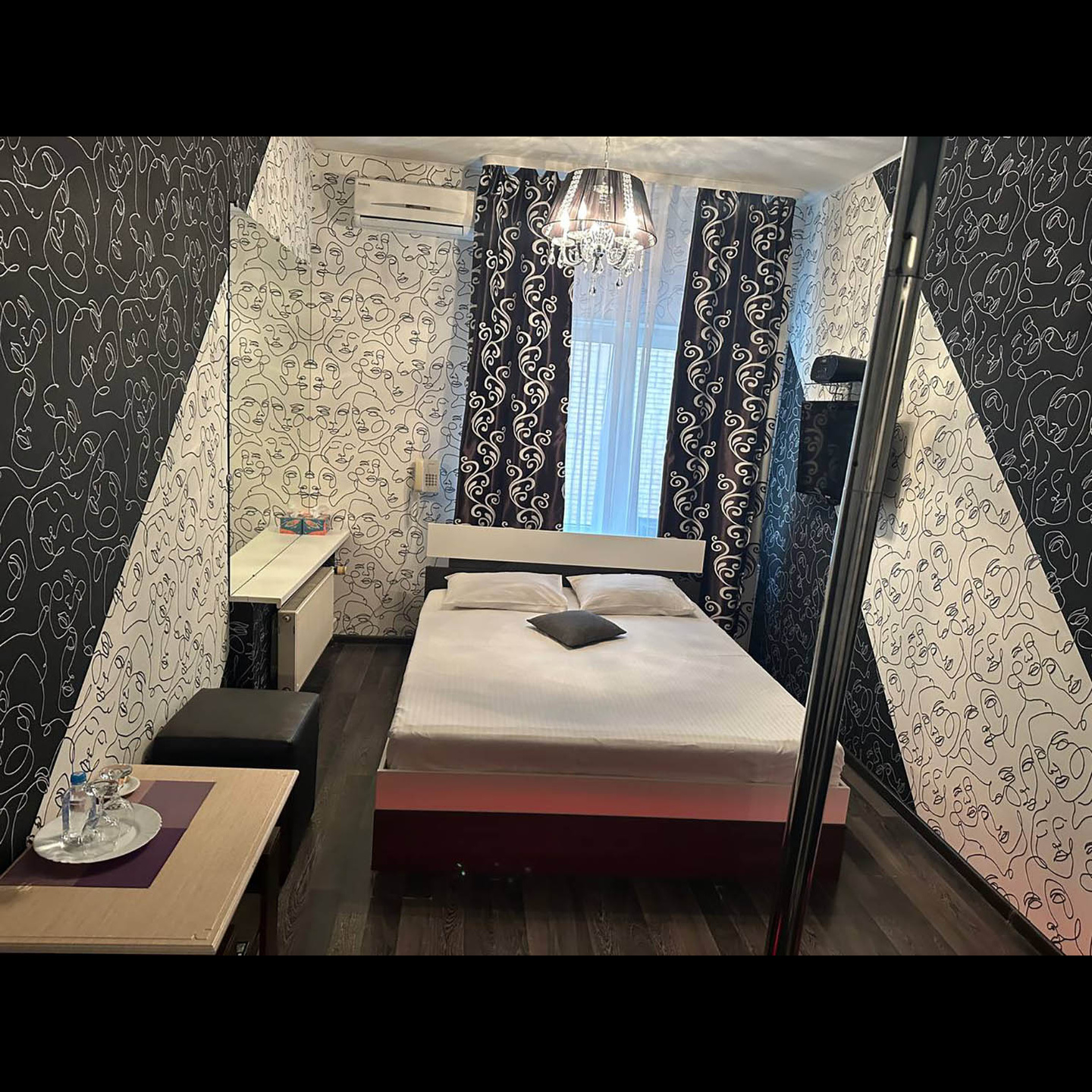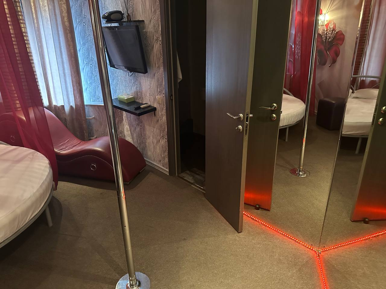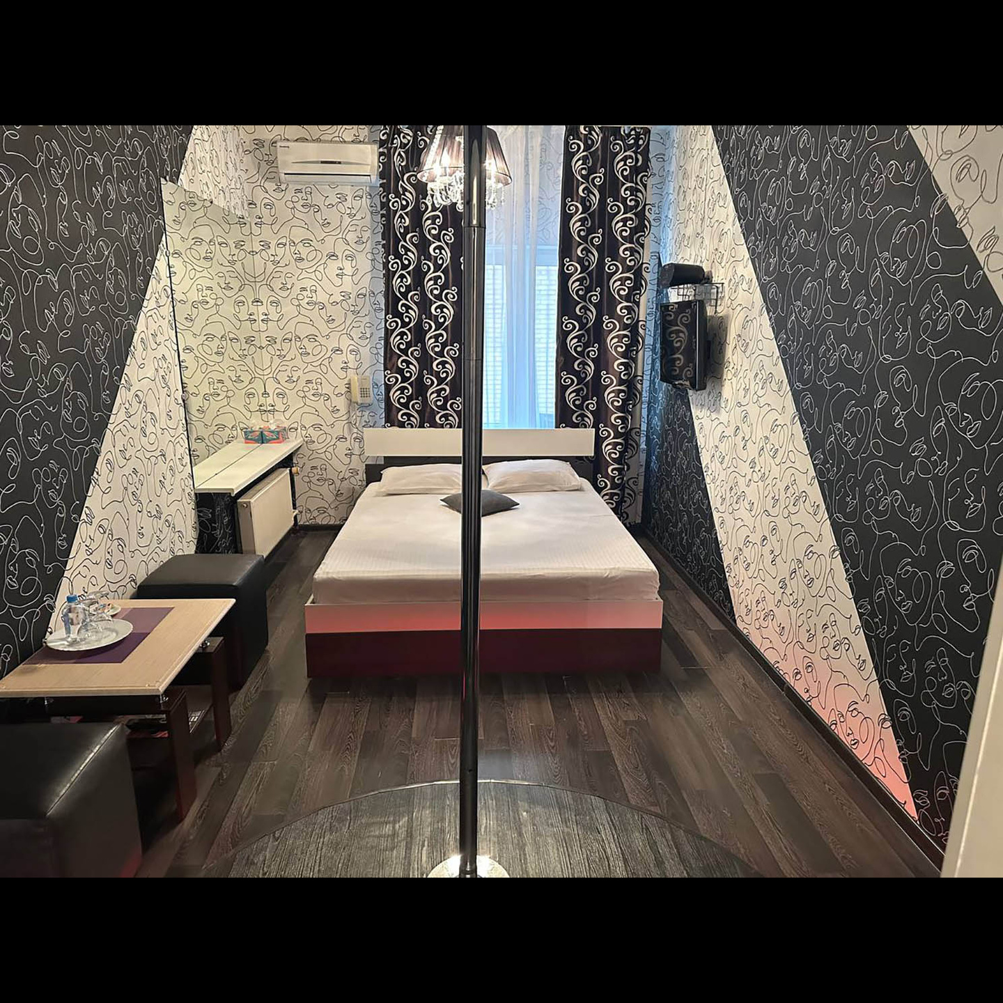 Один из лучших номеров в нашей гостинице. Выполнен в темных тонах, с джакузи в ванной комнате. Есть пилон на подиуме с подсветкой. *штатив .