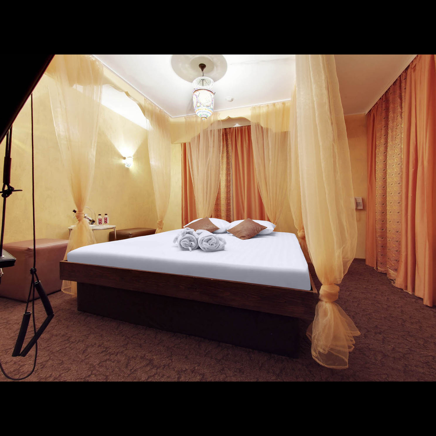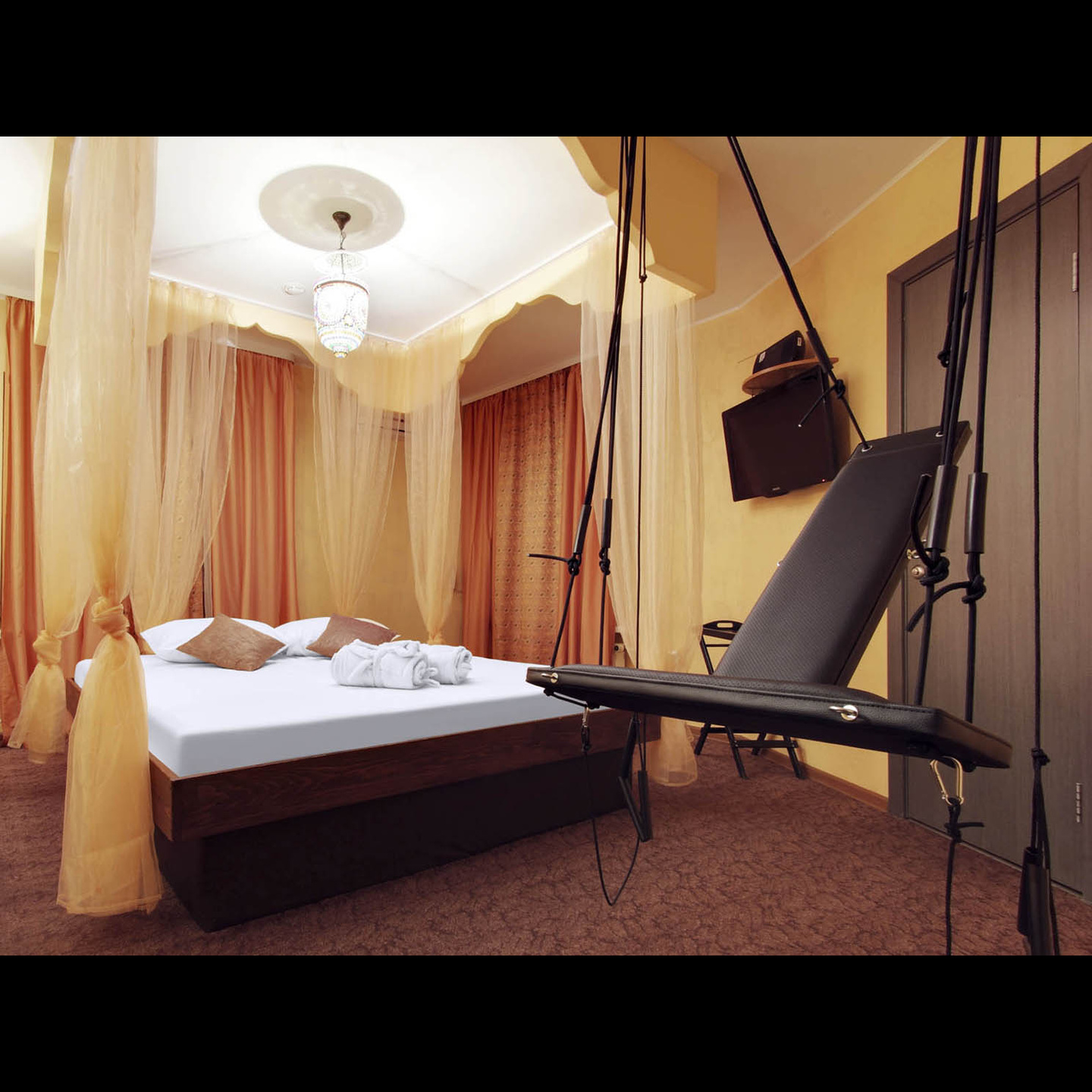 Комната выполнена в восточном стиле в нежных персиковых тонах с роскошной двуспальной кроватью под балдахином *любовные качели.