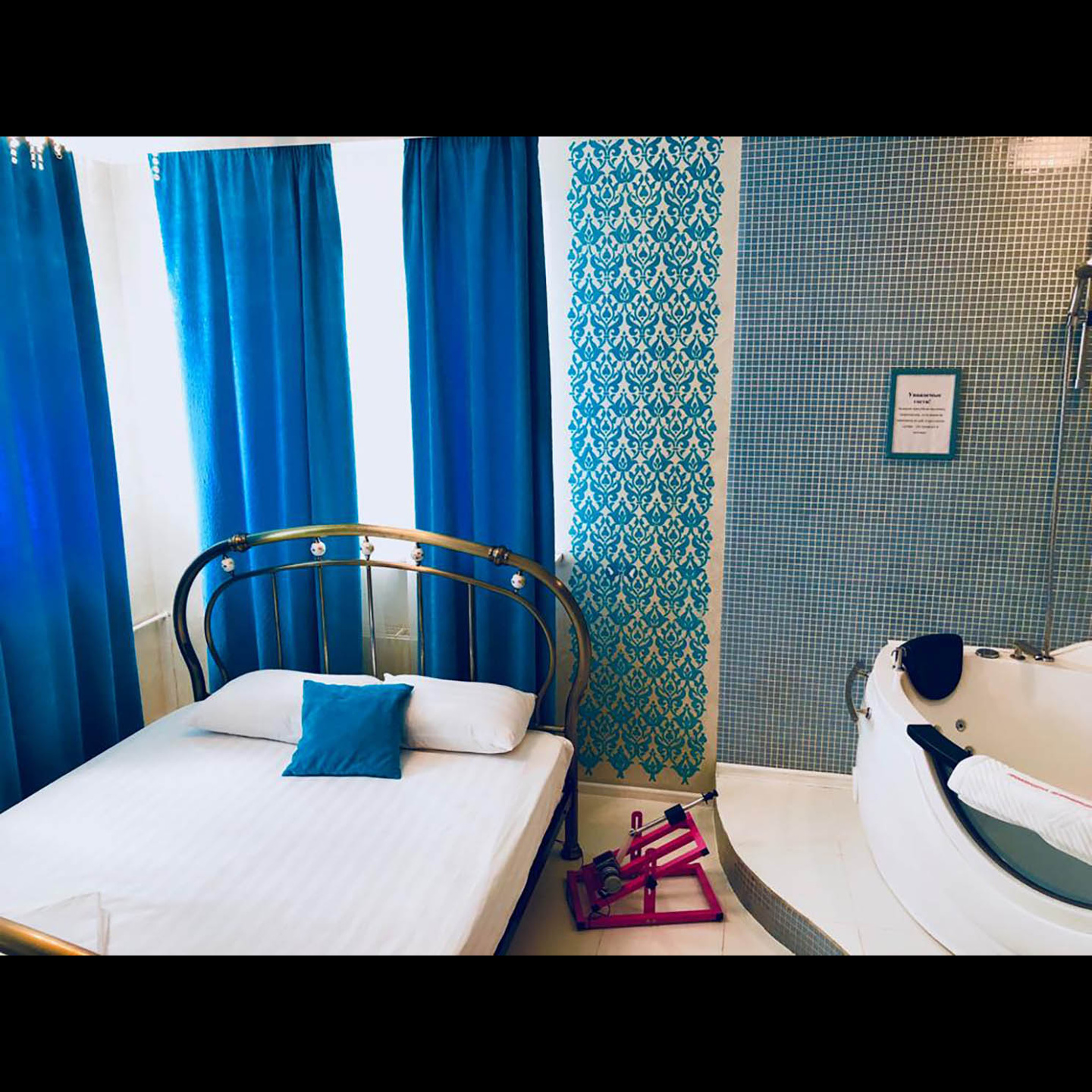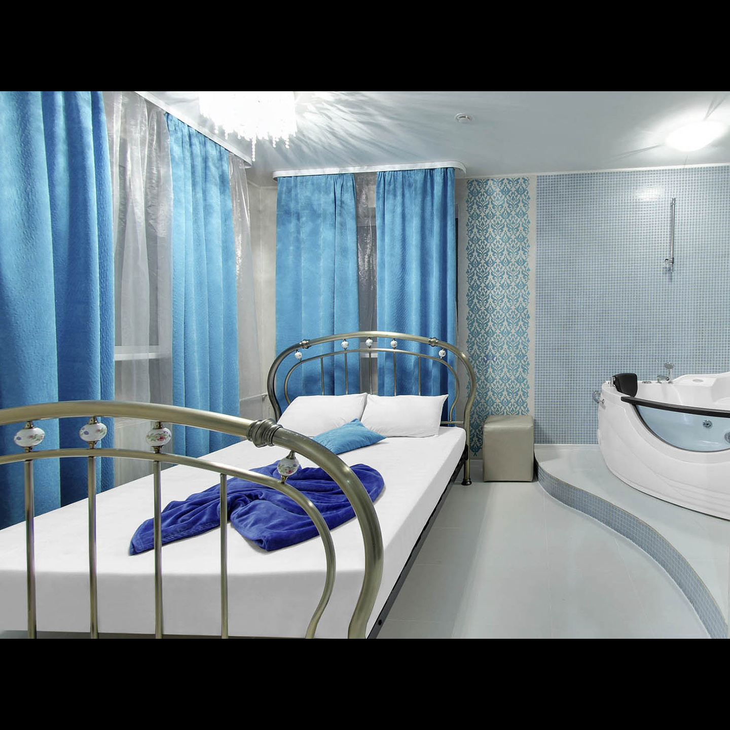 Один из самых роскошных номеров в нашей гостинице! Выполнен в бирюзовых тонах. Интересное размещение гидромассажной ванны прямо в комнате! * лав-машина "Казанова".