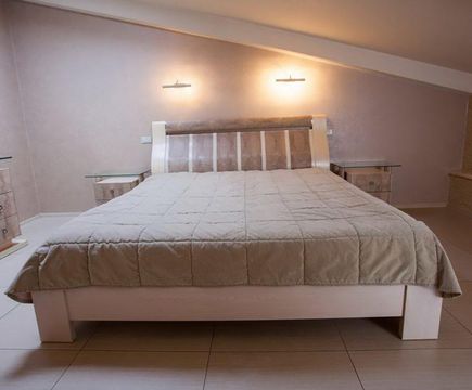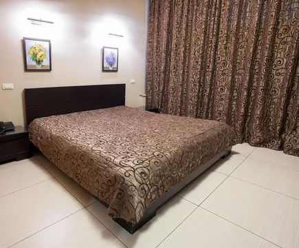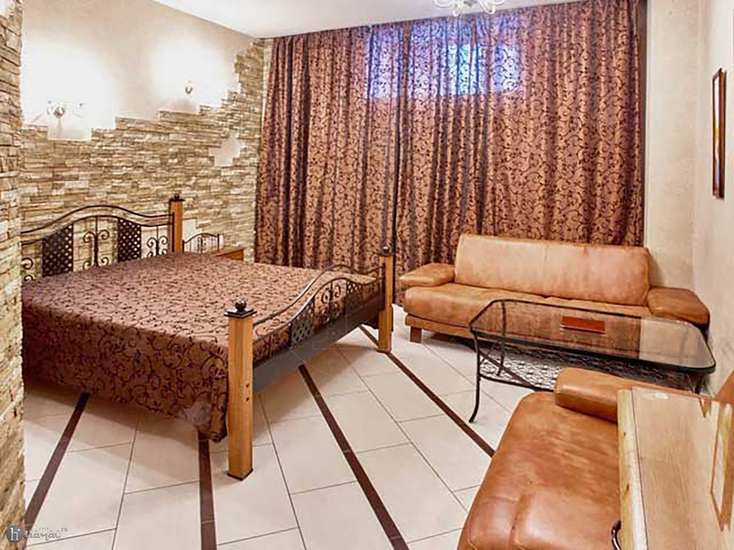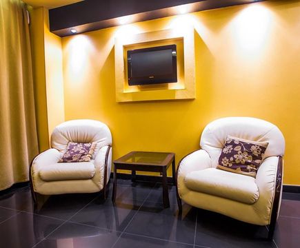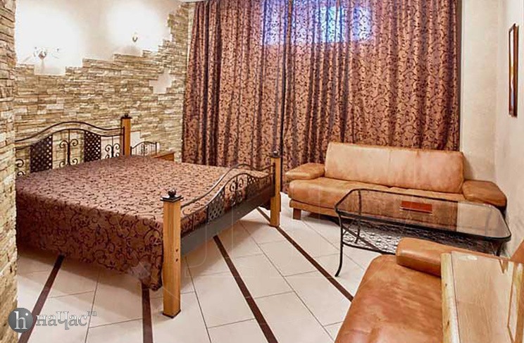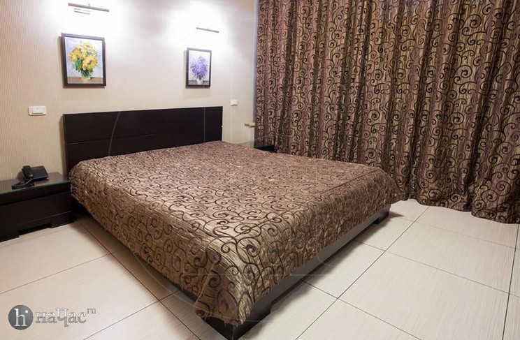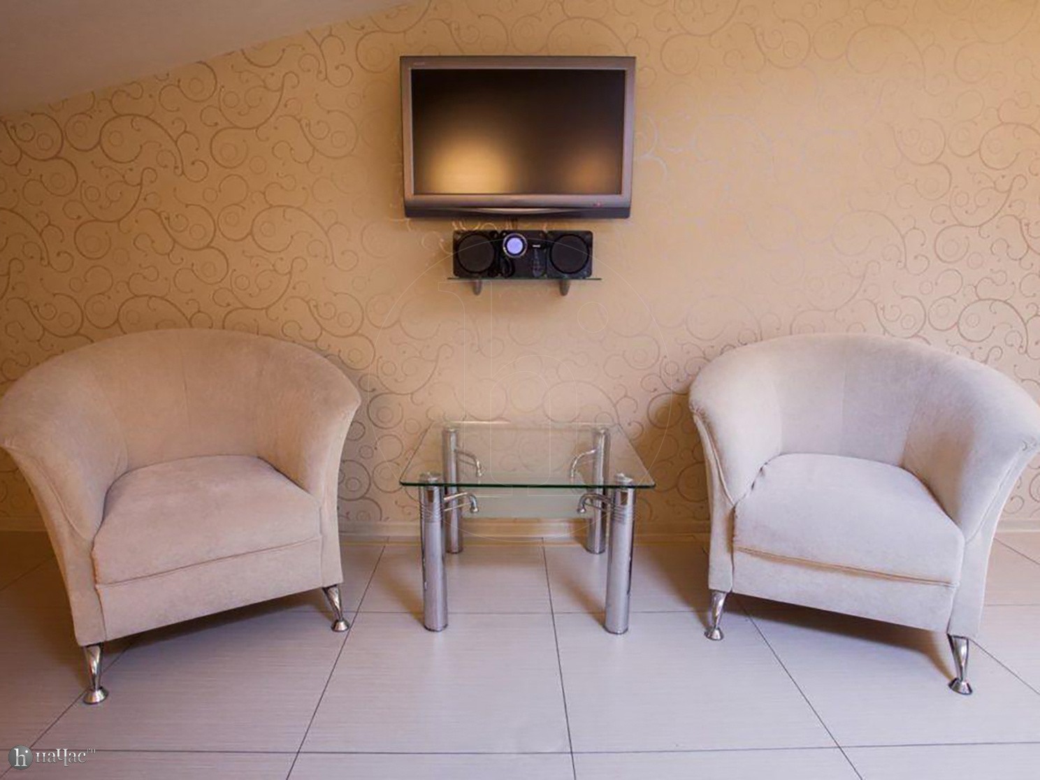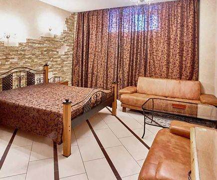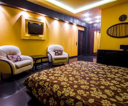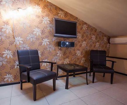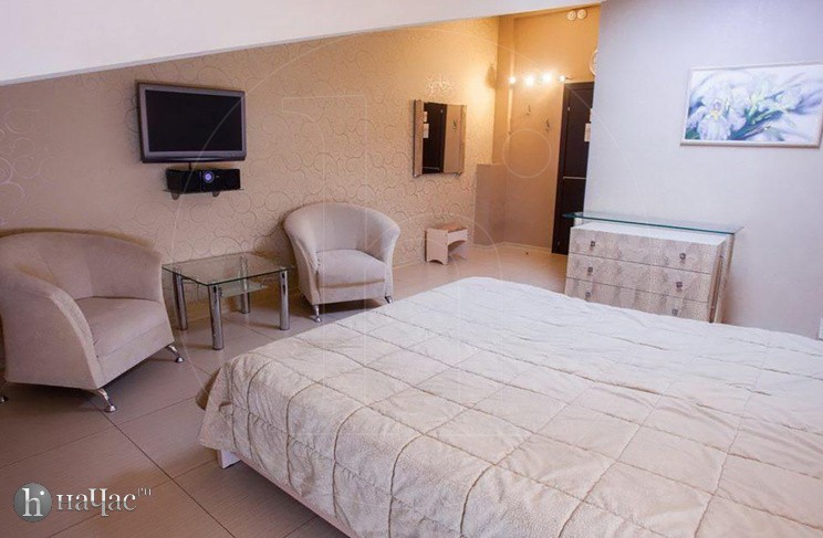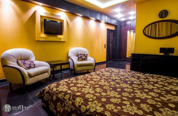 В этом номере с почасовой оплатой есть все, что нужно для встречи. Конечно, это кровать KING SIZE 200х180 см. Отдых на ней будет комфортным, как и на двух кожаных креслах. Прикроватные тумбочки подойдут для мобильных телефонов и каких-либо вещей, которые должны быть под рукой. Настенные светильники для чтения можно включить, убрав основной свет. Тогда атмосфера будет максимально уютной.