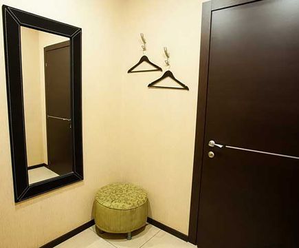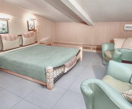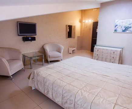Внутри вы найдете все, что вам нужно. В этом номере на час или два, а может и на всю ночь, для вас готовы светлая кровать KING SIZE 160х180 см, прикроватные тумбы, трюмо и настенные светильники. Напротив – два кожаных кресла, в которых так приятно расслабиться. Ванная комната с душевой кабинкой находится в номере.