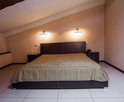 Номер в отеле Тукан на мансардном этаже с огромной круглой кроватью – вариант для вас. В романтической обстановке вдвоем вам будет комфортно и хорошо.