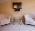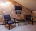 Для гостей установлены трюмо, телевизор с плоским экраном, современный DVD проигрыватель с акустической системой. Выпить чашку чая или кофе можно за коктейльным столиком. Если захотите заказать еду в номер – работает телефон для связи внутри отеля. Конечно, есть кондиционер и всем выдается гигиенический набор. Стаканы, штопор и подсвечник – скромные, но важные детали. Для откидывания мансардных окон есть стержень, так что вы всегда сможете увидеть прекрасное небо.