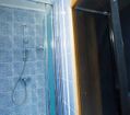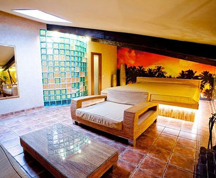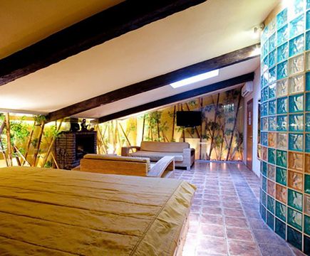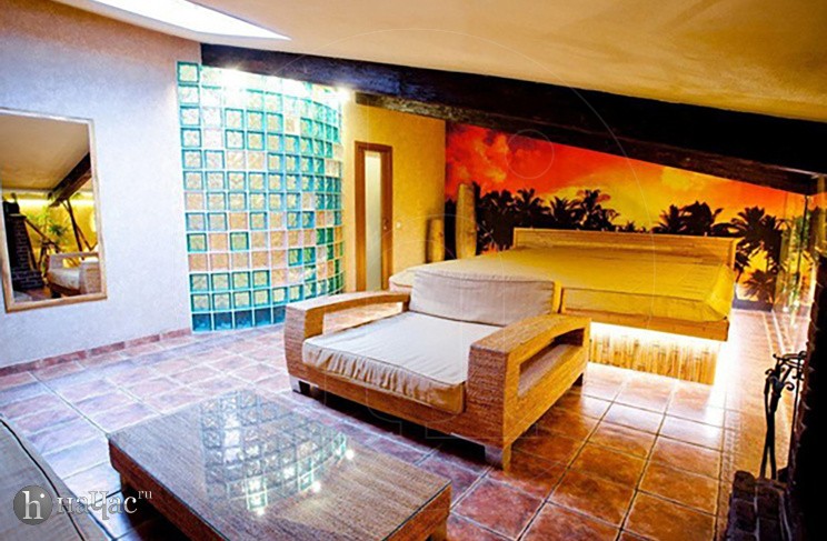 Обратите внимание на кровать, она большая и удобная, не постаменте. Это значит, что ваша фантазия точно не будет скучать. Кроме того, вам понравится перегородка из разноцветных стеклянных блоков. Она отделяет помещение для отдыха от ванной комнаты. Полупрозрачные блоки делают эти апартаменты на час еще более соблазнительными.