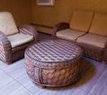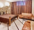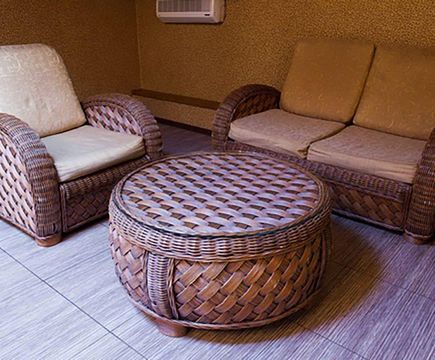 Вам будет здесь комфортно и хорошо даже ночью. Два торшера вмонтированы в изголовье, можно сделать мягкое освещение. В нашей гостинице с почасовой оплатой во всех номерах есть ванные комнаты в том числе с душевой кабиной. В этом варианте для вас представлены также: диван и кресло из ротанга с мягкими подушками, коктейльный столик, трюмо, телевизор, музыкальный DVD проигрыватель с акустической системой, телефон для звонков внутри отеля. Приятные мелочи – стаканы, подсвечник и штопор. Все гости получают гигиенический набор для душа.