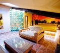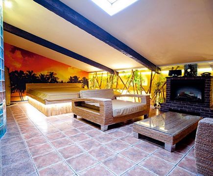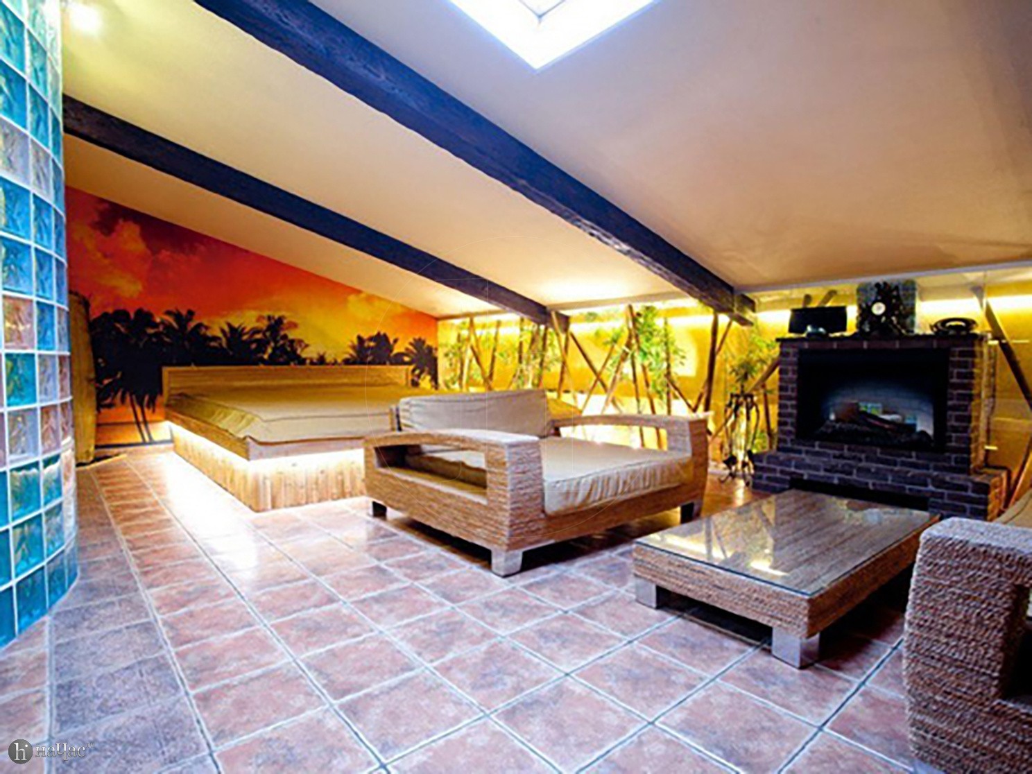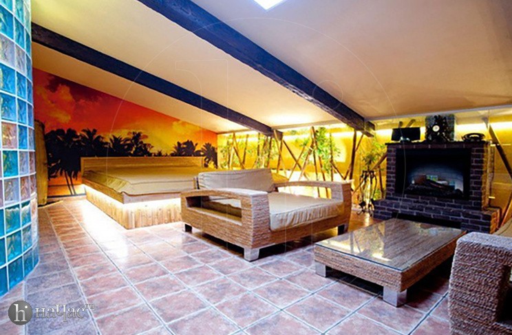 Вы когда-нибудь отдыхали на вилле охотника? Наверняка, нет. Зато благодаря отелю Тукан такая возможность у вас теперь есть. Забронировав этот номер, вы окажетесь в мире ярких красок и интересных деталей. Потолок стилизован под загородный домик, стены – будто джунгли. На самом деле это зимний сад с подсветкой по периметру номера. Большой камин делает пространство очень уютным.