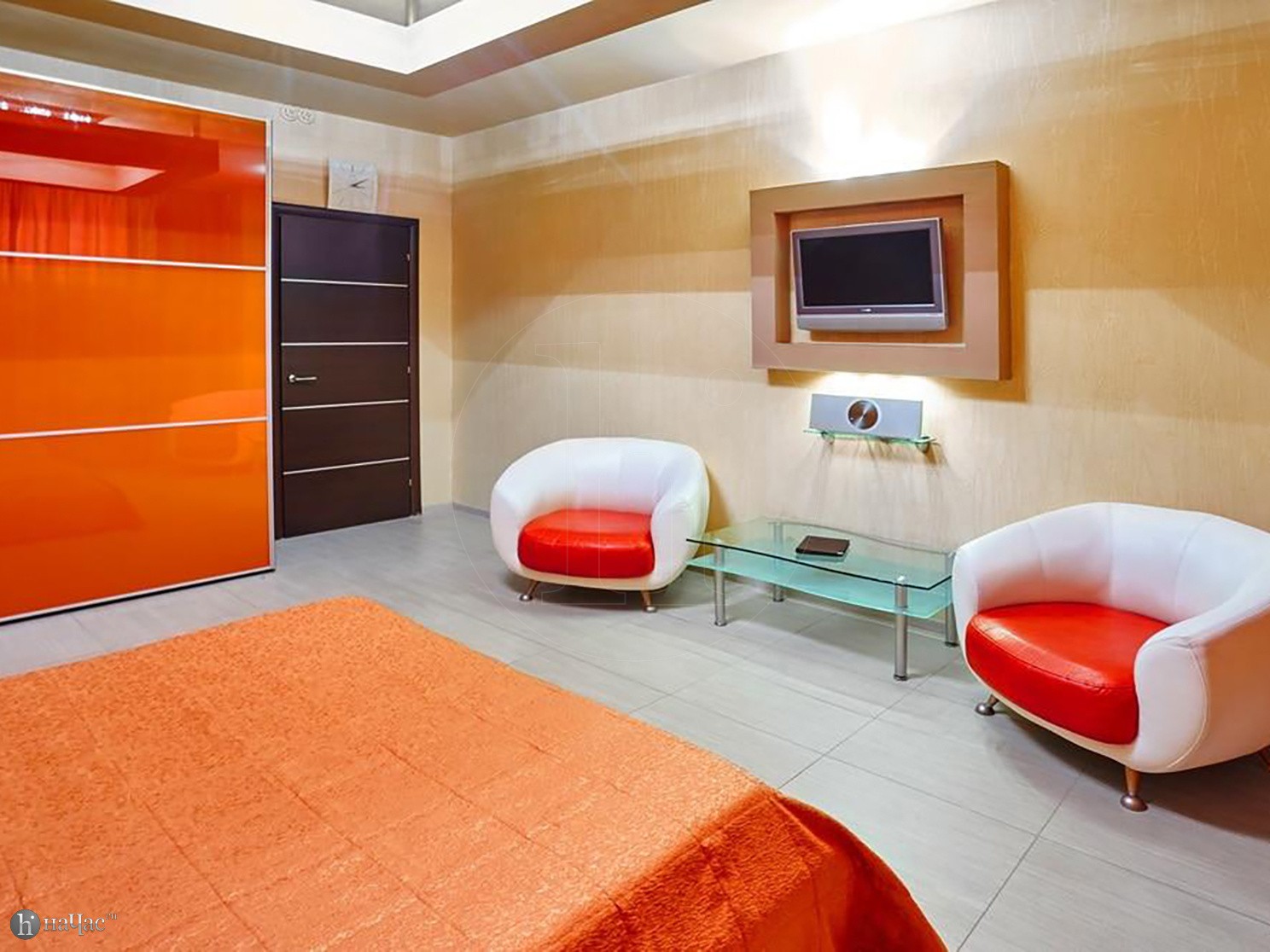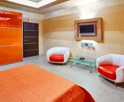 Любите все яркое и необычное? Тогда вам понравится недорогой номер с почасовой оплатой в оранжевых тонах в нашем отеле. Скучно здесь точно не будет. Эмоции, страсть и только хорошее настроение вам гарантированы.