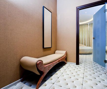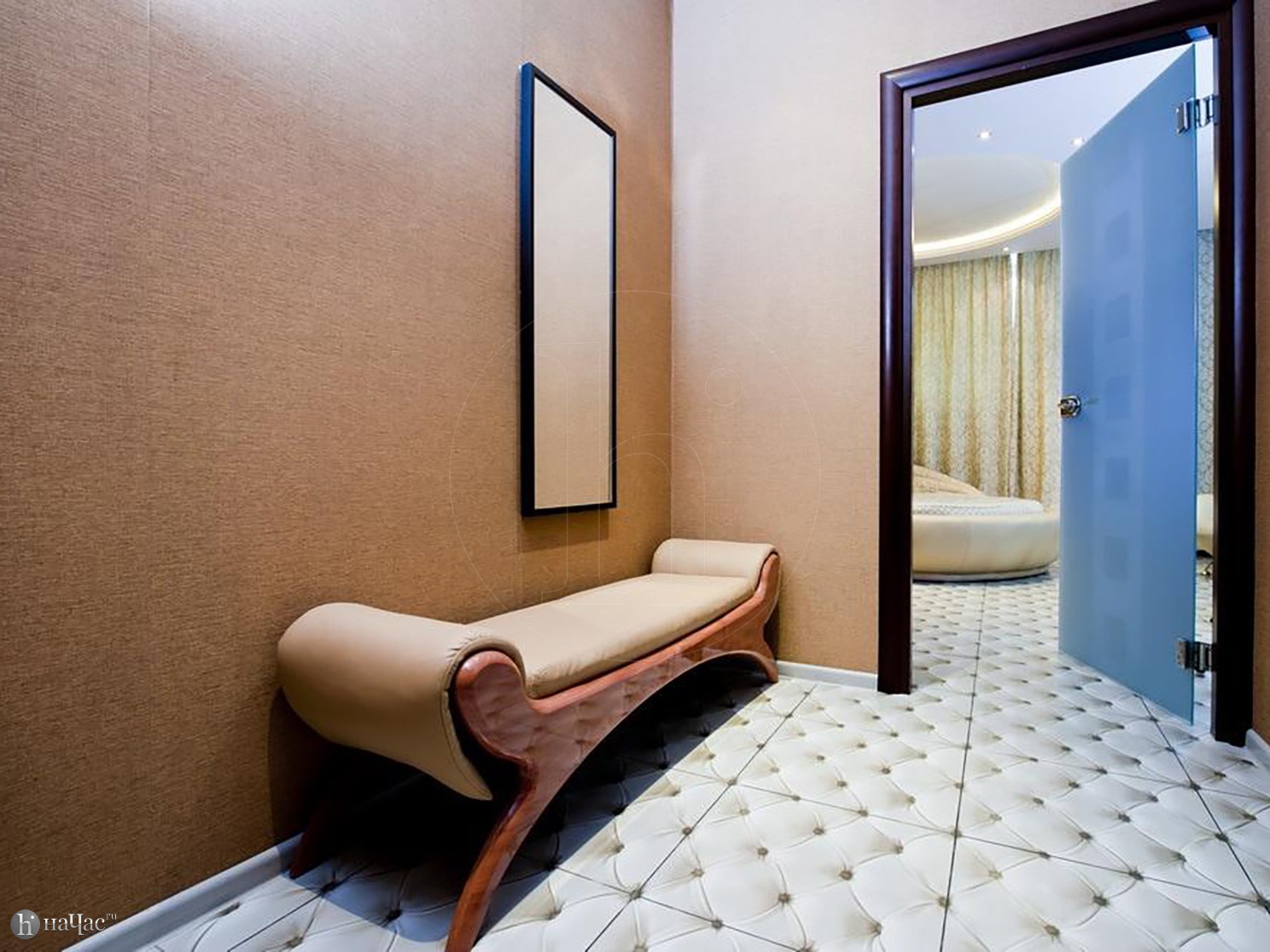 Интерьер выполнен в спокойных тонах. Кофейно-молочные стены и акценты в стиле шебби-шик (направление в интерьере, созданное в Австрии) делают этот почасовой номер почти домашним. Только вам никто не мешает наслаждаться обществом друг друга.
