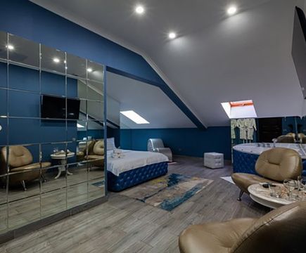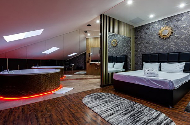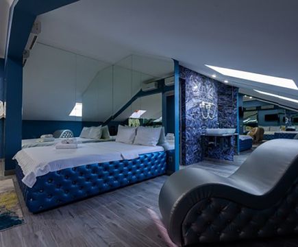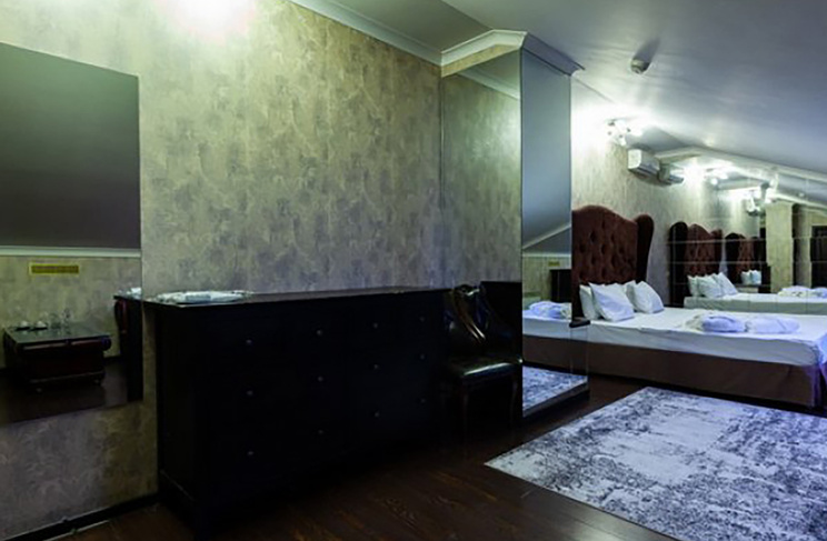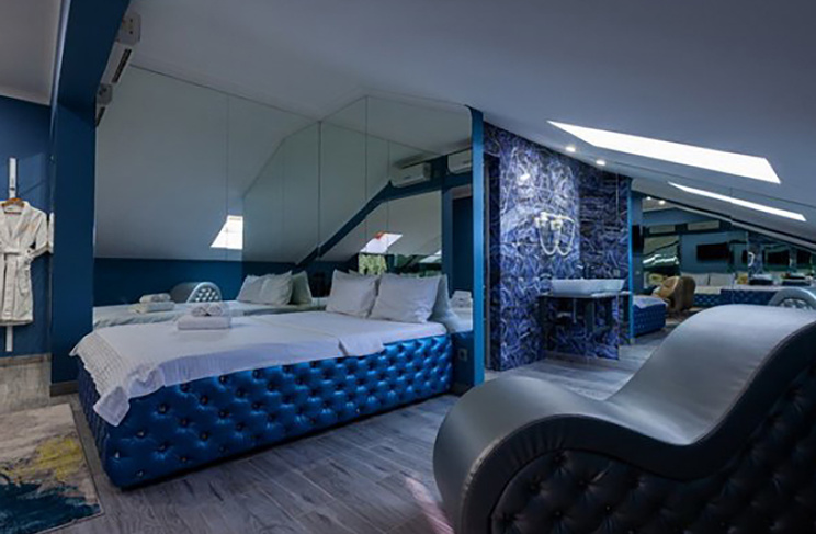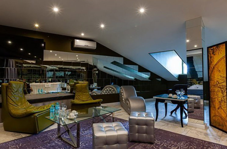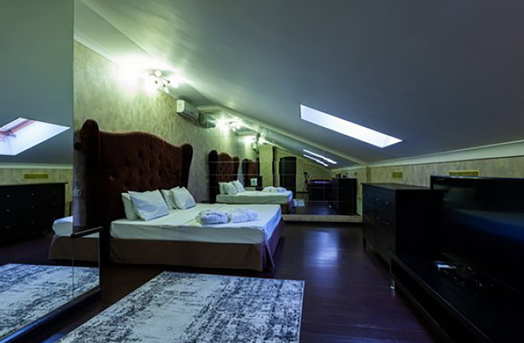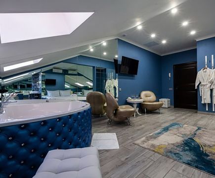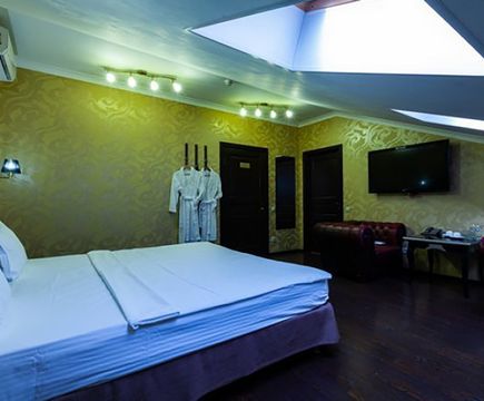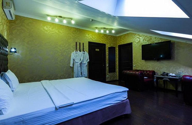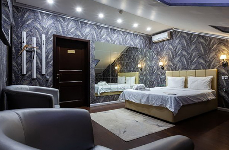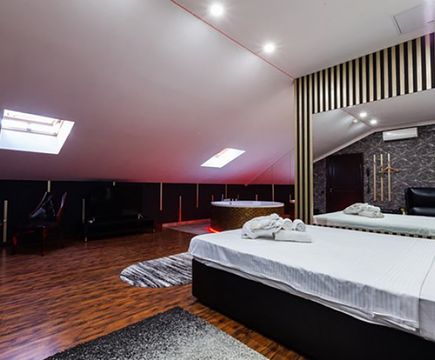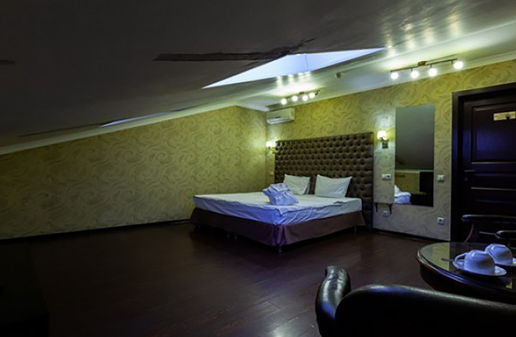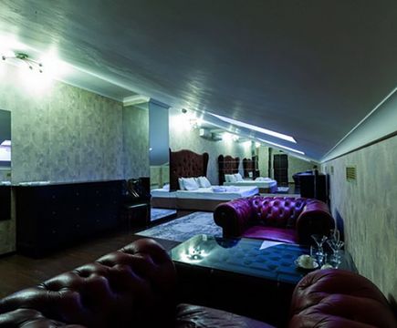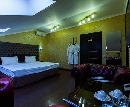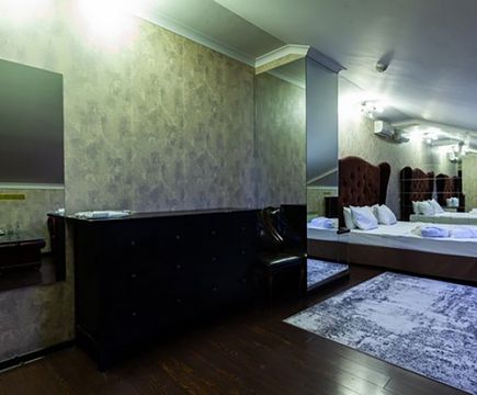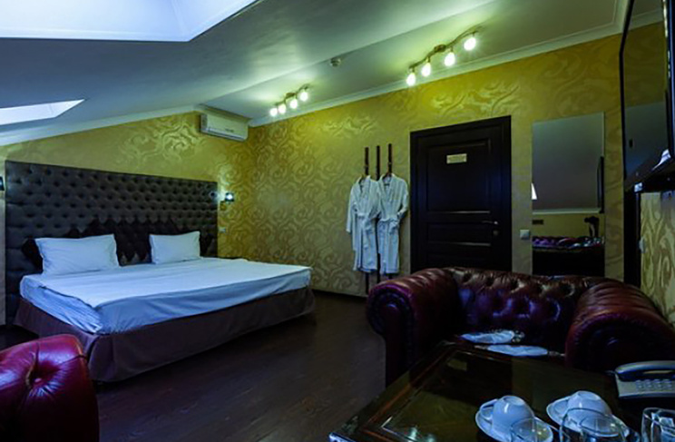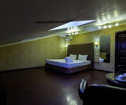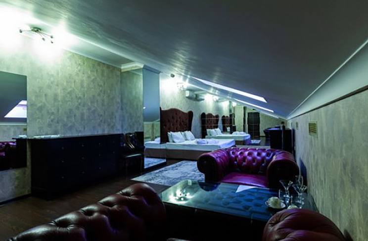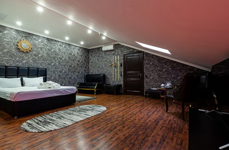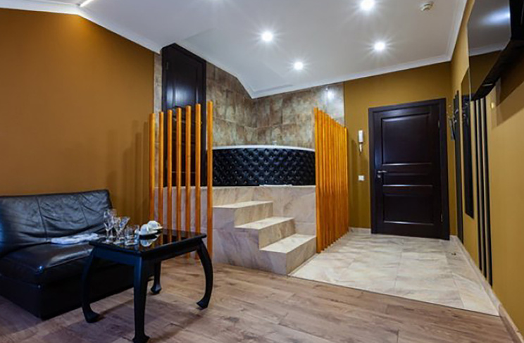 Апартаменты включают 10 помещений: 4 люкса в стиле хай-тек с прямоугольными двуспальными кроватями с кожаным изголовьем, мебелью из натуральных материалов и мансардными окнами; 2 стандарта — это вместительная комната в духе «ампир» и уютный уголок с чертами «минимализма»; 2 люкса с джакузи в разном цветовом наполнении: один в спокойной сине-голубой гамме, другой — в торжественной черно-золотой обстановке. Уникальный De Lux c освещением — имитацией звездного неба, зеркальным потолком, и английский люкс с мозаичным джакузи представлены в современном стиле «модерн» с элементами направления лофт. В каждом номере есть мини-бар. Возможно использование просторных помещений для проведения фотосессии, дружеских вечеринок и романтических свиданий влюбленных. Воспользоваться услугами отеля могут и новобрачные, роскошная мебель, мозаика и интерьерные детали в духе ампир и лучших традиций классики подарят уют и незабываемые впечатления посетителям.