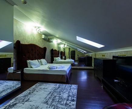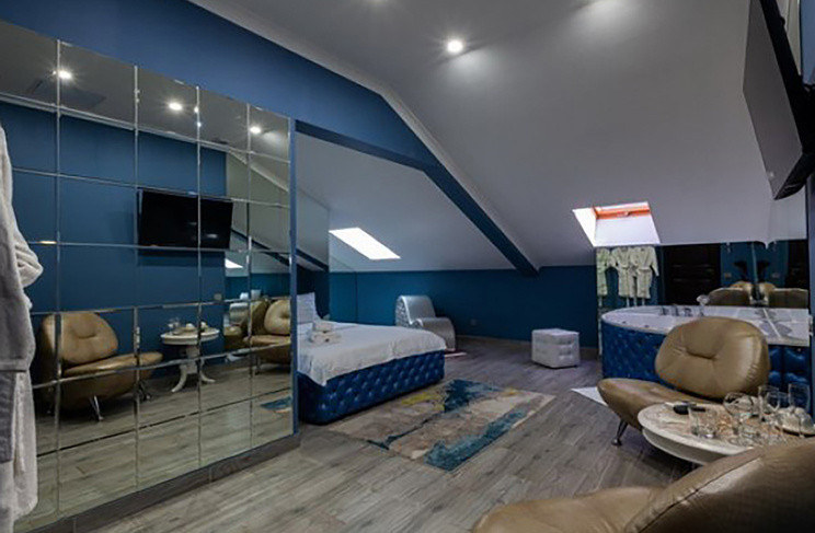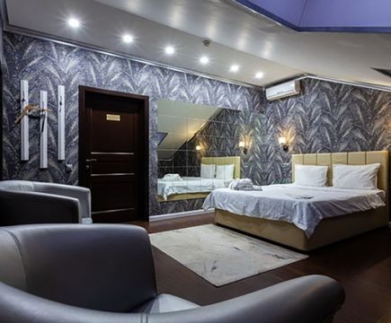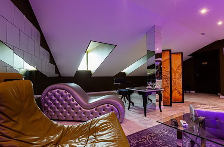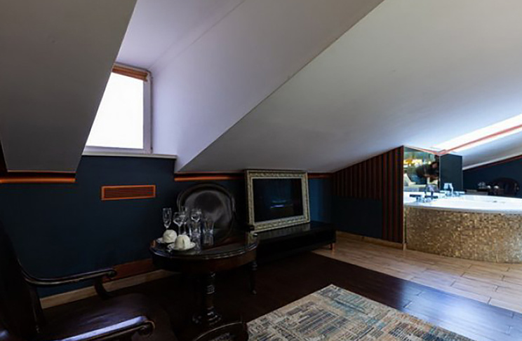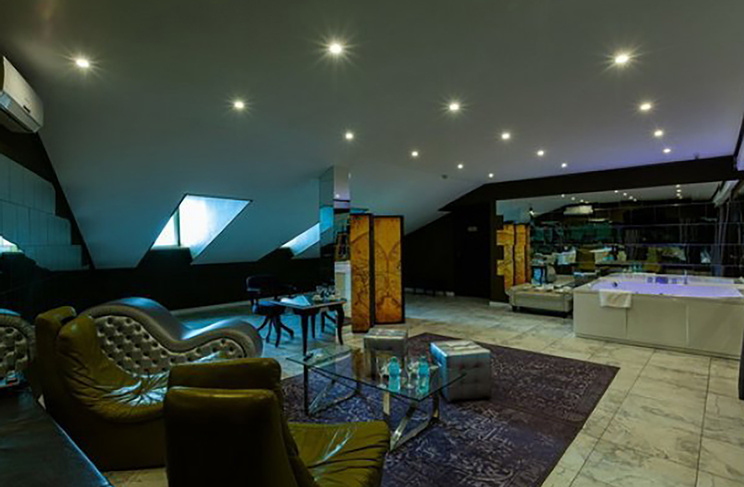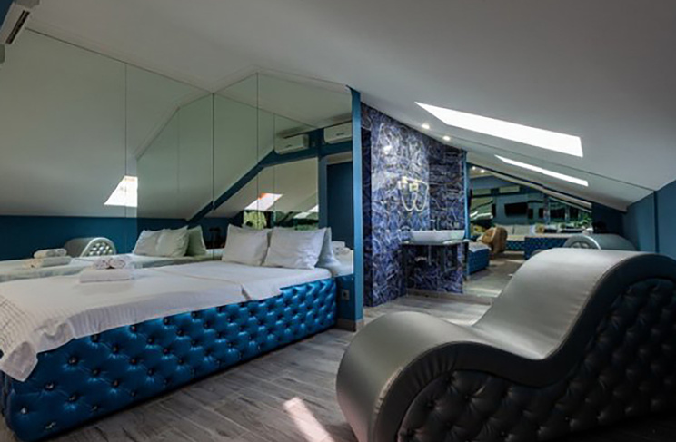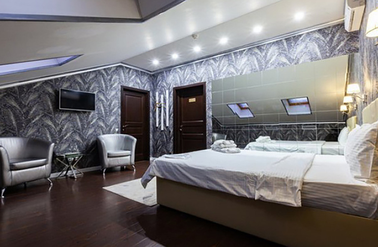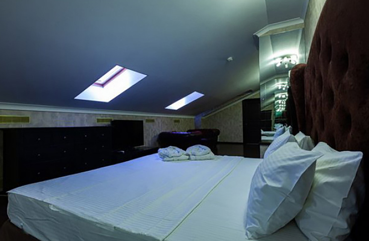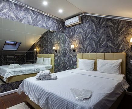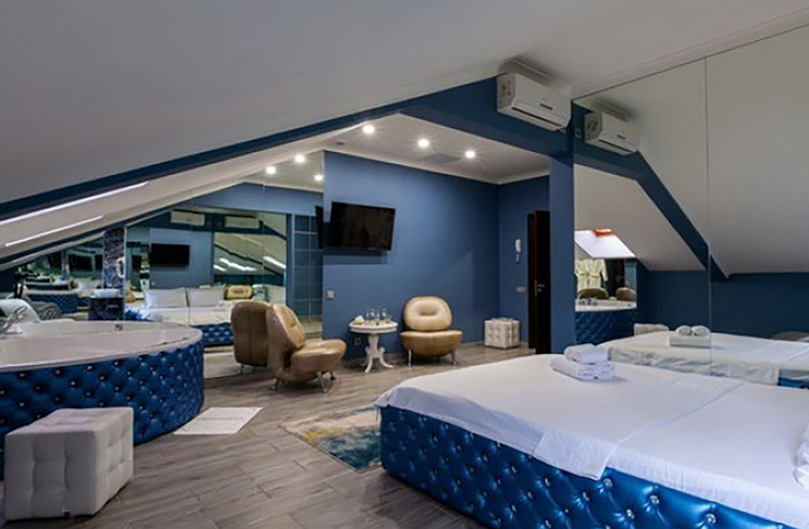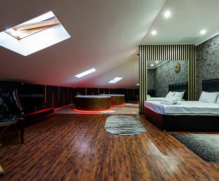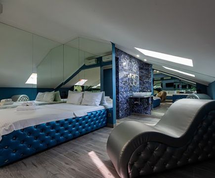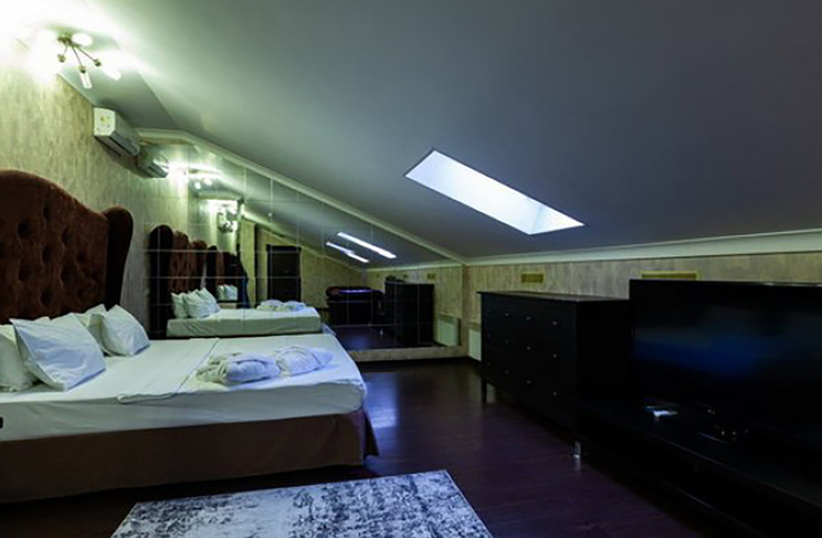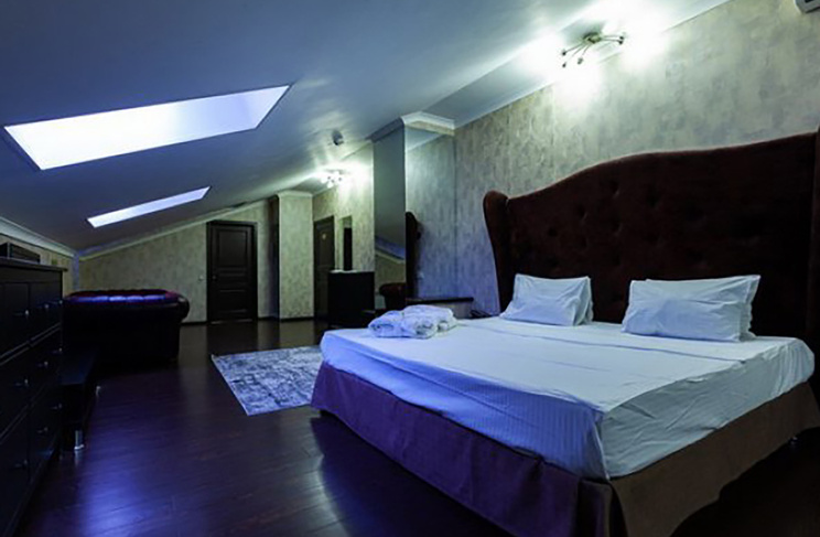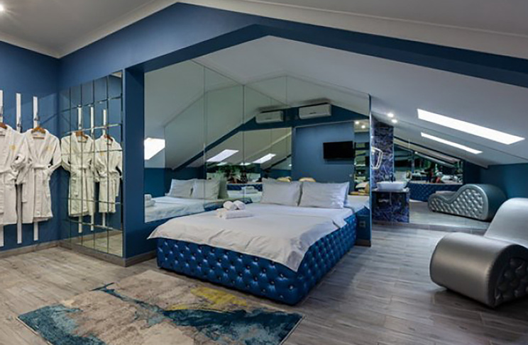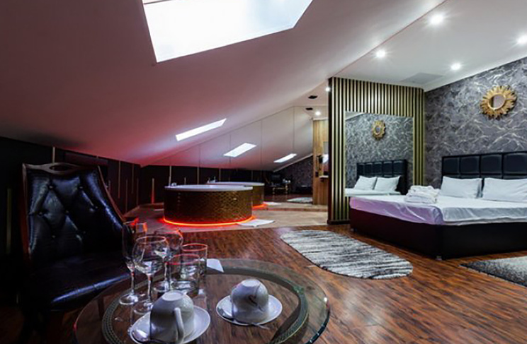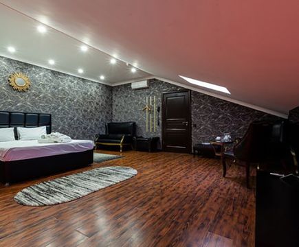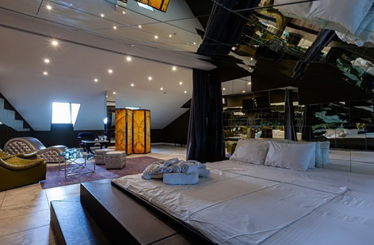 Апартаменты включают 10 помещений: 4 люкса в стиле хай-тек с прямоугольными двуспальными кроватями с кожаным изголовьем, мебелью из натуральных материалов и мансардными окнами; 2 стандарта — это вместительная комната в духе «ампир» и уютный уголок с чертами «минимализма»; 2 люкса с джакузи в разном цветовом наполнении: один в спокойной сине-голубой гамме, другой — в торжественной черно-золотой обстановке. Уникальный De Lux c освещением — имитацией звездного неба, зеркальным потолком, и английский люкс с мозаичным джакузи представлены в современном стиле «модерн» с элементами направления лофт. В каждом номере есть мини-бар. Возможно использование просторных помещений для проведения фотосессии, дружеских вечеринок и романтических свиданий влюбленных. Воспользоваться услугами отеля могут и новобрачные, роскошная мебель, мозаика и интерьерные детали в духе ампир и лучших традиций классики подарят уют и незабываемые впечатления посетителям.