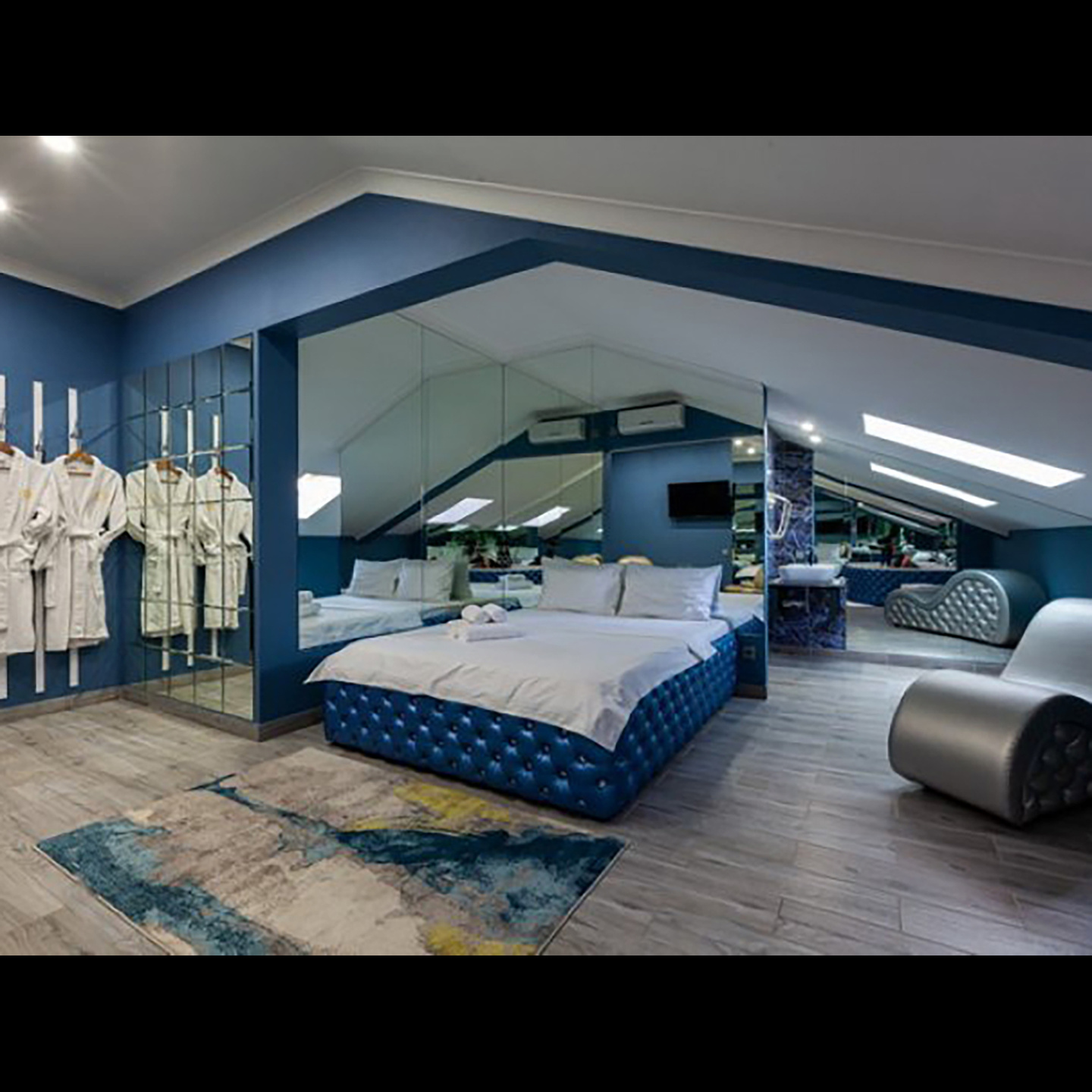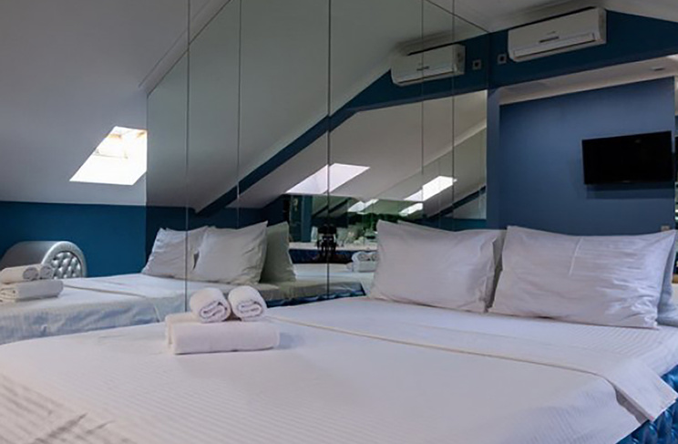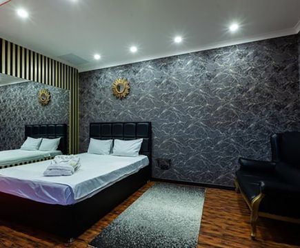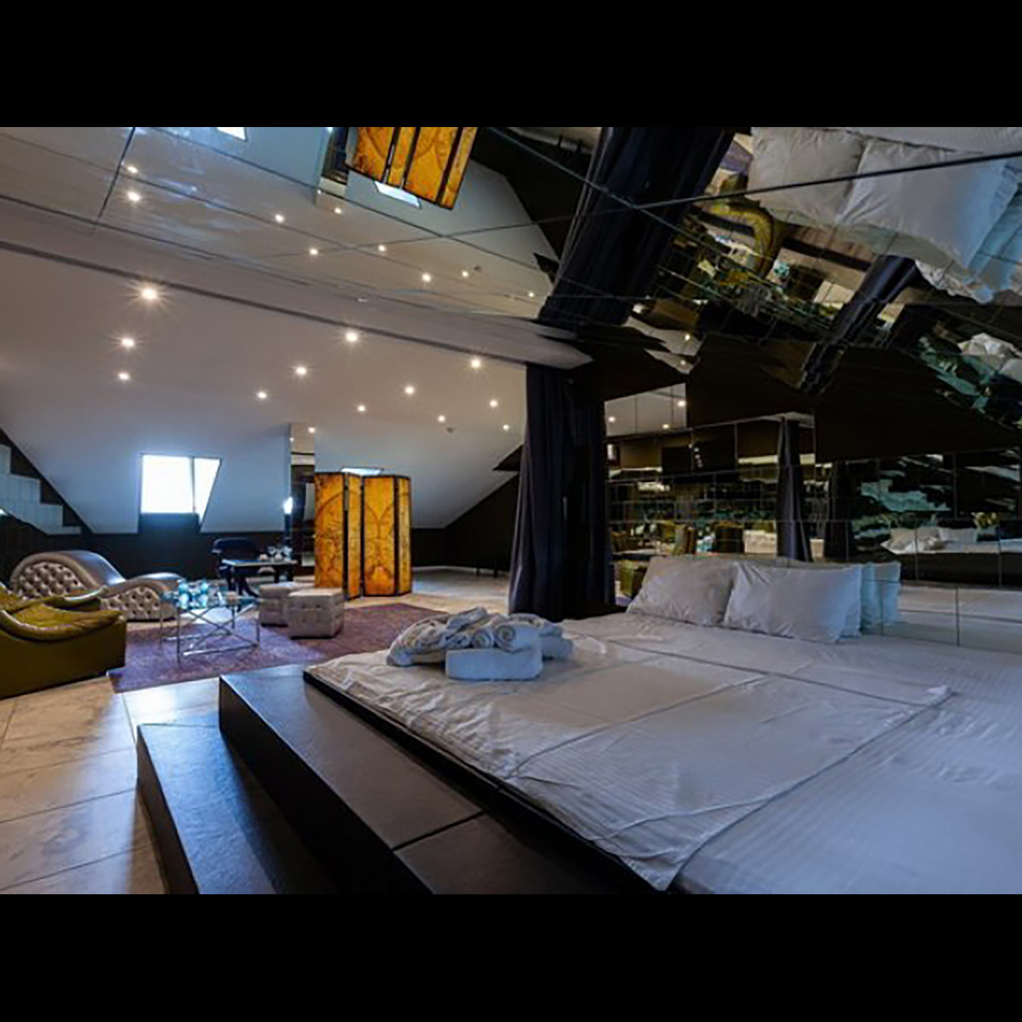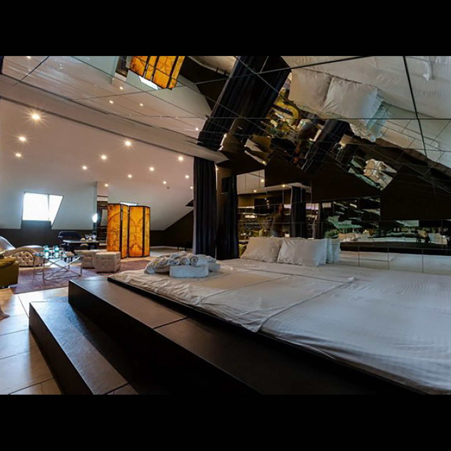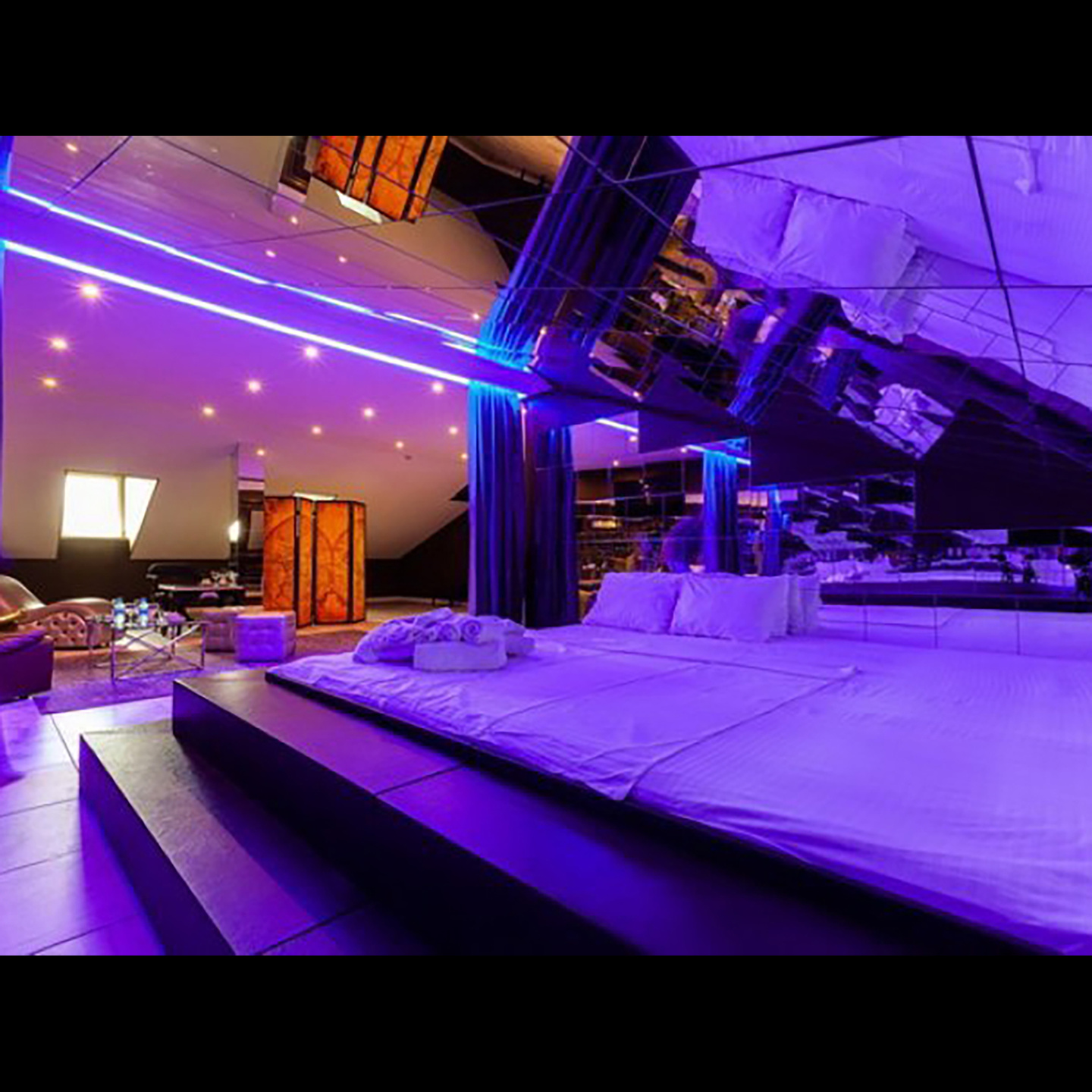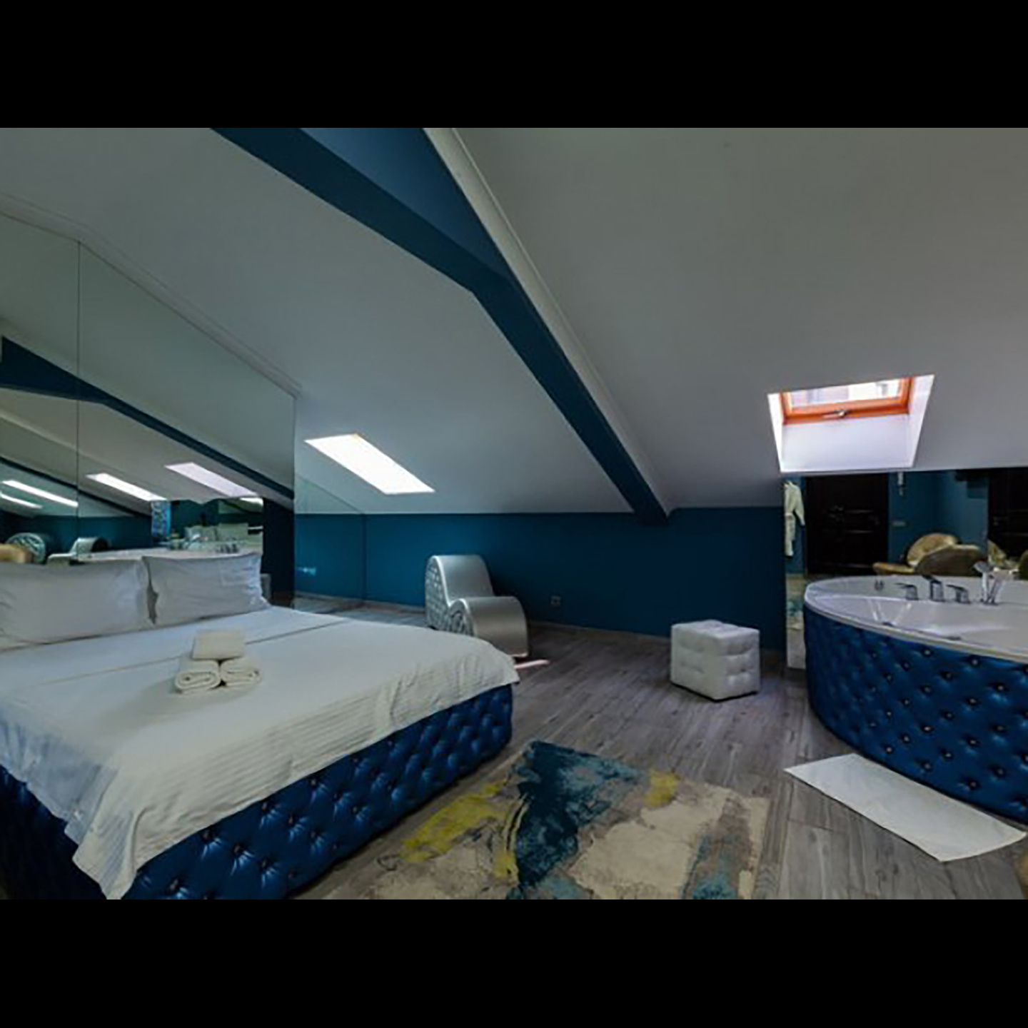 Апартаменты включают 10 помещений: 4 люкса в стиле хай-тек с прямоугольными двуспальными кроватями с кожаным изголовьем, мебелью из натуральных материалов и мансардными окнами; 2 стандарта — это вместительная комната в духе «ампир» и уютный уголок с чертами «минимализма»; 2 люкса с джакузи в разном цветовом наполнении: один в спокойной сине-голубой гамме, другой — в торжественной черно-золотой обстановке. Уникальный De Lux c освещением — имитацией звездного неба, зеркальным потолком, и английский люкс с мозаичным джакузи представлены в современном стиле «модерн» с элементами направления лофт. В каждом номере есть мини-бар. Возможно использование просторных помещений для проведения фотосессии, дружеских вечеринок и романтических свиданий влюбленных. Воспользоваться услугами отеля могут и новобрачные, роскошная мебель, мозаика и интерьерные детали в духе ампир и лучших традиций классики подарят уют и незабываемые впечатления посетителям.