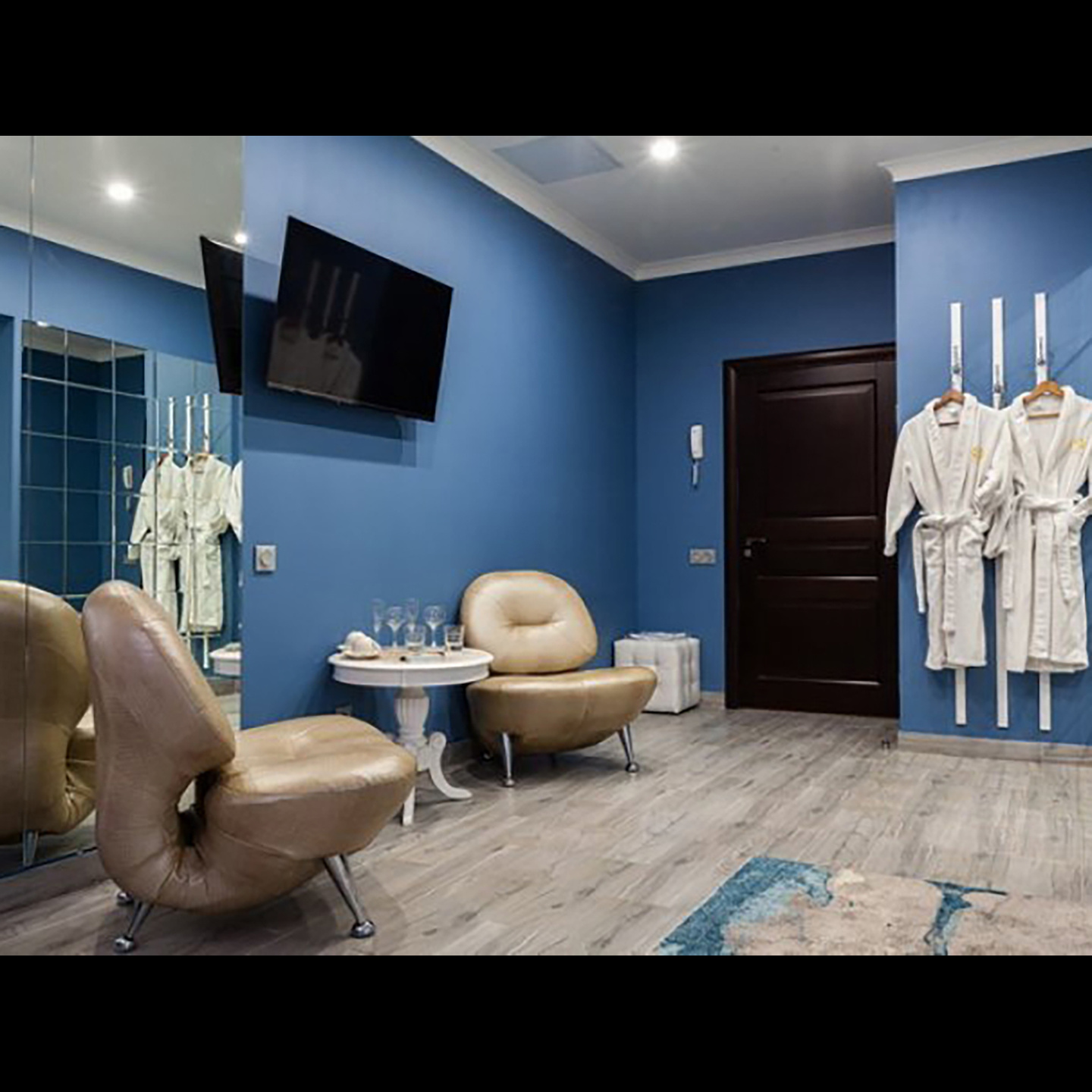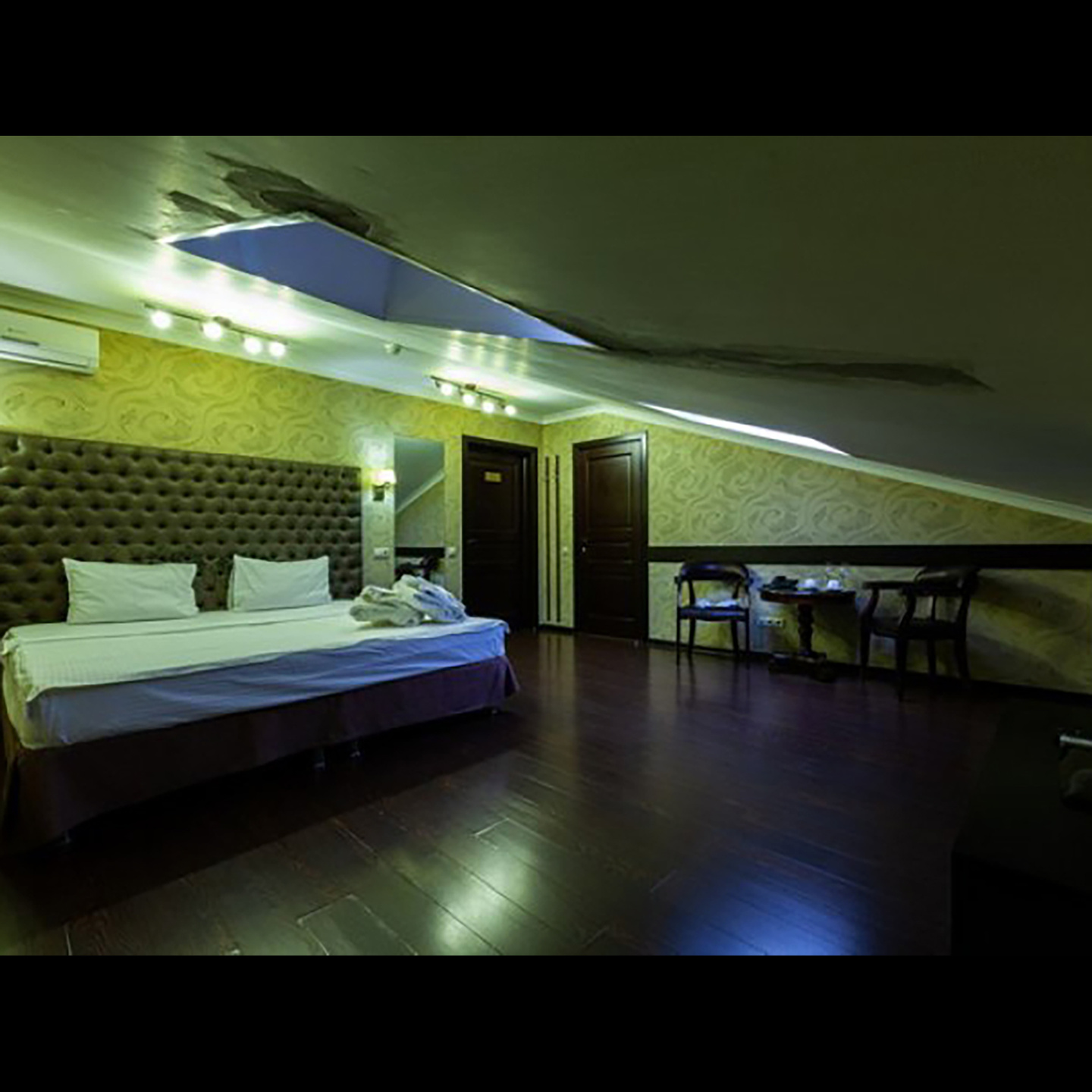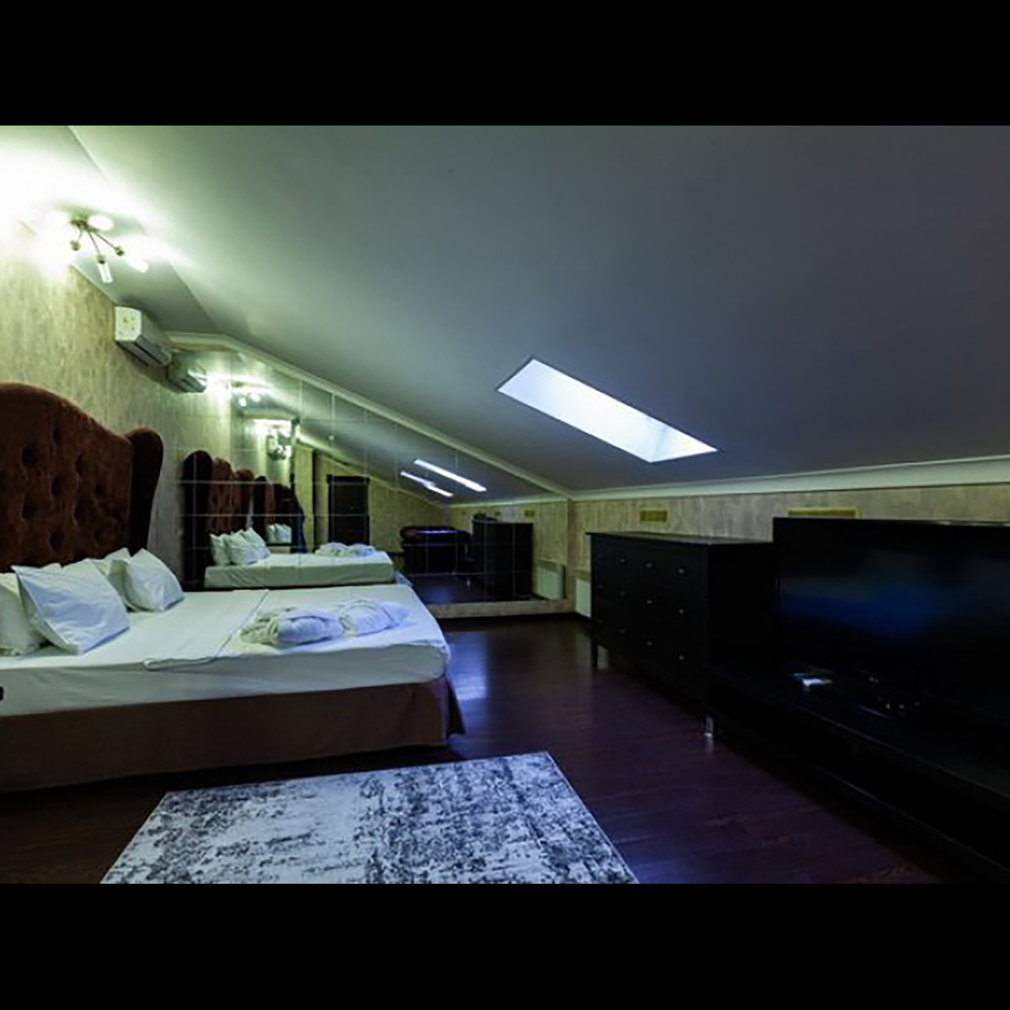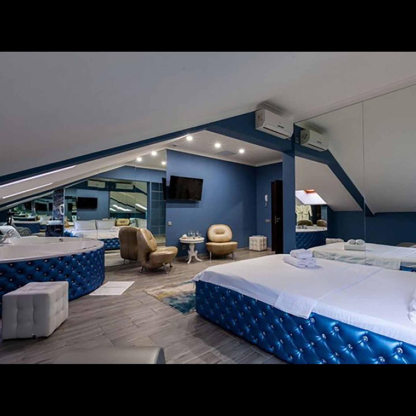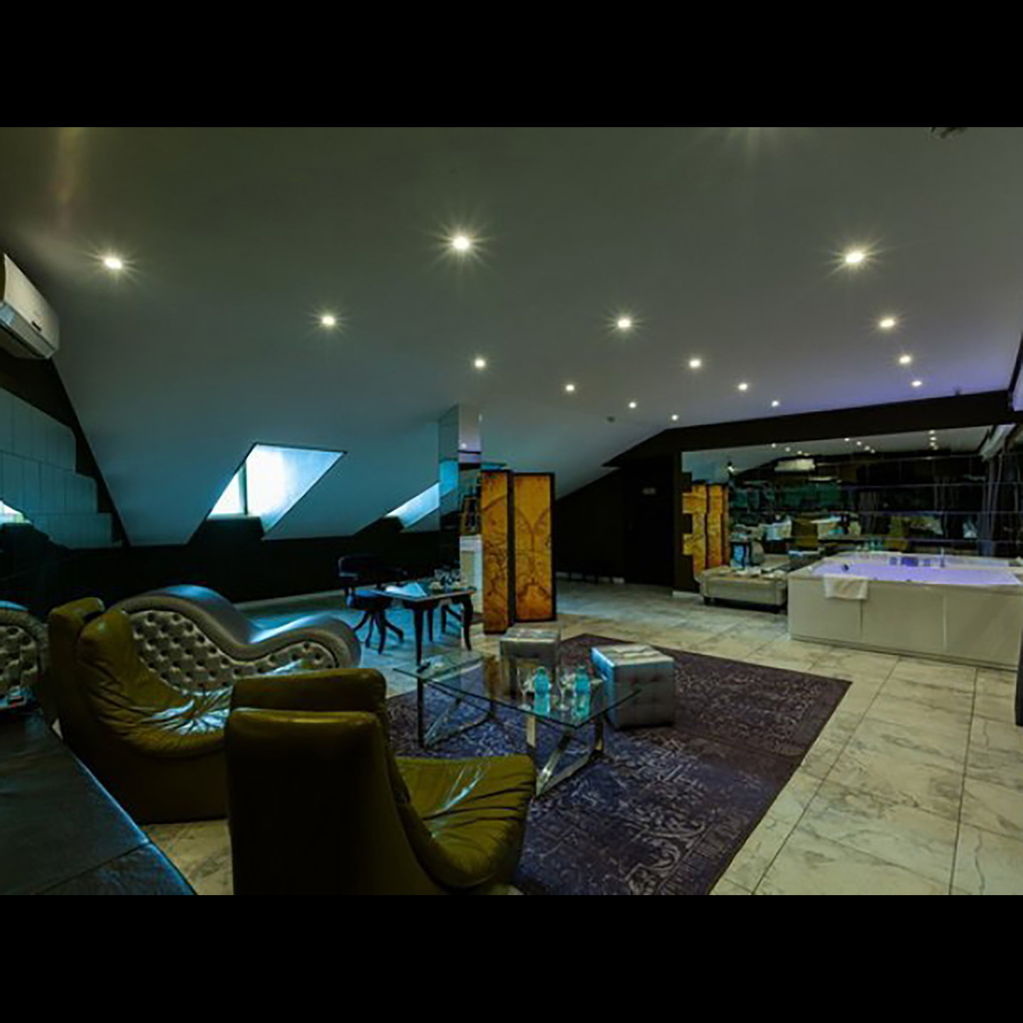 Апартаменты включают 10 помещений: 4 люкса в стиле хай-тек с прямоугольными двуспальными кроватями с кожаным изголовьем, мебелью из натуральных материалов и мансардными окнами; 2 стандарта — это вместительная комната в духе «ампир» и уютный уголок с чертами «минимализма»; 2 люкса с джакузи в разном цветовом наполнении: один в спокойной сине-голубой гамме, другой — в торжественной черно-золотой обстановке. Уникальный De Lux c освещением — имитацией звездного неба, зеркальным потолком, и английский люкс с мозаичным джакузи представлены в современном стиле «модерн» с элементами направления лофт. В каждом номере есть мини-бар. Возможно использование просторных помещений для проведения фотосессии, дружеских вечеринок и романтических свиданий влюбленных. Воспользоваться услугами отеля могут и новобрачные, роскошная мебель, мозаика и интерьерные детали в духе ампир и лучших традиций классики подарят уют и незабываемые впечатления посетителям.