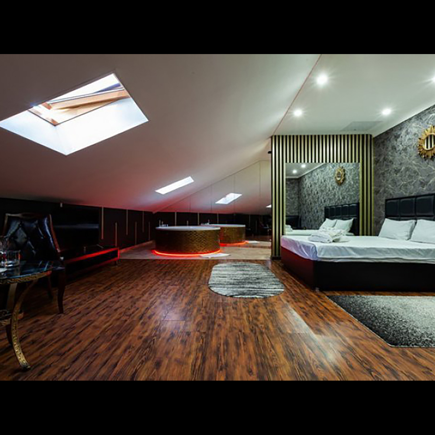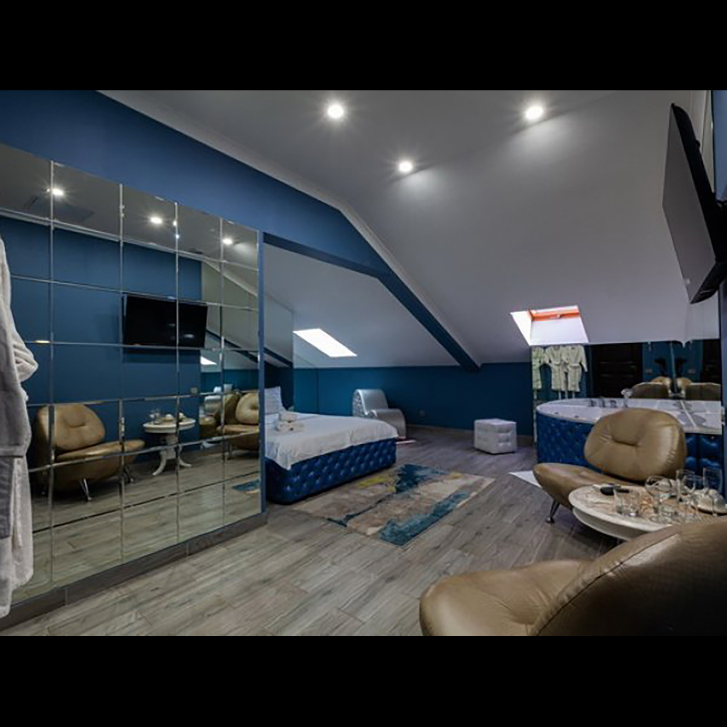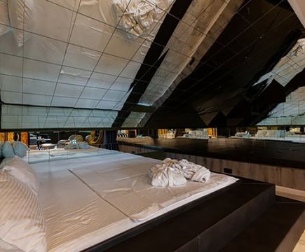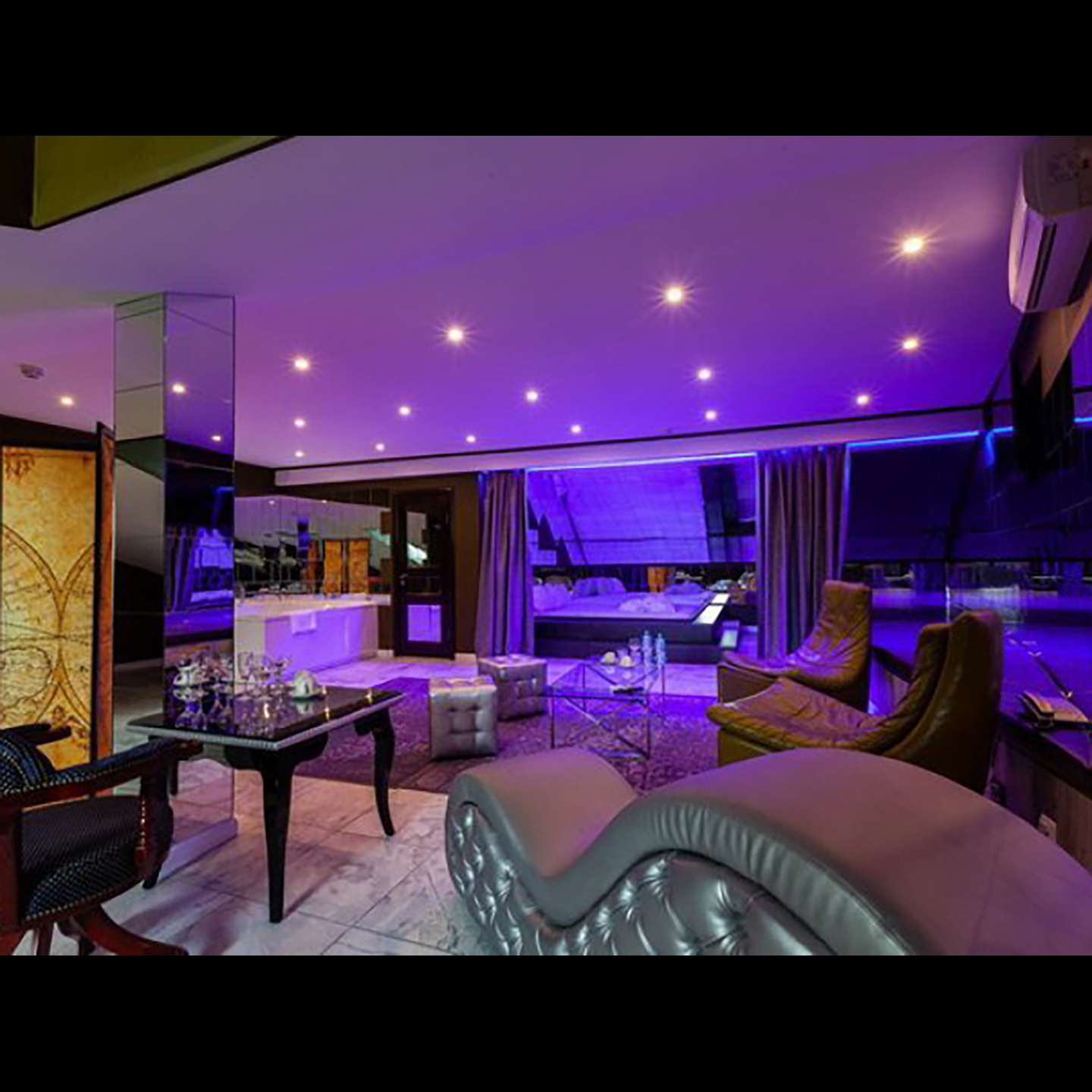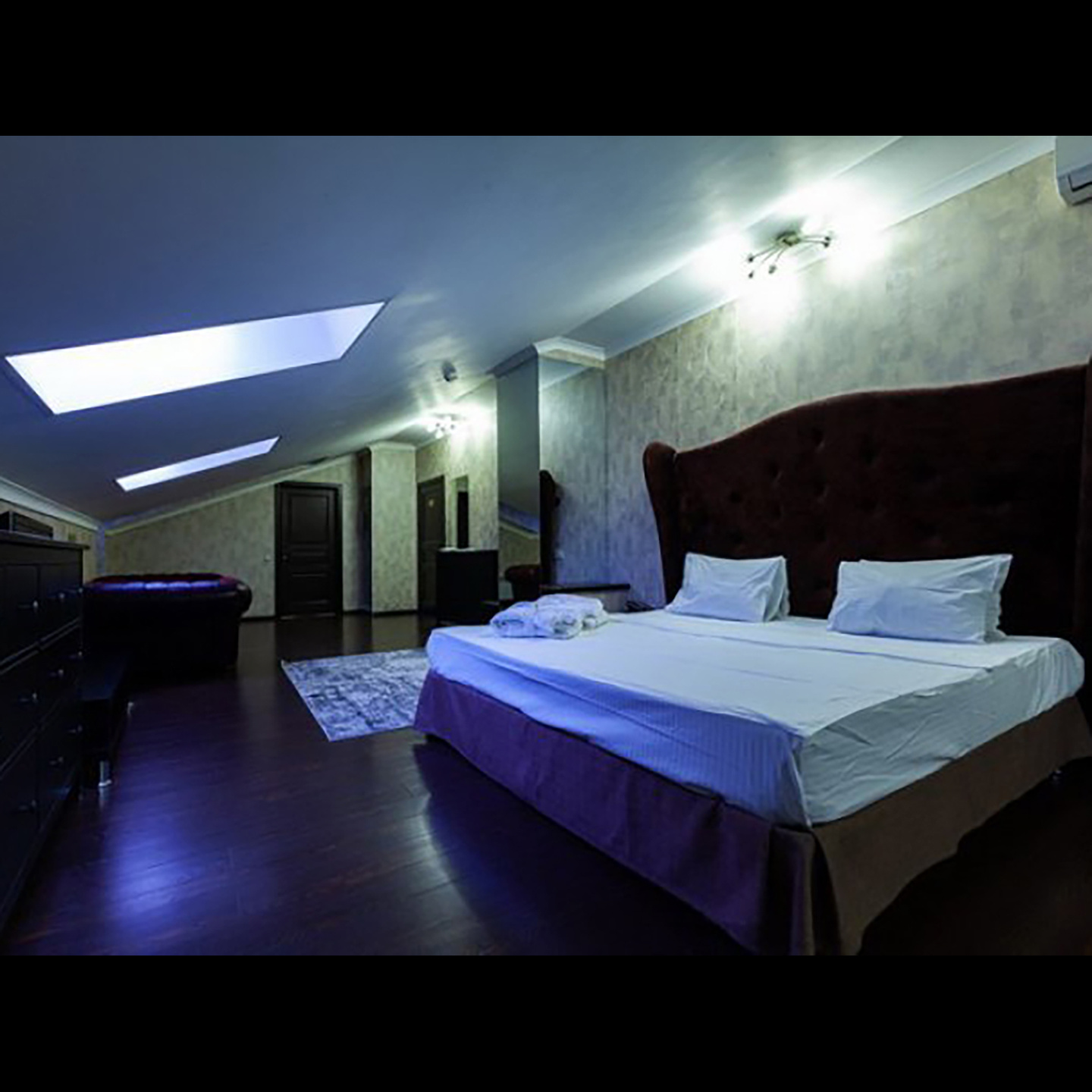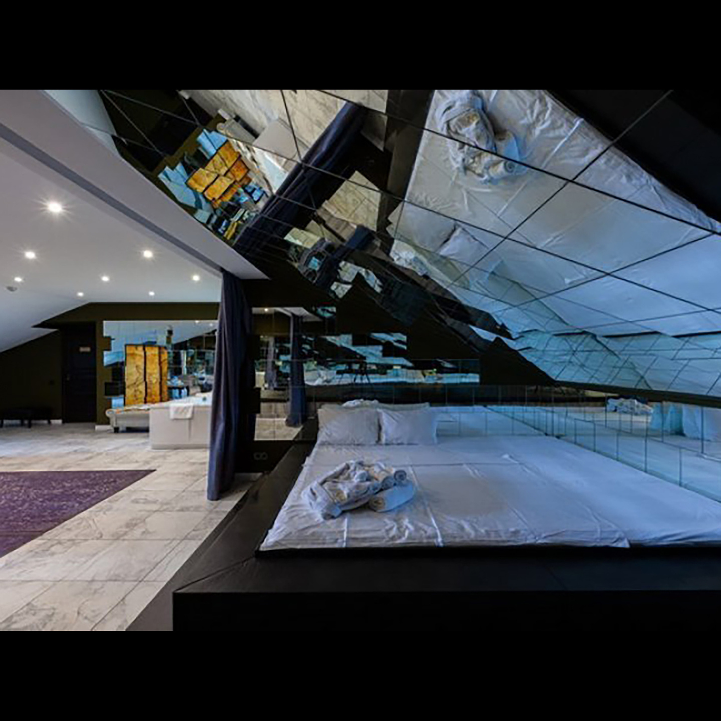 Апартаменты включают 10 помещений: 4 люкса в стиле хай-тек с прямоугольными двуспальными кроватями с кожаным изголовьем, мебелью из натуральных материалов и мансардными окнами; 2 стандарта — это вместительная комната в духе «ампир» и уютный уголок с чертами «минимализма»; 2 люкса с джакузи в разном цветовом наполнении: один в спокойной сине-голубой гамме, другой — в торжественной черно-золотой обстановке. Уникальный De Lux c освещением — имитацией звездного неба, зеркальным потолком, и английский люкс с мозаичным джакузи представлены в современном стиле «модерн» с элементами направления лофт. В каждом номере есть мини-бар. Возможно использование просторных помещений для проведения фотосессии, дружеских вечеринок и романтических свиданий влюбленных. Воспользоваться услугами отеля могут и новобрачные, роскошная мебель, мозаика и интерьерные детали в духе ампир и лучших традиций классики подарят уют и незабываемые впечатления посетителям.