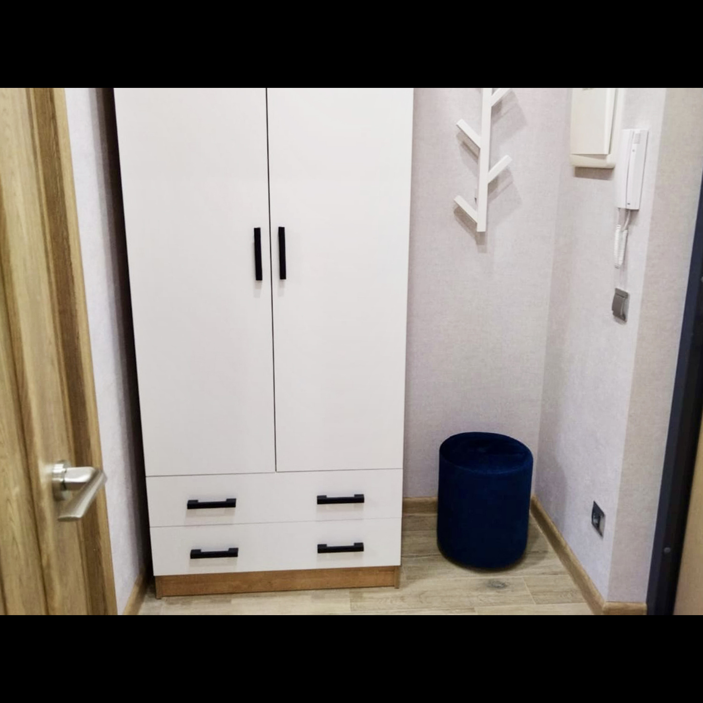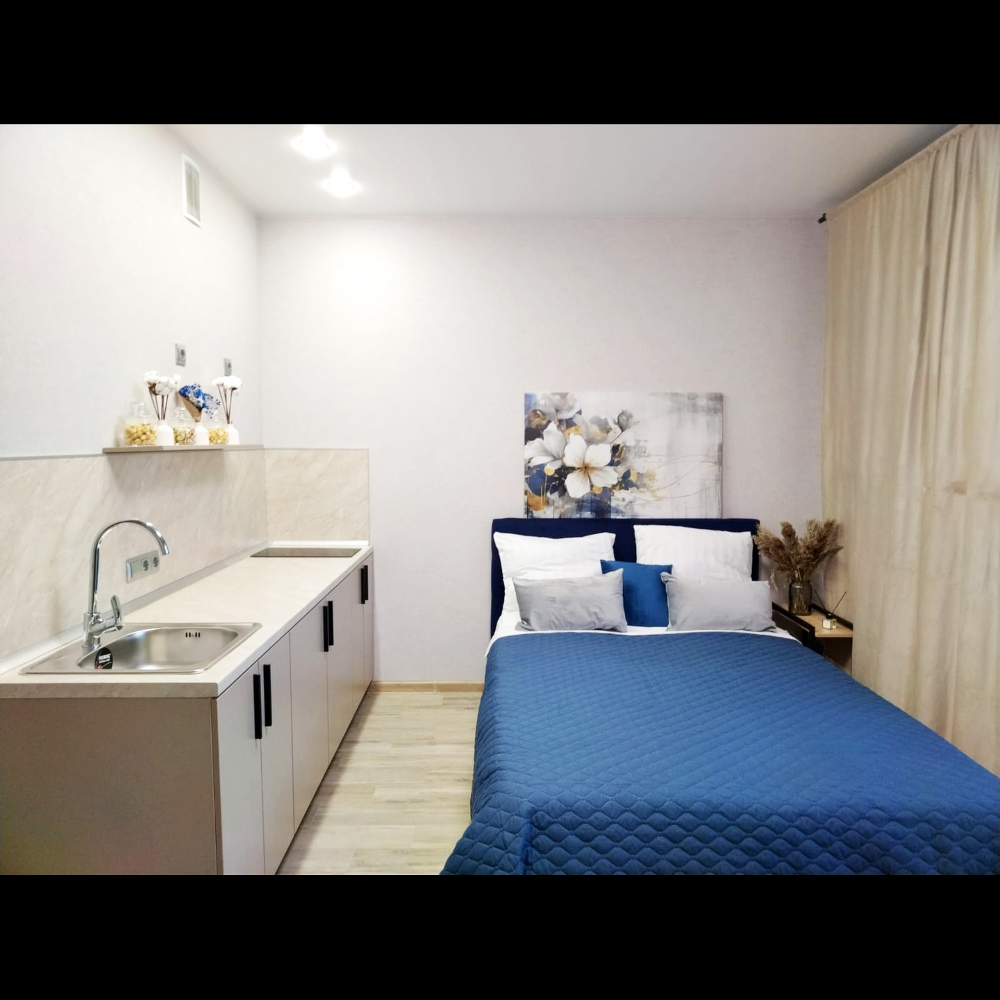 В светлой комнате объединены кухня и спальня. Кухонная зона компактная, но полностью удовлетворяет требованиям удобства и функциональности. Есть посуда для приготовления и сервировки еды и необходимая техника: варочная панель, вытяжка, небольшой холодильник, микроволновая печь, электрический чайник и мойка, а также стиральная машина. Для приемов пищи стоит обеденный стол с мягкими стульями.