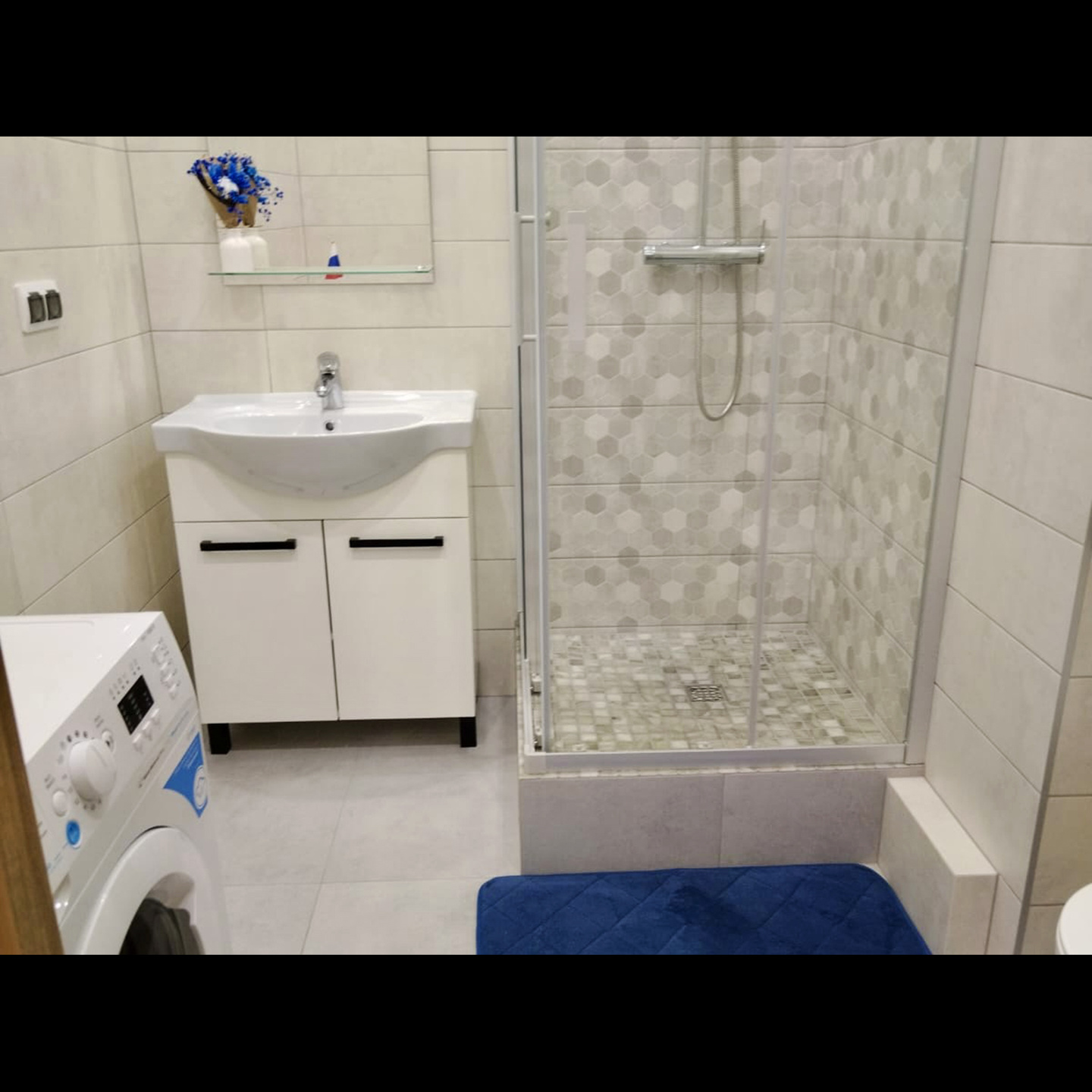 Санузел совмещенный, есть душевая кабина, косметические принадлежности, фен и комплекты полотенец.