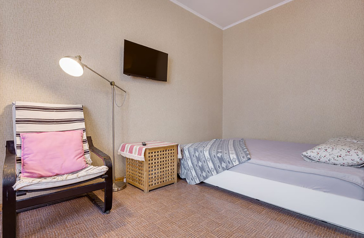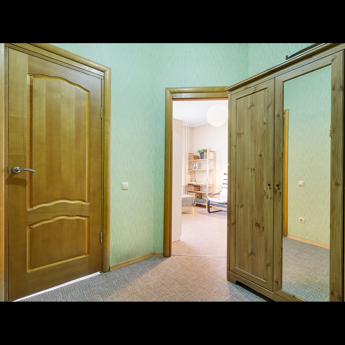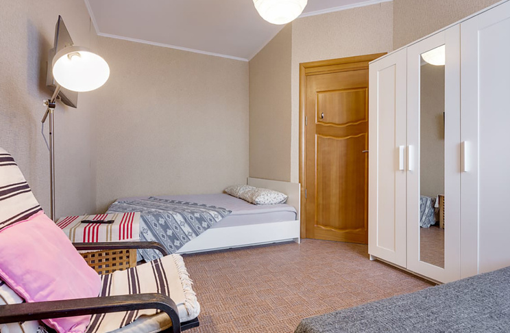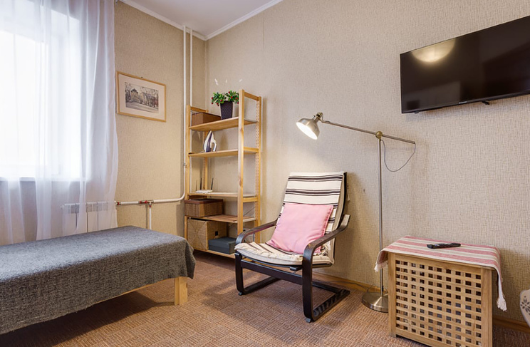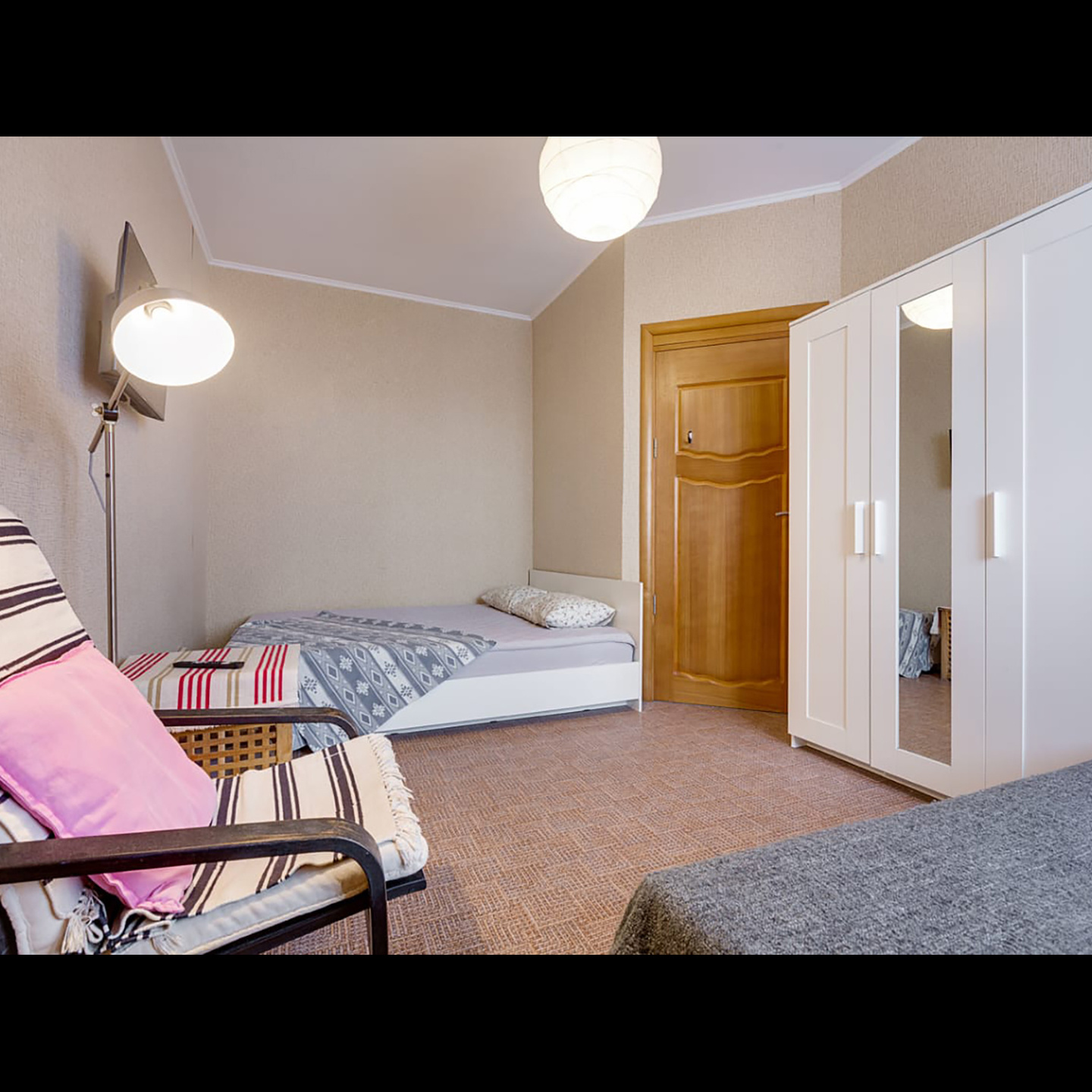 В квартире чистота и порядок, есть все необходимое для комфортного пребывания гостей. количество спальных мест может быть увеличено с двух (кровать) до четырех (кресло-кровать и полутораспальный диванчик). Для хранения одежды — платяной шкаф в комнате и гардероб с вешалками в прихожей.