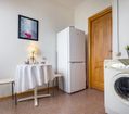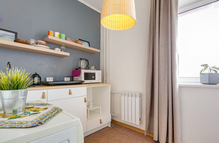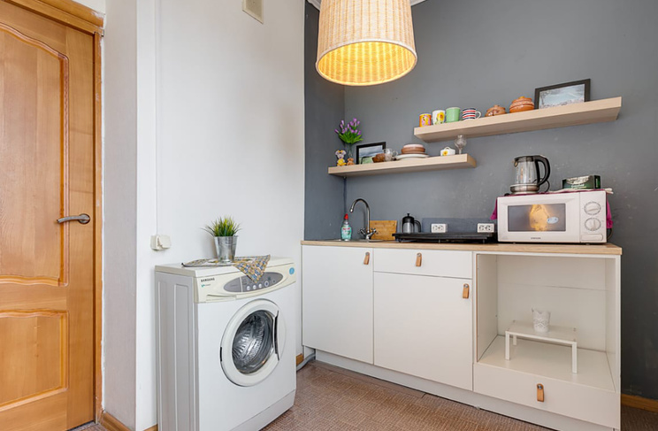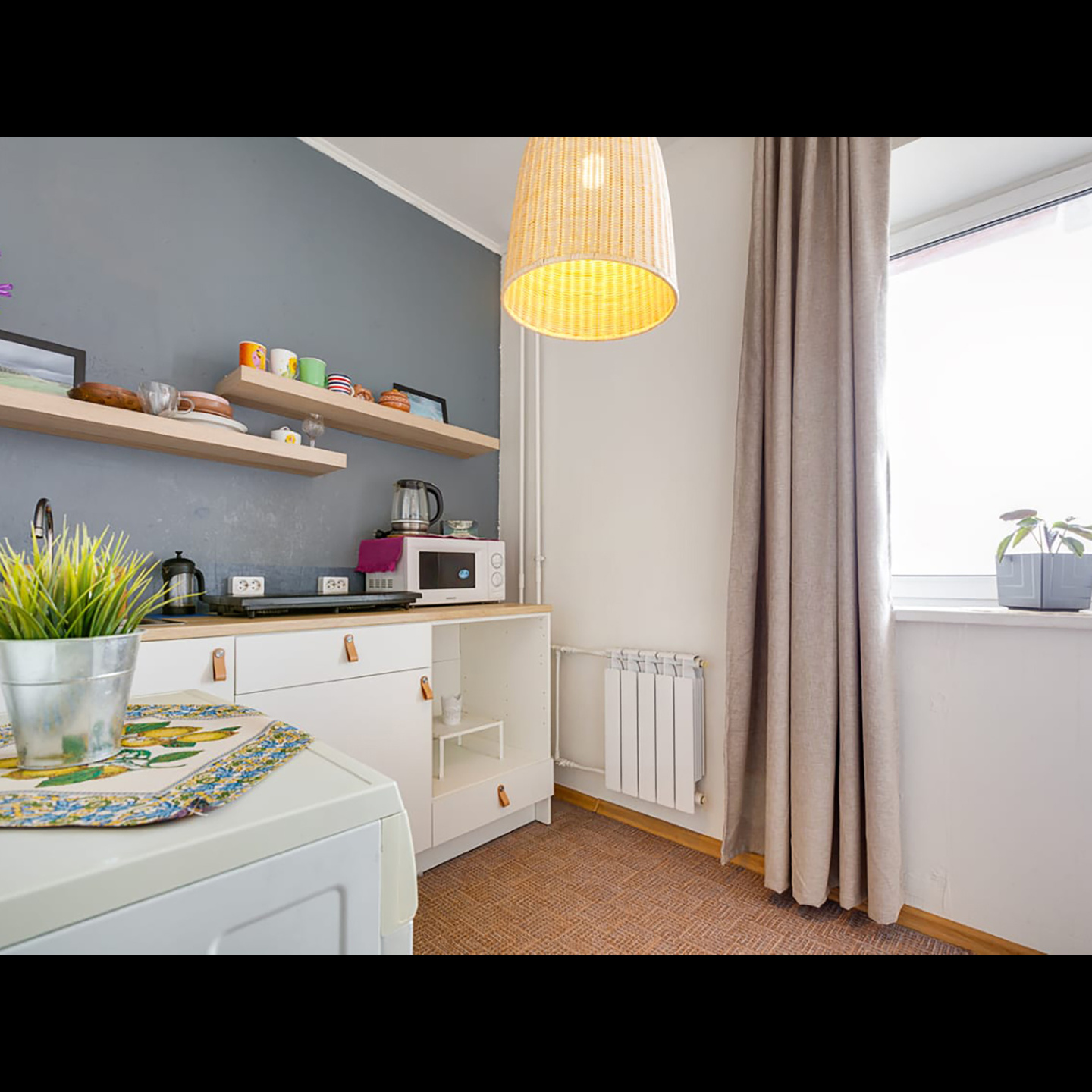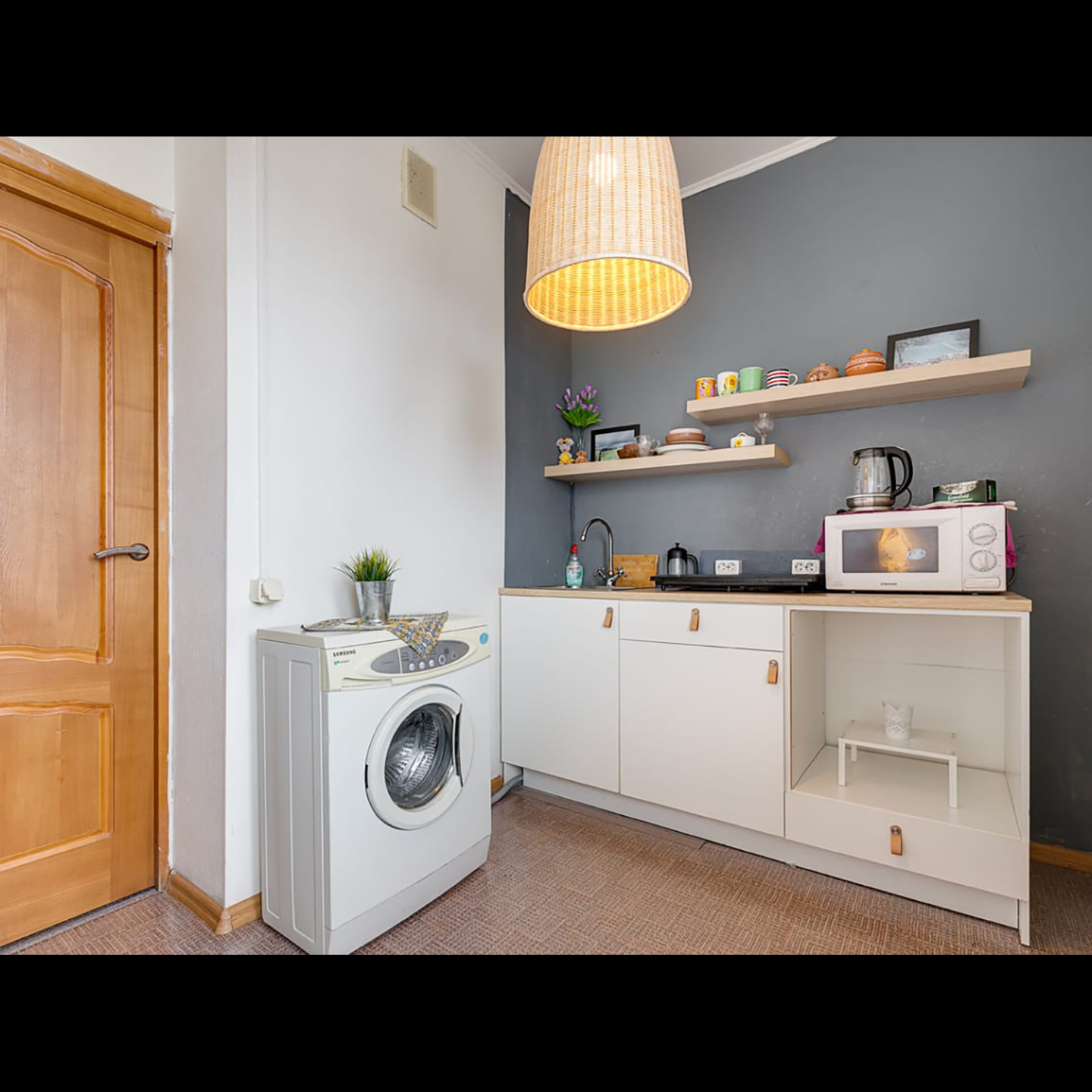 Кухонный гарнитур с бытовой техникой и посудой позволит приготовить любое блюдо и накрыть на стол. В вашем распоряжении холодильник, плита с духовкой, электрический чайник, мойка, микроволновая печь и обеденный стол со стульями.