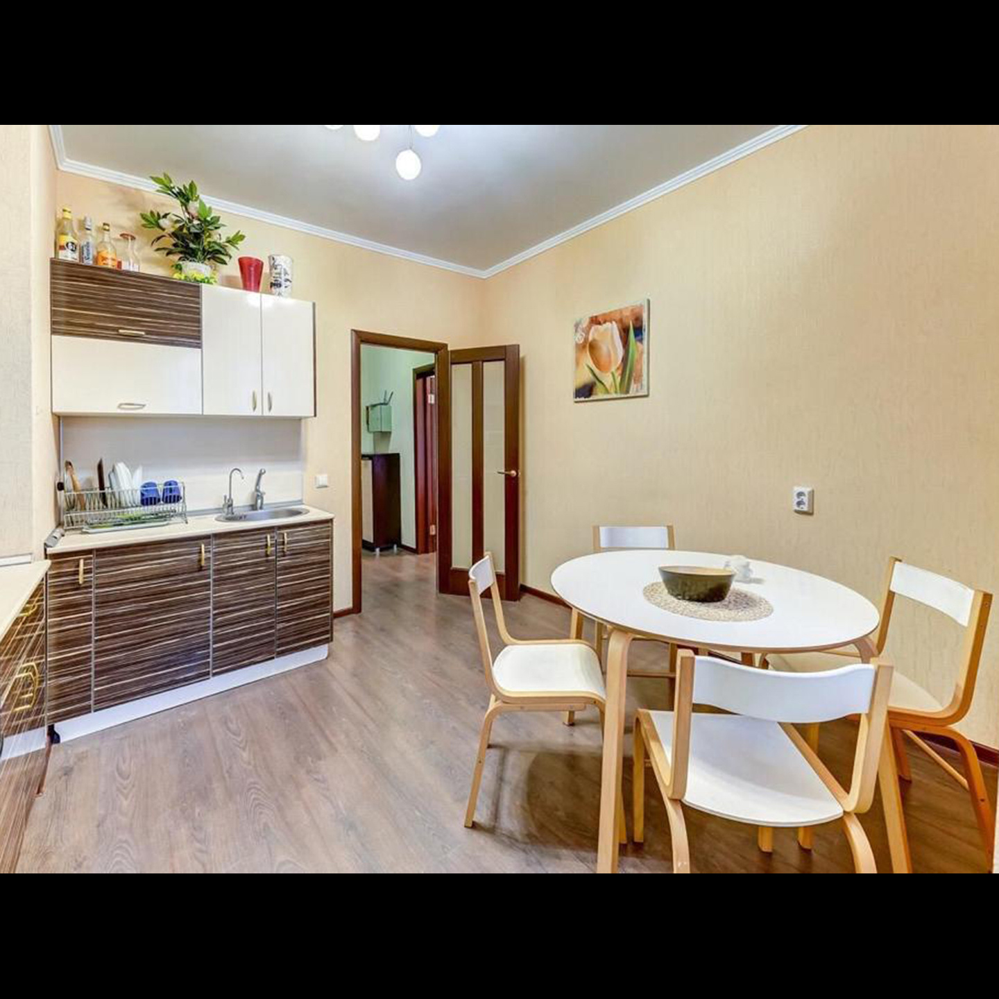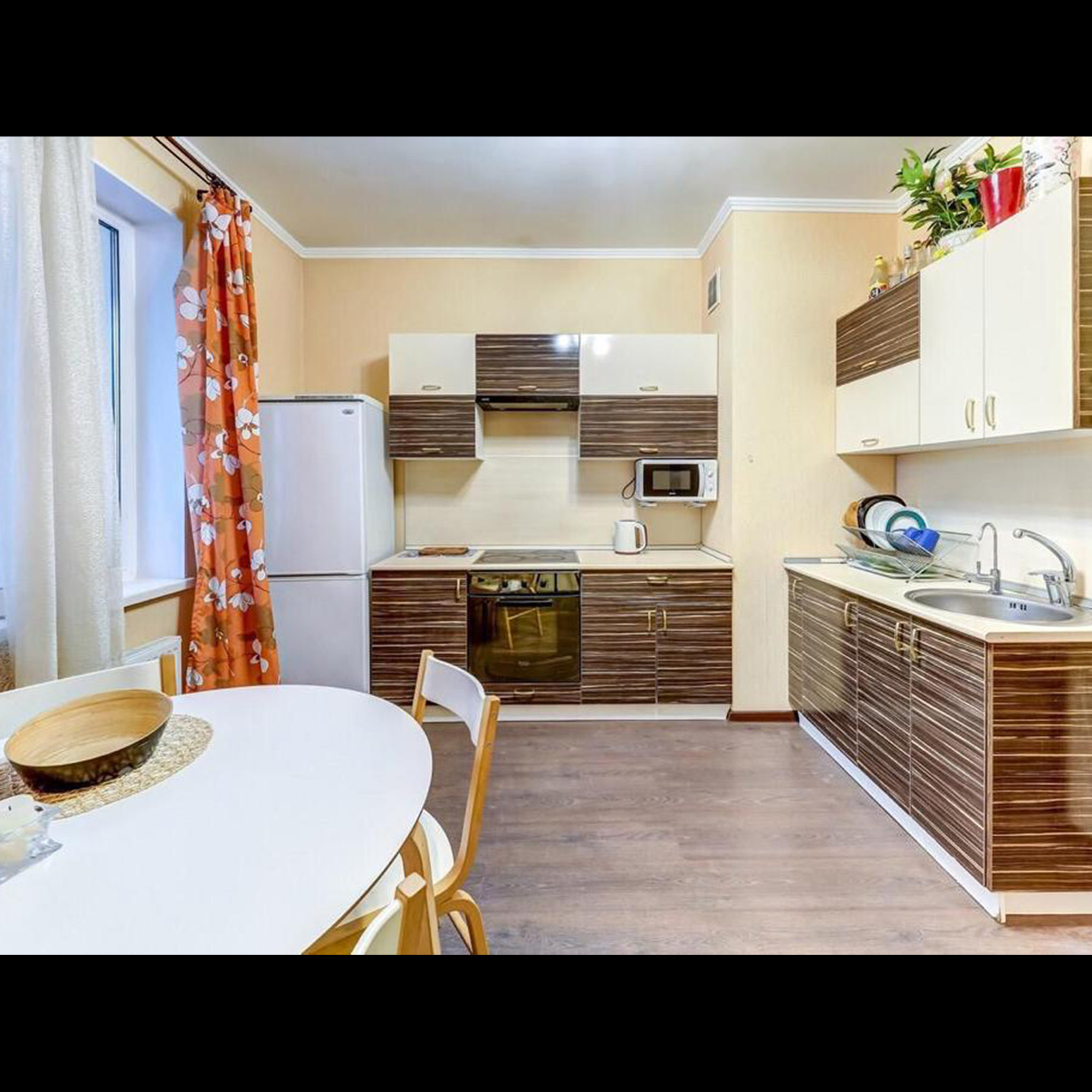 Кухонное пространство удобно спланировано. Вас ждет все необходимое: микроволновка, холодильник, посуда, а также стол со стульями, где вы сможете устроить романтический ужин или чаепитие.