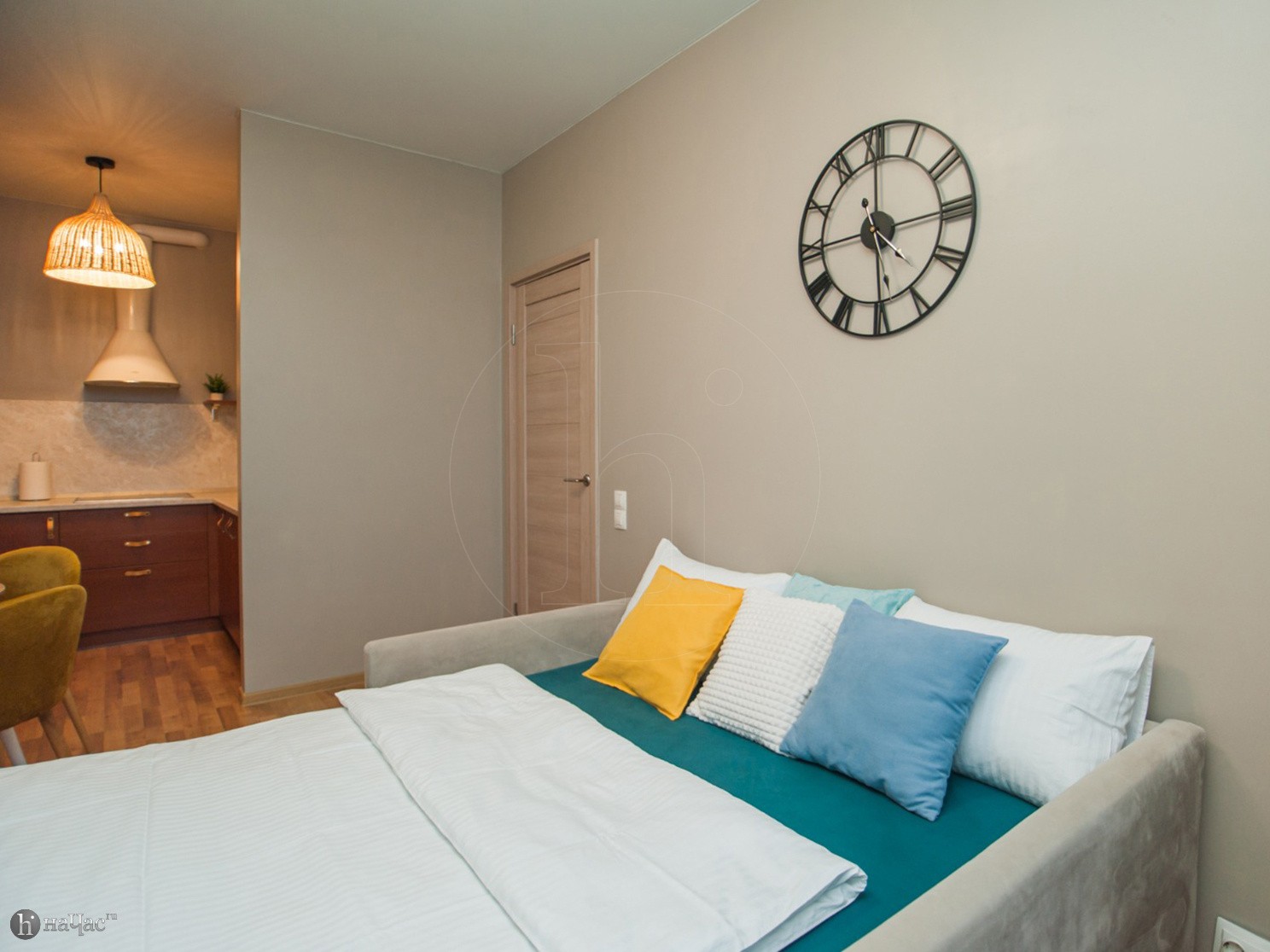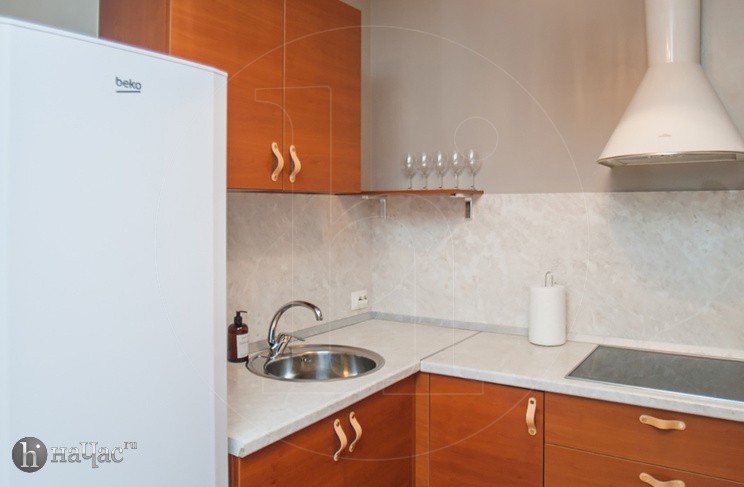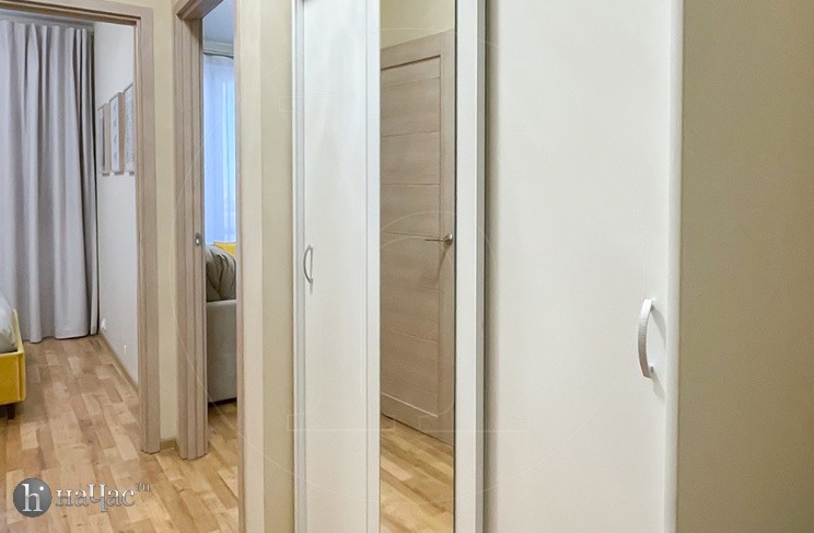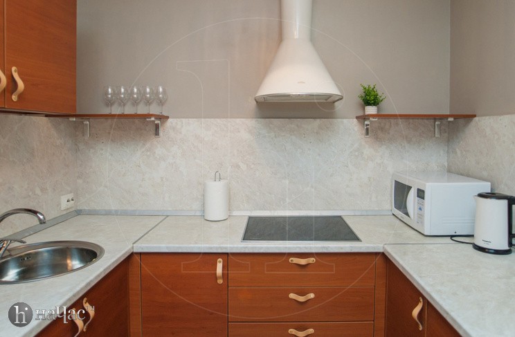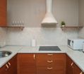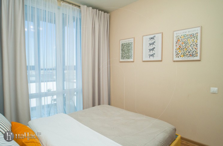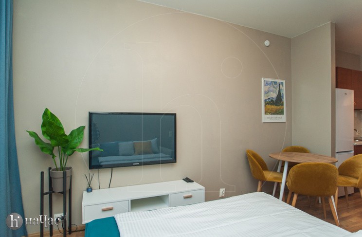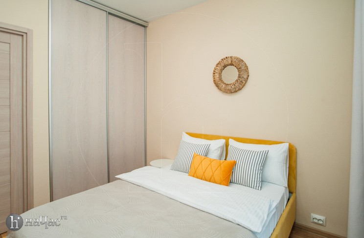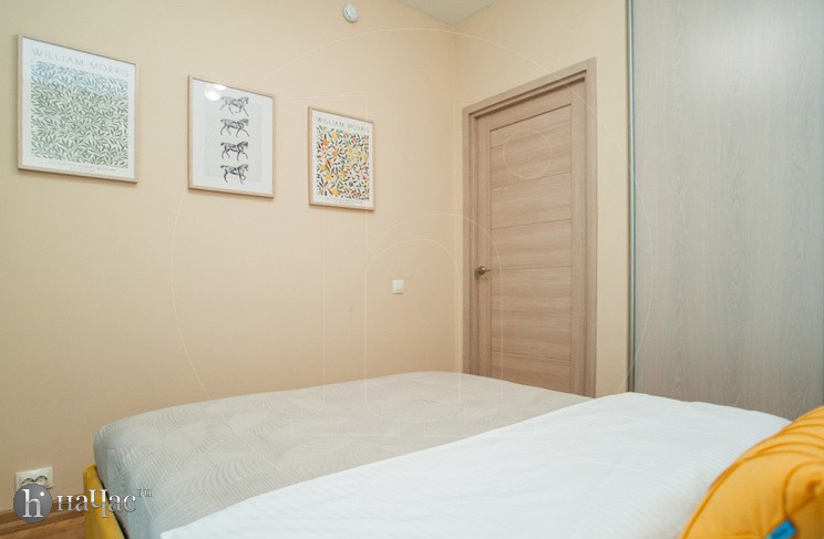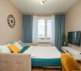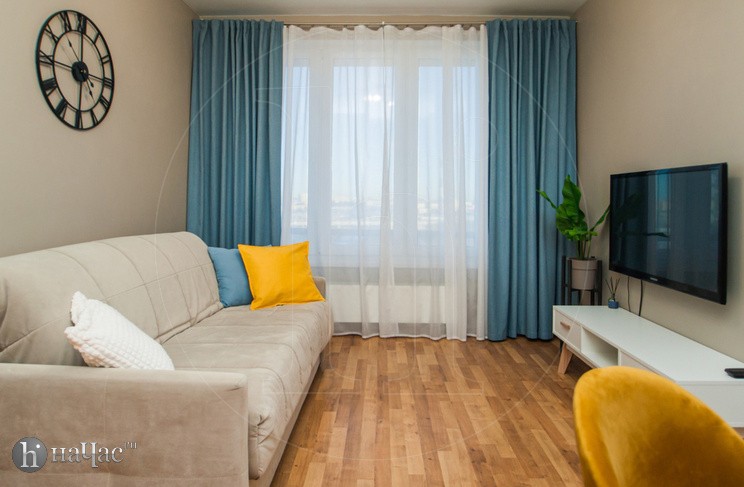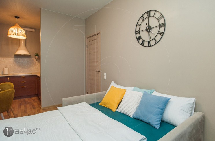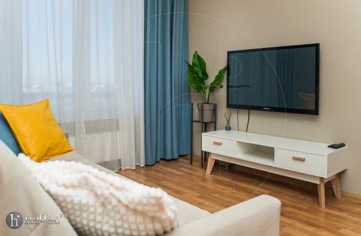 Квартира оформлена в современном минималистичном дизайне. В гостиной находится удобный, мягкий диван и ЖК телевизор. Постояльцы могут с комфортом отдохнуть на удобной двухспальной кровати с ортопедическим матрасом. В гостиной имеется комфортная рабочая зона.