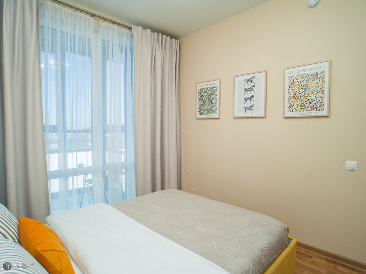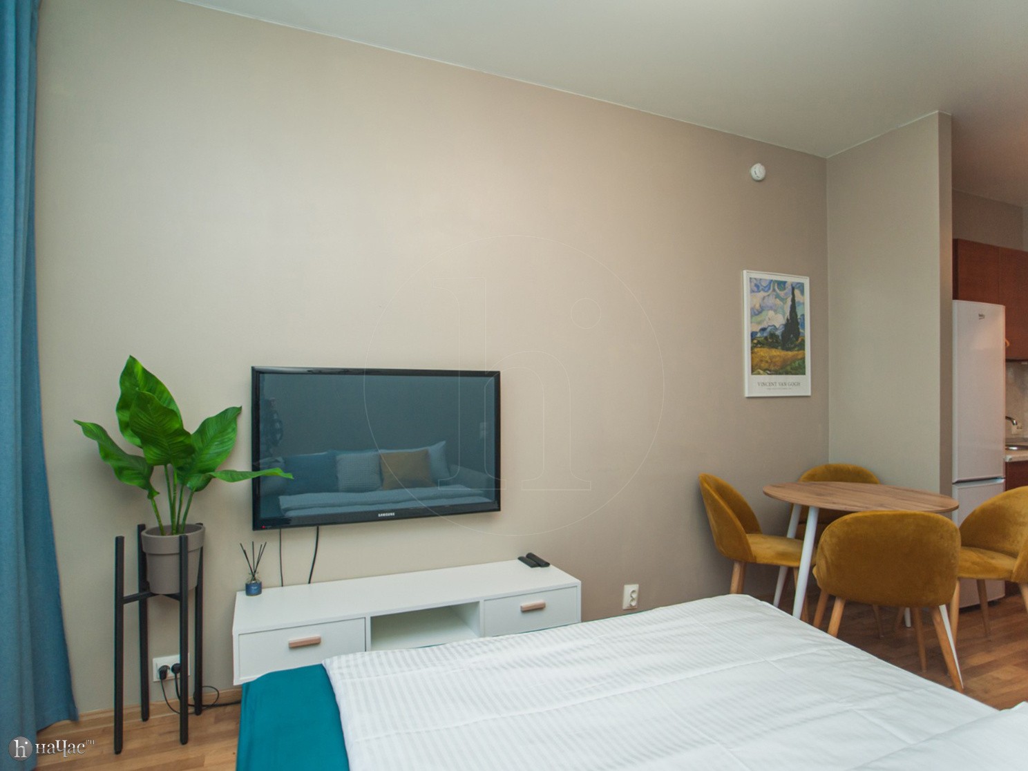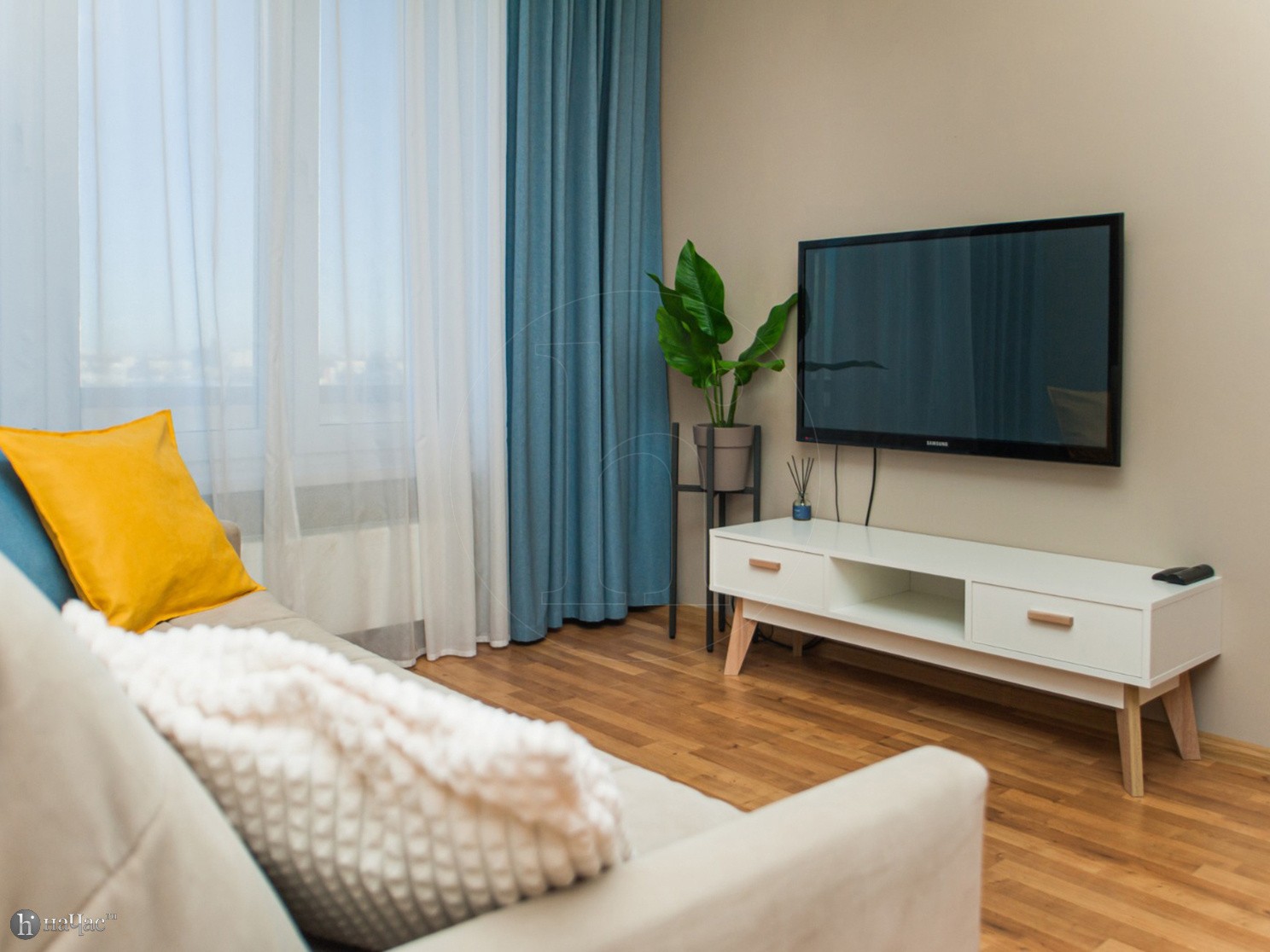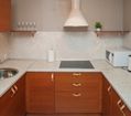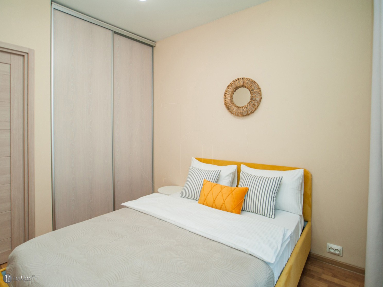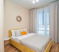 Квартира оформлена в современном минималистичном дизайне. В гостиной находится удобный, мягкий диван и ЖК телевизор. Постояльцы могут с комфортом отдохнуть на удобной двухспальной кровати с ортопедическим матрасом. В гостиной имеется комфортная рабочая зона.