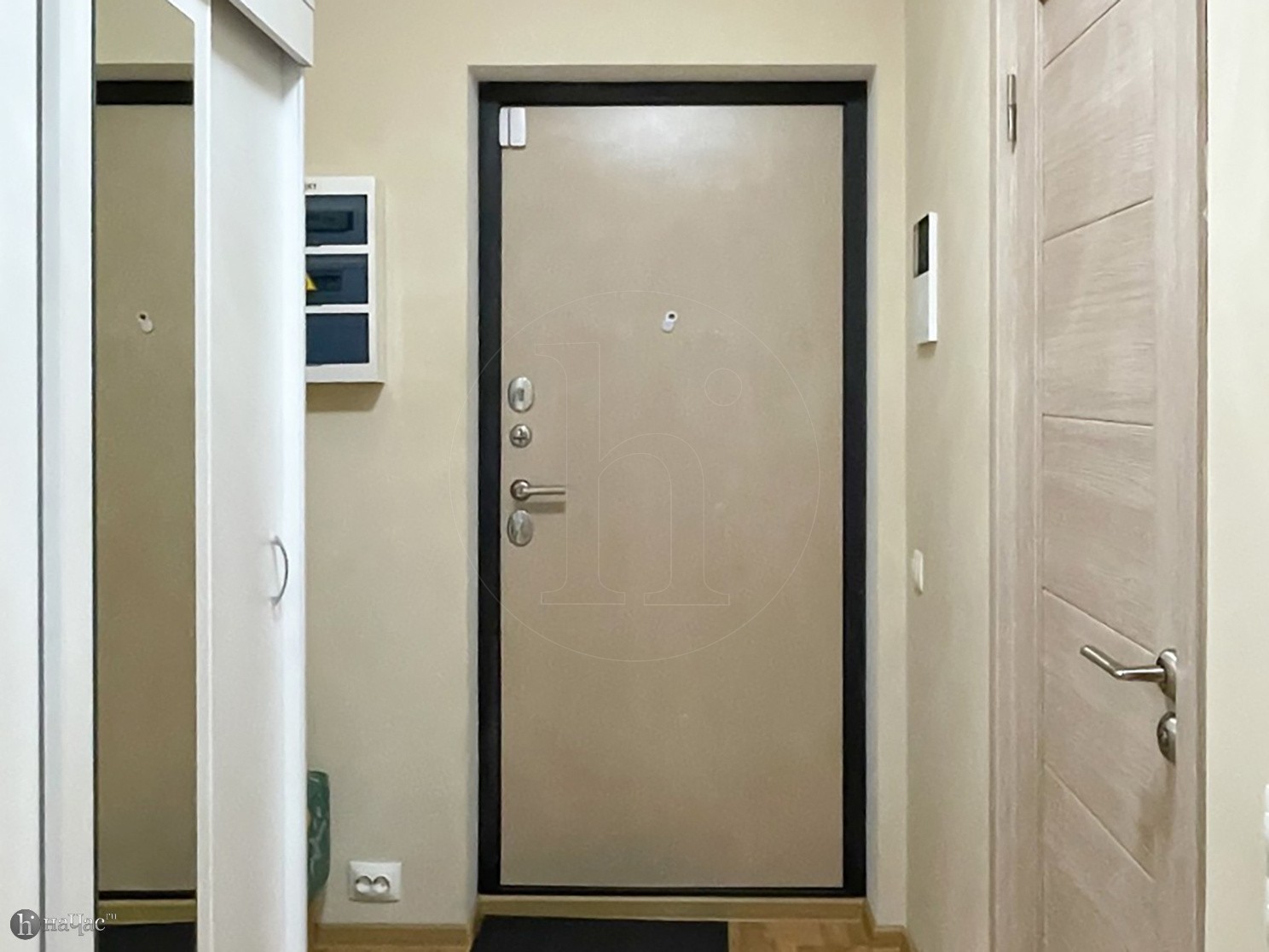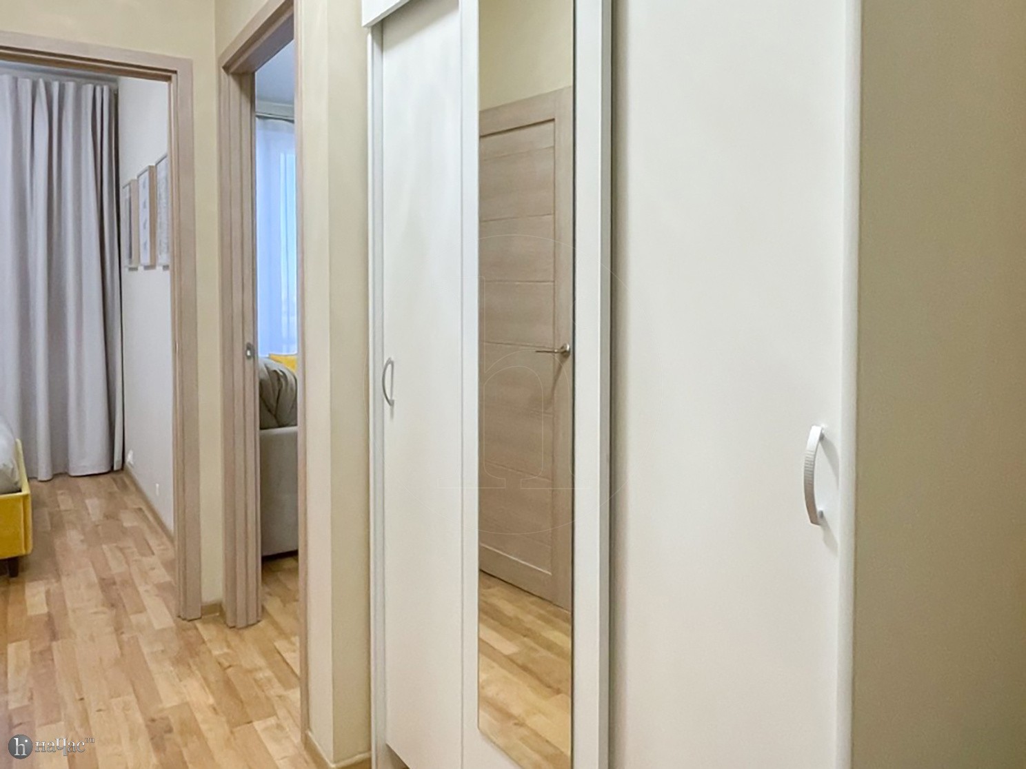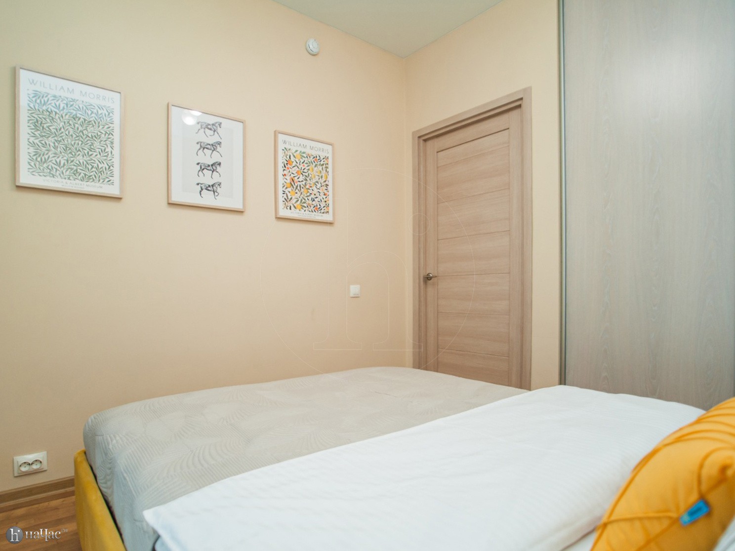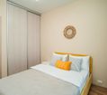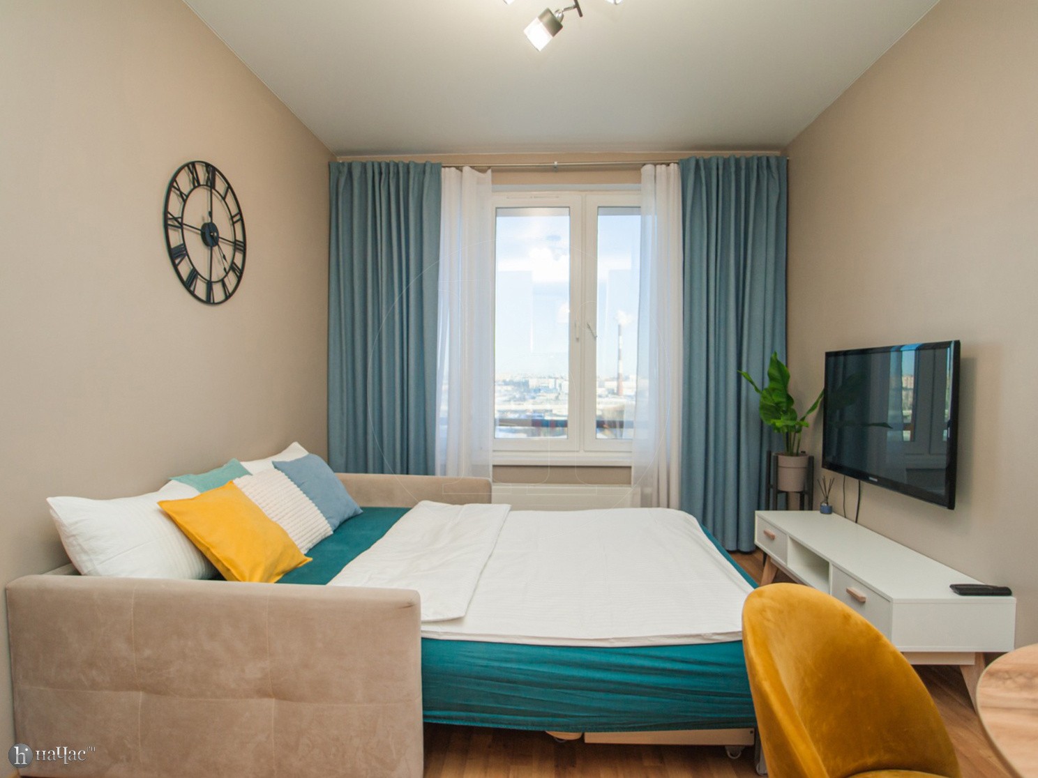 Квартира оформлена в современном минималистичном дизайне. В гостиной находится удобный, мягкий диван и ЖК телевизор. Постояльцы могут с комфортом отдохнуть на удобной двухспальной кровати с ортопедическим матрасом. В гостиной имеется комфортная рабочая зона.