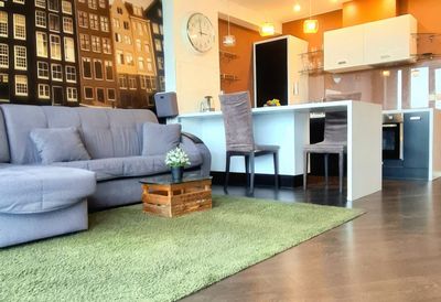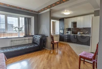 Большая гостиная с плавно перетекающей в нее кухней создает ощущение простора. Панорамные окна наполняют пространство светом, а продуманная планировка позволяет с легкостью разместить и зону для отдыха, и обеденный стол, и рабочее место. Кухня оборудована всем необходимым — здесь есть техника, удобная мебель и достаточно места, чтобы экспериментировать с рецептами или просто наслаждаться утренним кофе в приятной атмосфере.