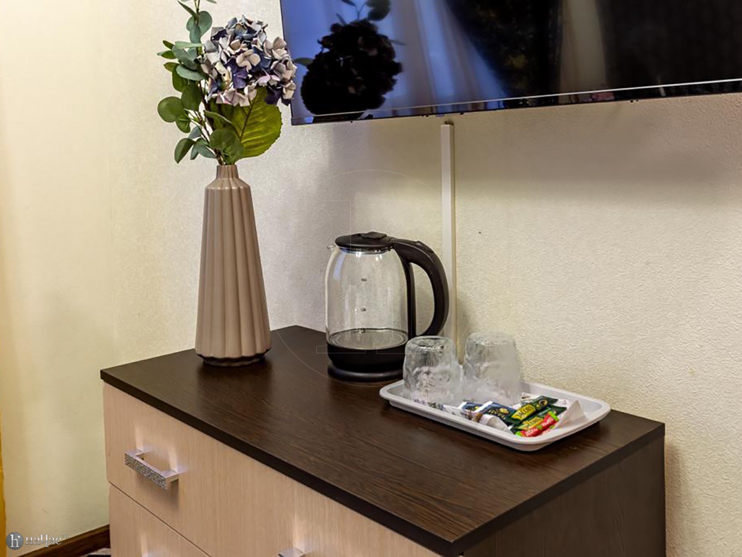 Во всех номерах есть косметические принадлежности, шапочка для душа, зубные наборы, тапочки, полотенца, чай, кофе, сахар. Халаты (за доп. плату 100 руб.).